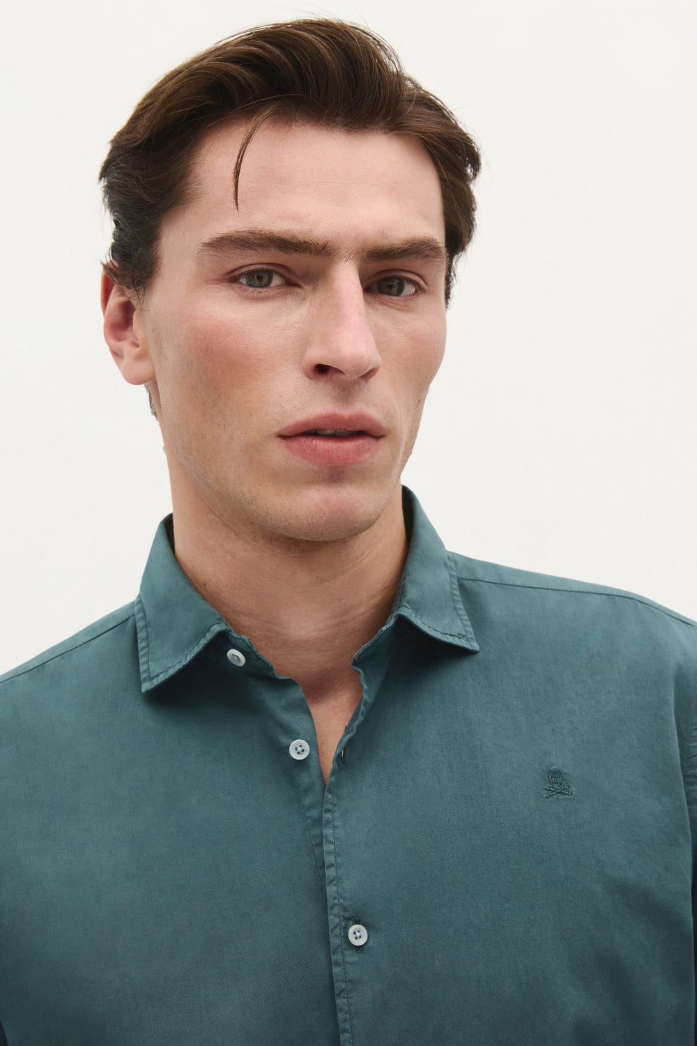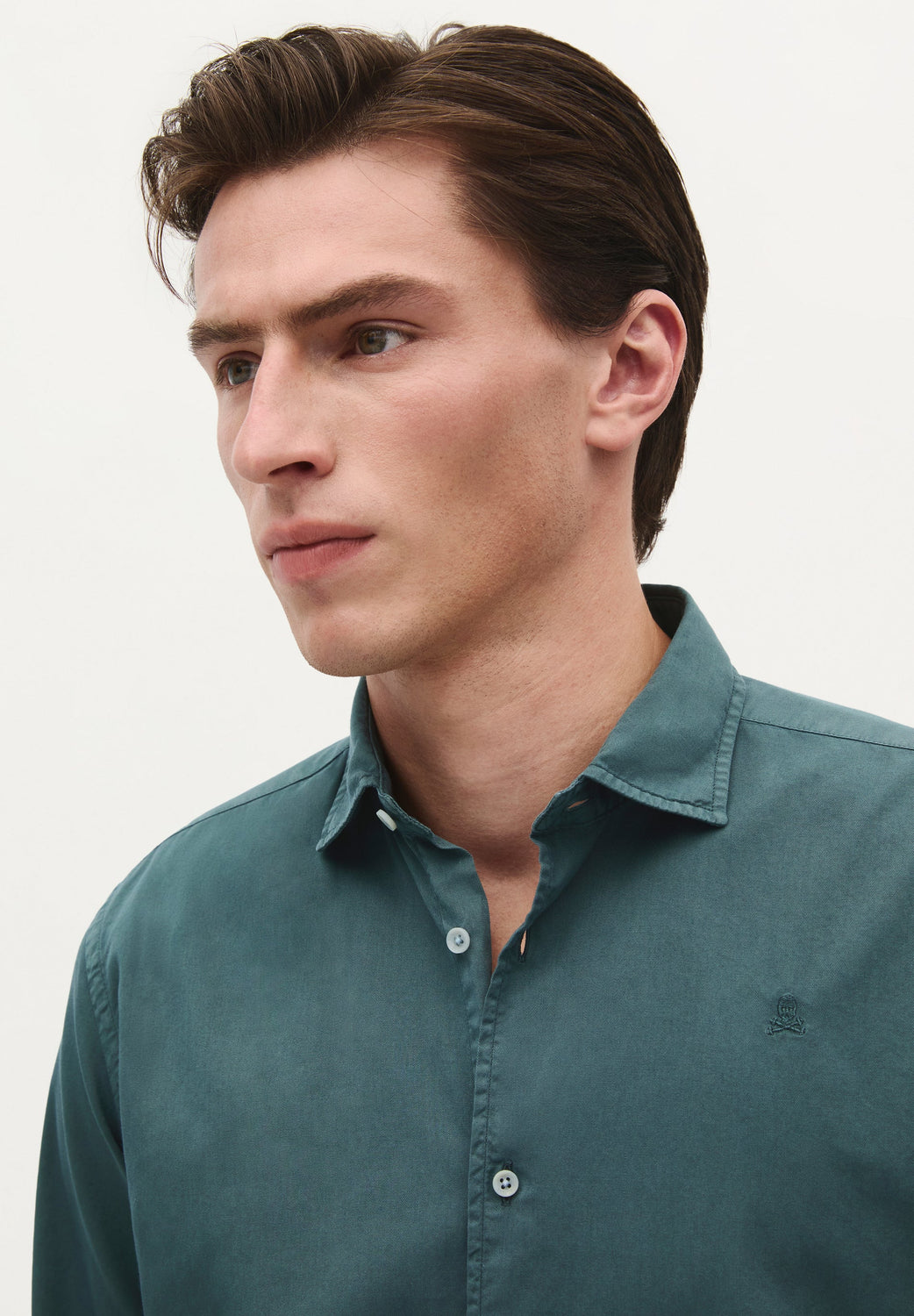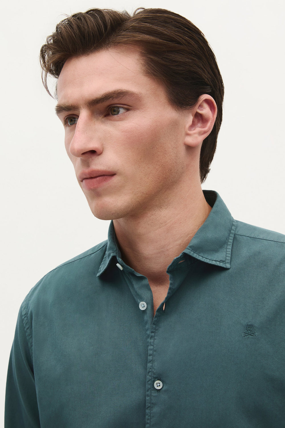 Camisa confeccionada en 100% algodón. Regular fit, cuello clásico y cierre con botones. Manga larga terminada en puño con botones y calavera bordada a tono.