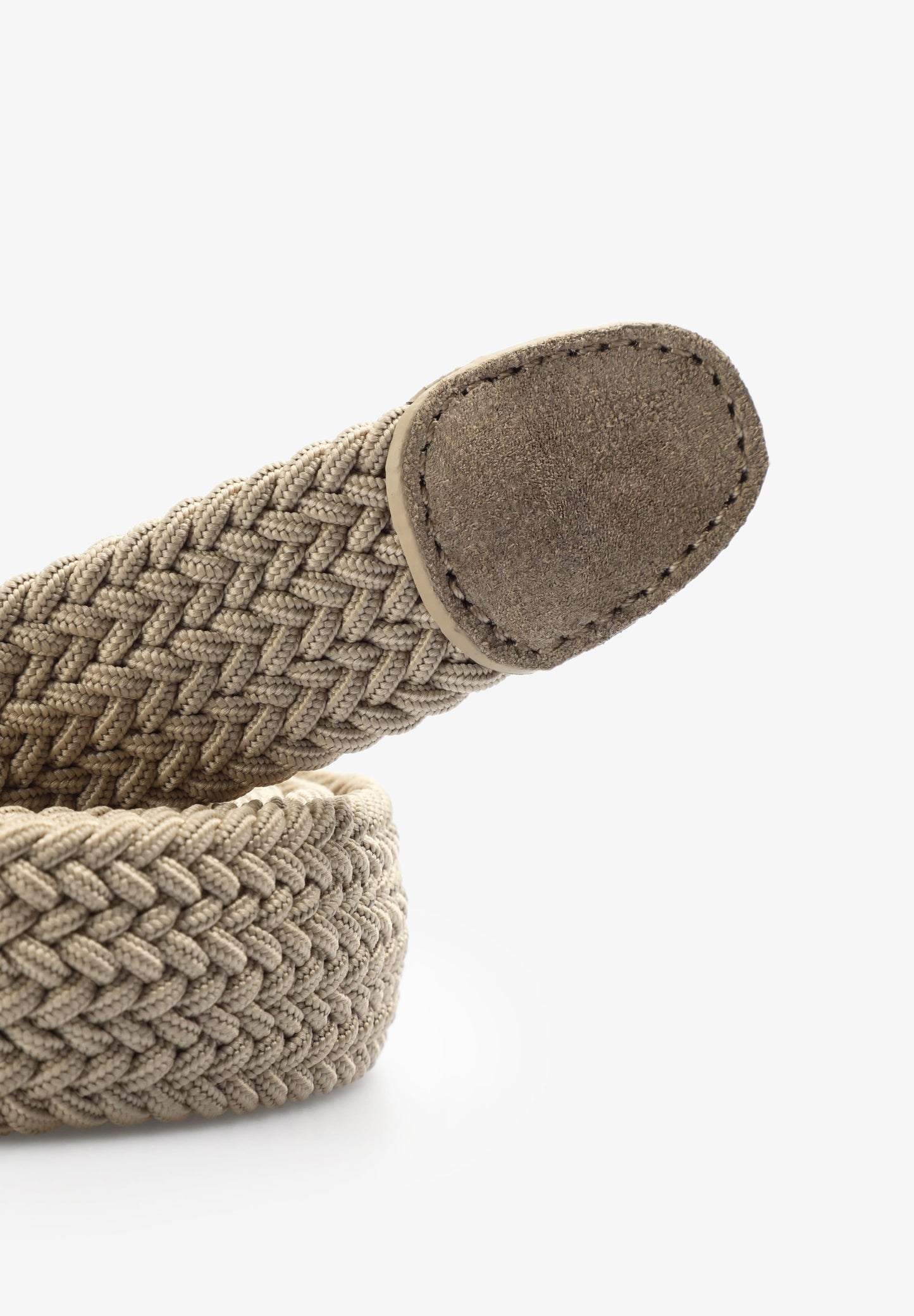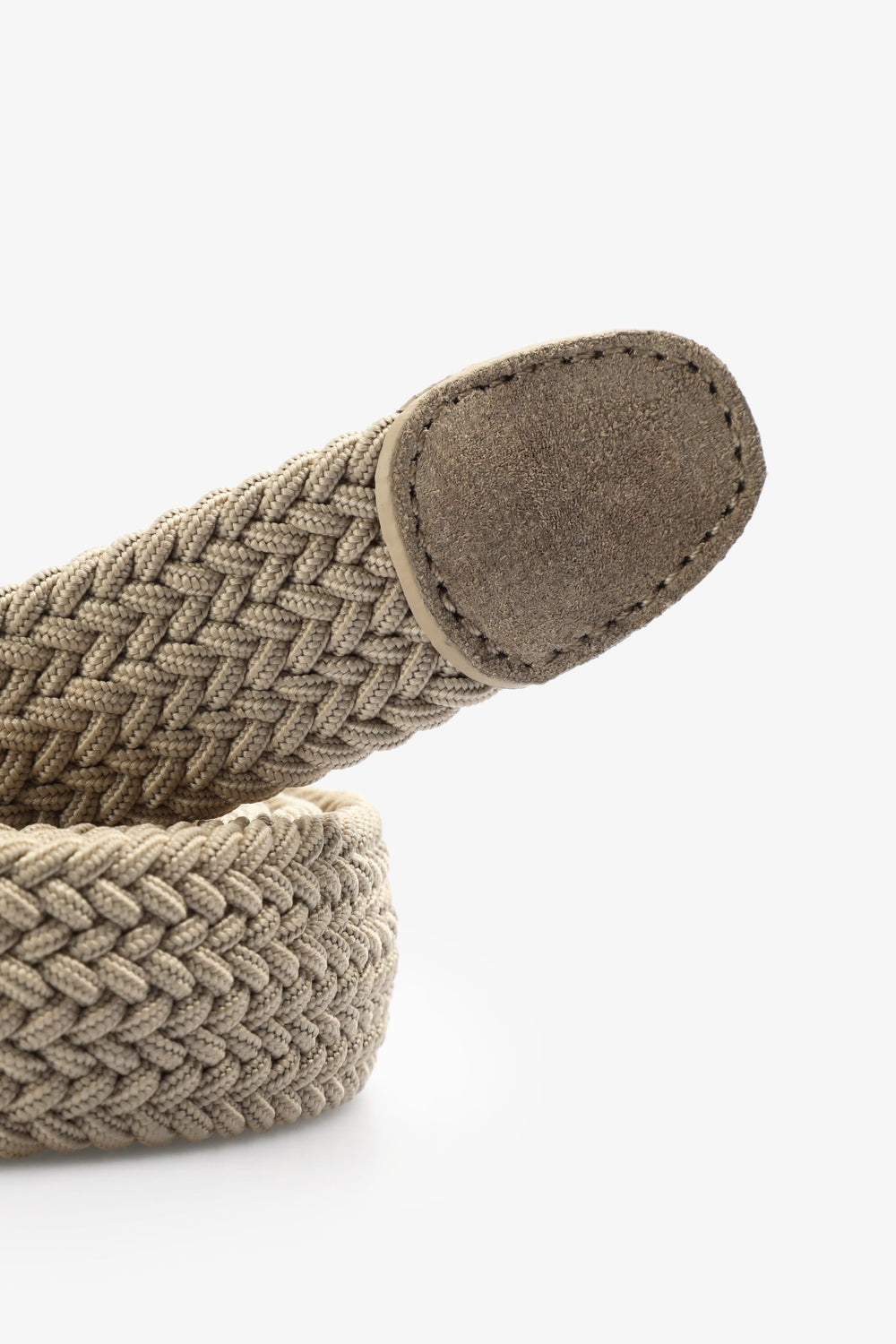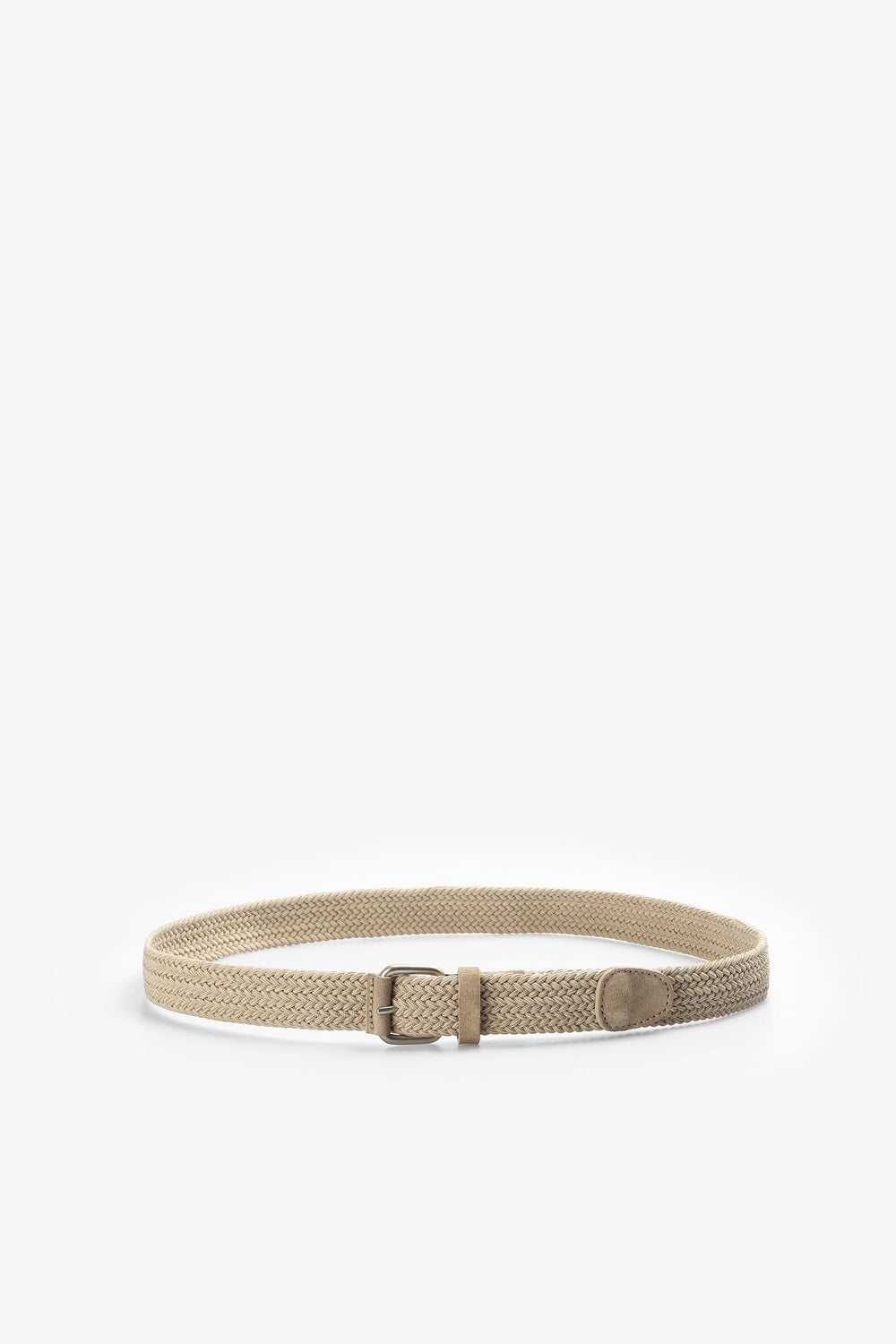 Cinturón confeccionado en material ligeramente elástico trenzado con detalles en piel. Cierre con hebilla metálica.