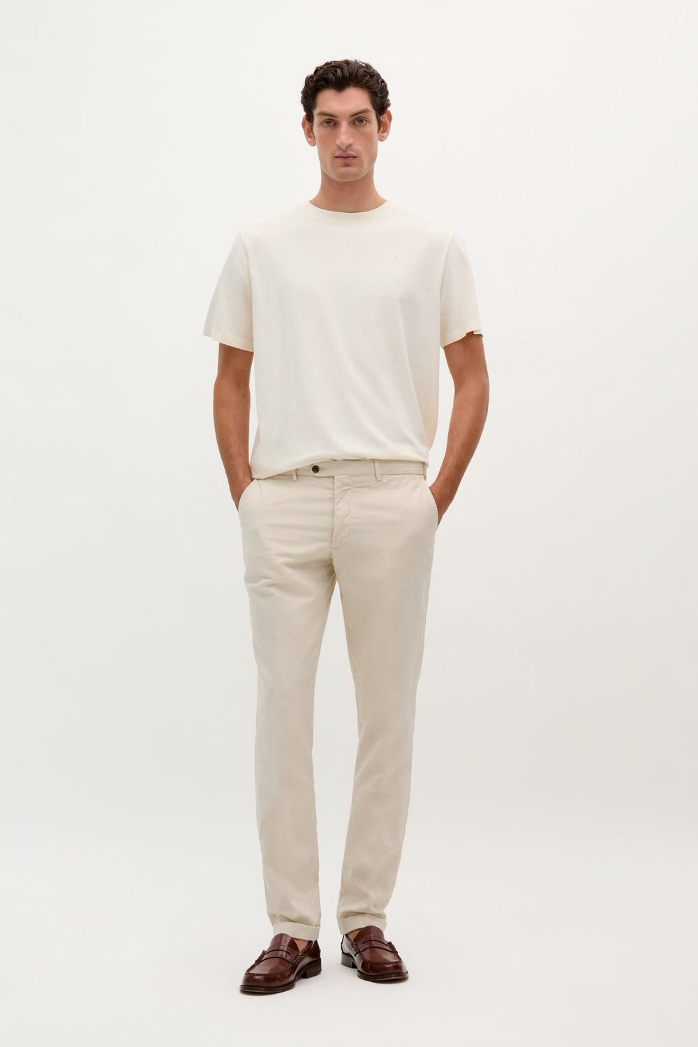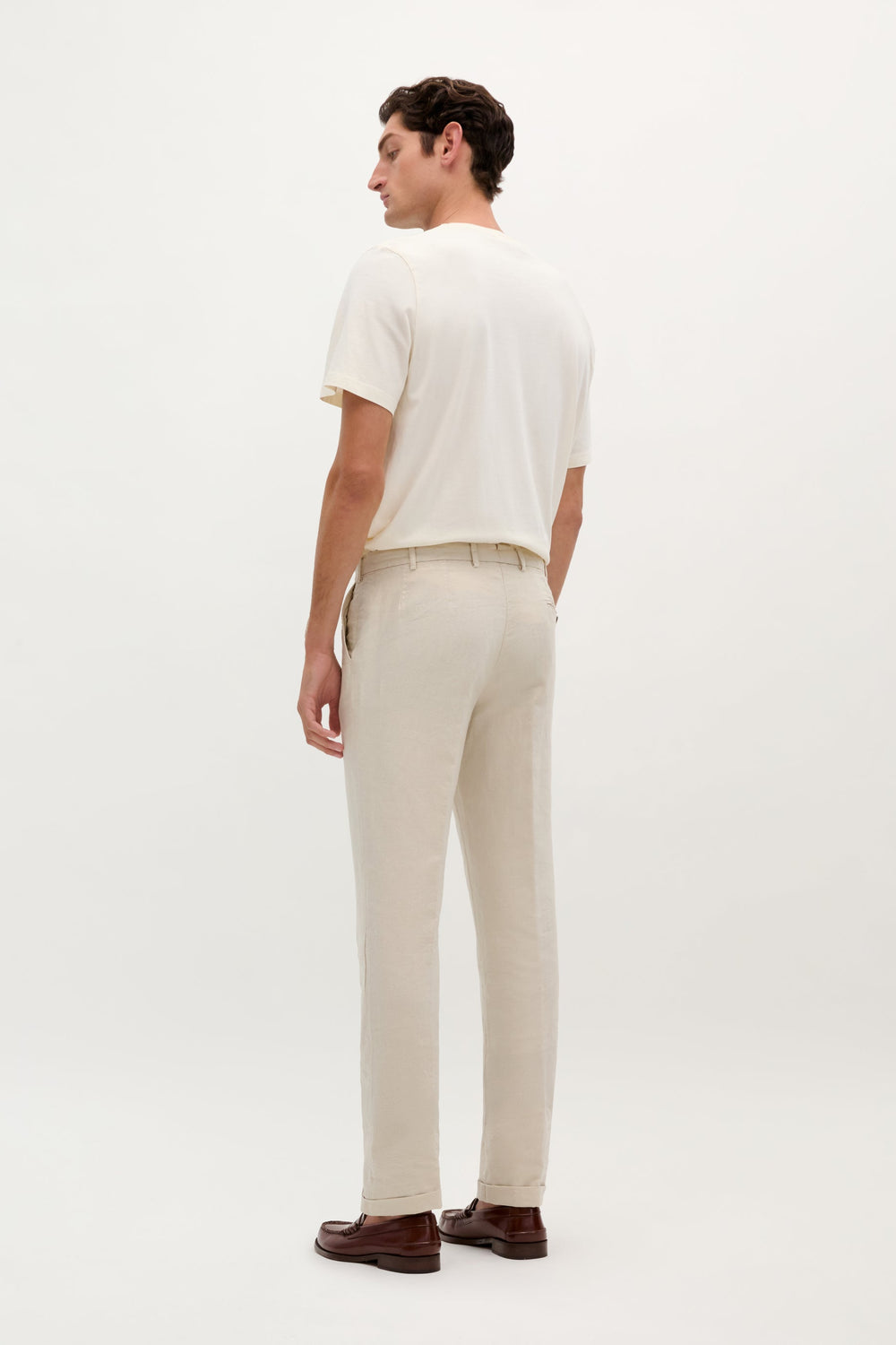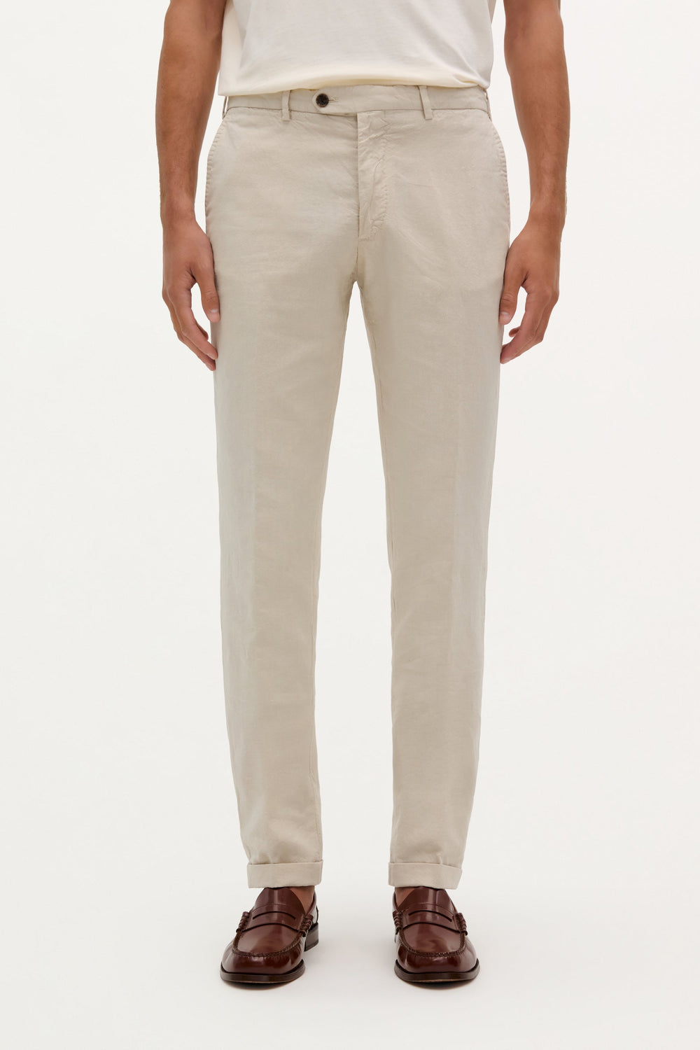 Pantalón de traje confeccionado en mezcla de algodón y lino. Cierre con cremallera y botón prolongado en cintura. Bolsillos inclinados delanteros y trasero con botón.