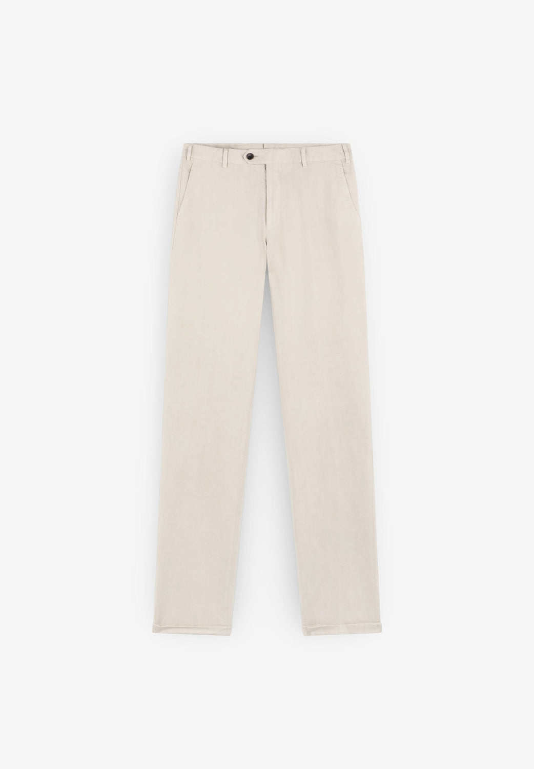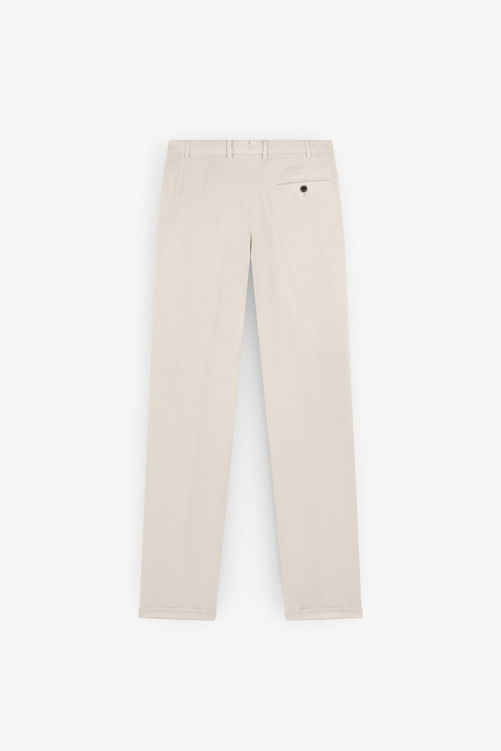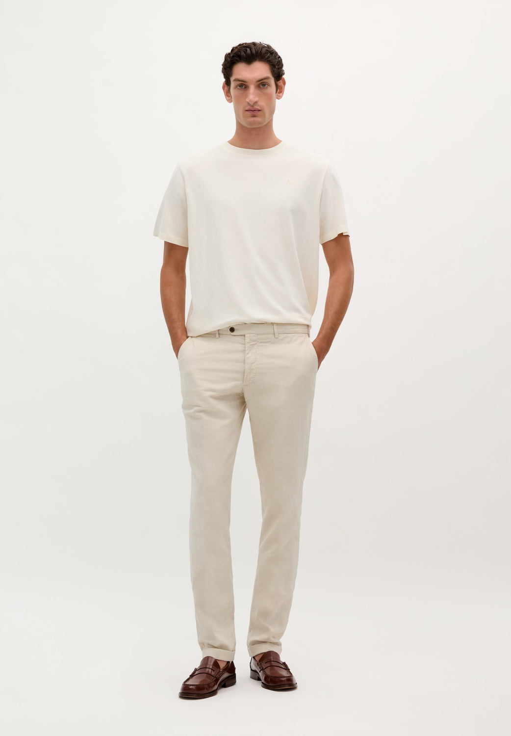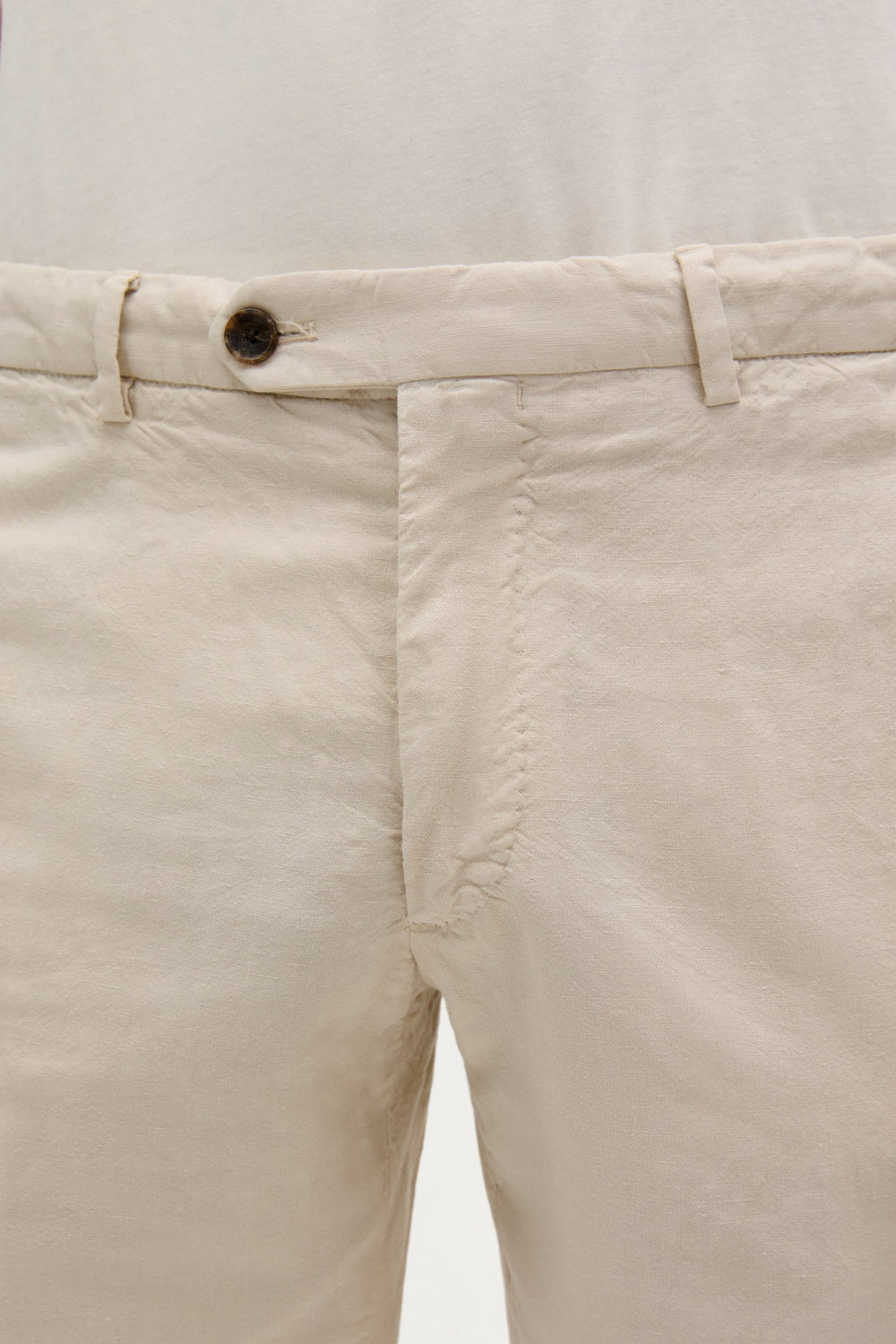 Pantalón de traje confeccionado en mezcla de algodón y lino. Cierre con cremallera y botón prolongado en cintura. Bolsillos inclinados delanteros y trasero con botón.