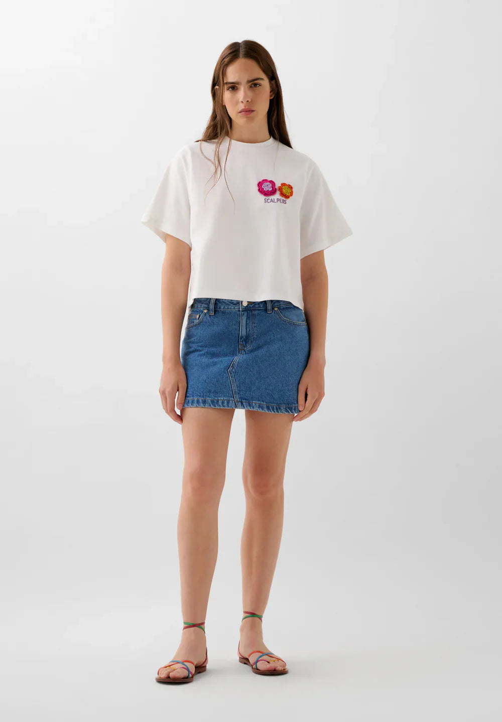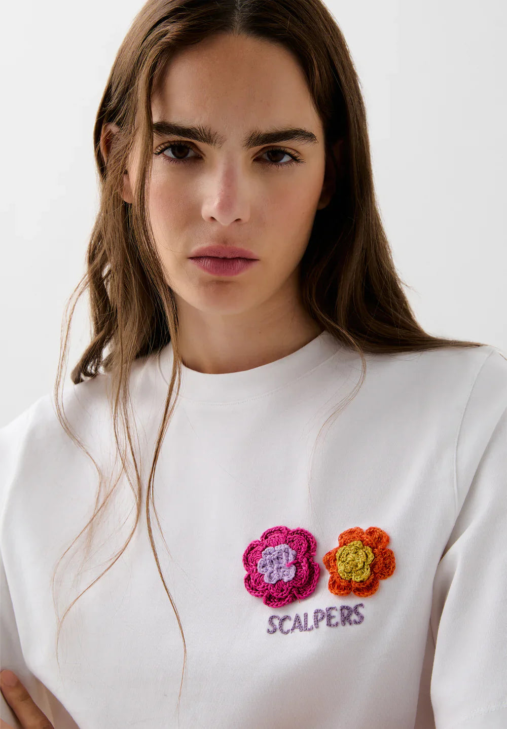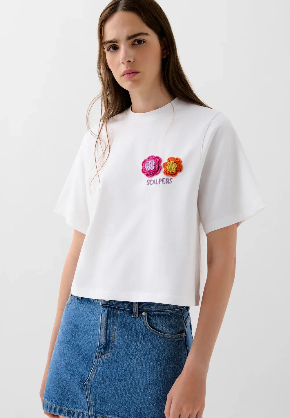 Camiseta confeccionada en 100% algodón con detalle de crochet y logo bordado en pecho. Corte ligeramente oversize, cuello redondo y manga corta ancha.