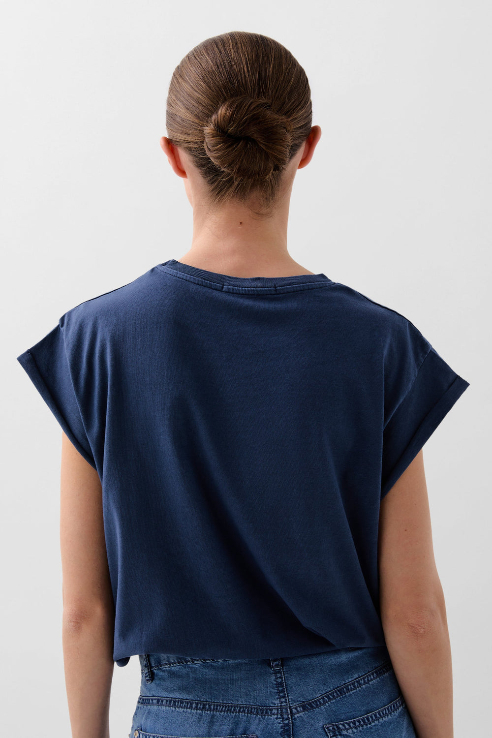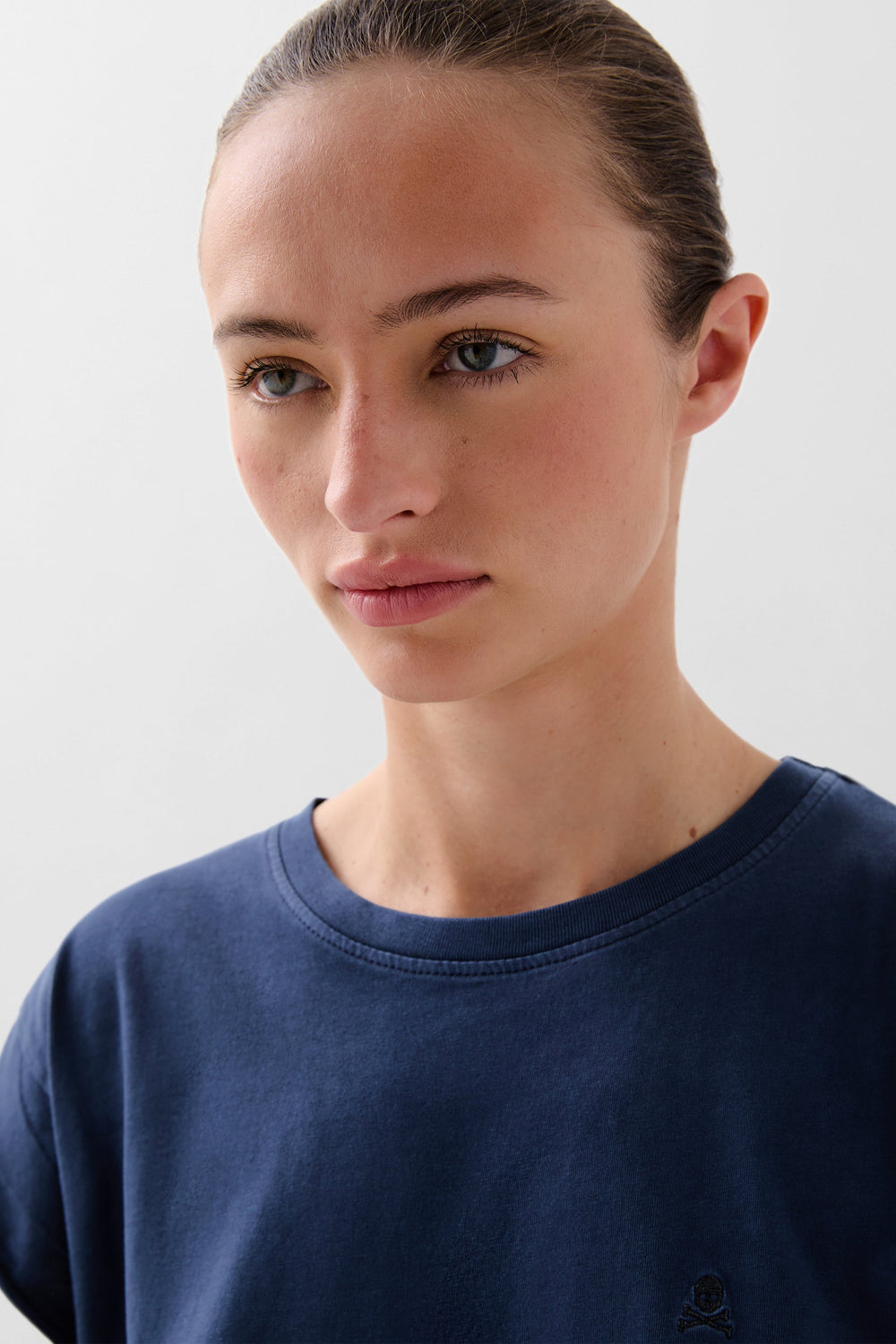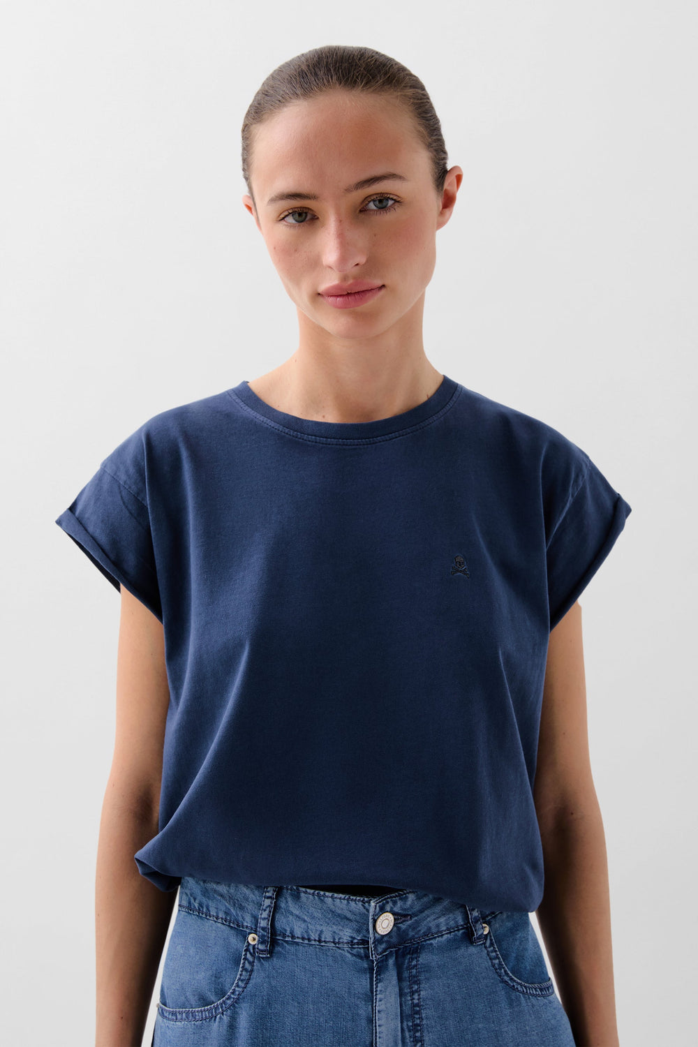 Camiseta confeccionada en 100% algodón BCI. Regular fit, cuello redondo y manga corta. Detalle de calavera bordada a tono.