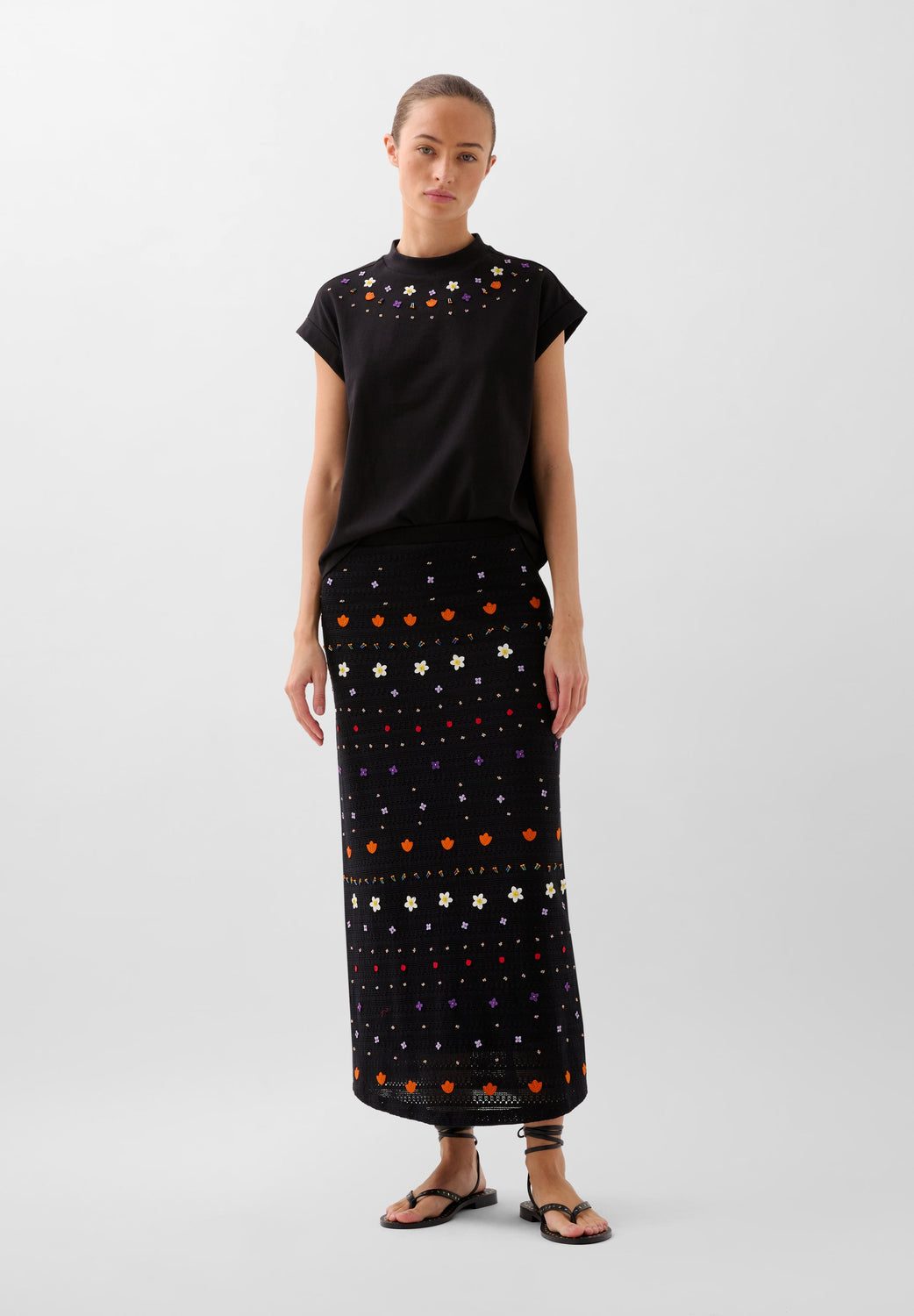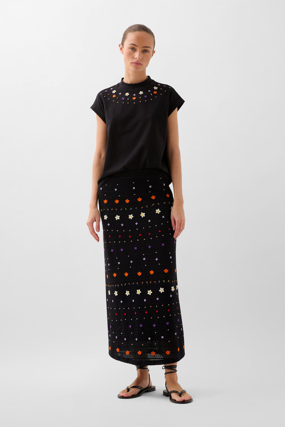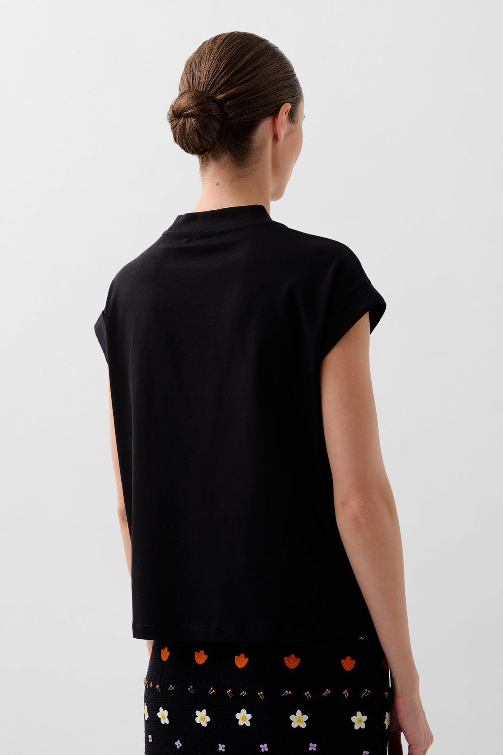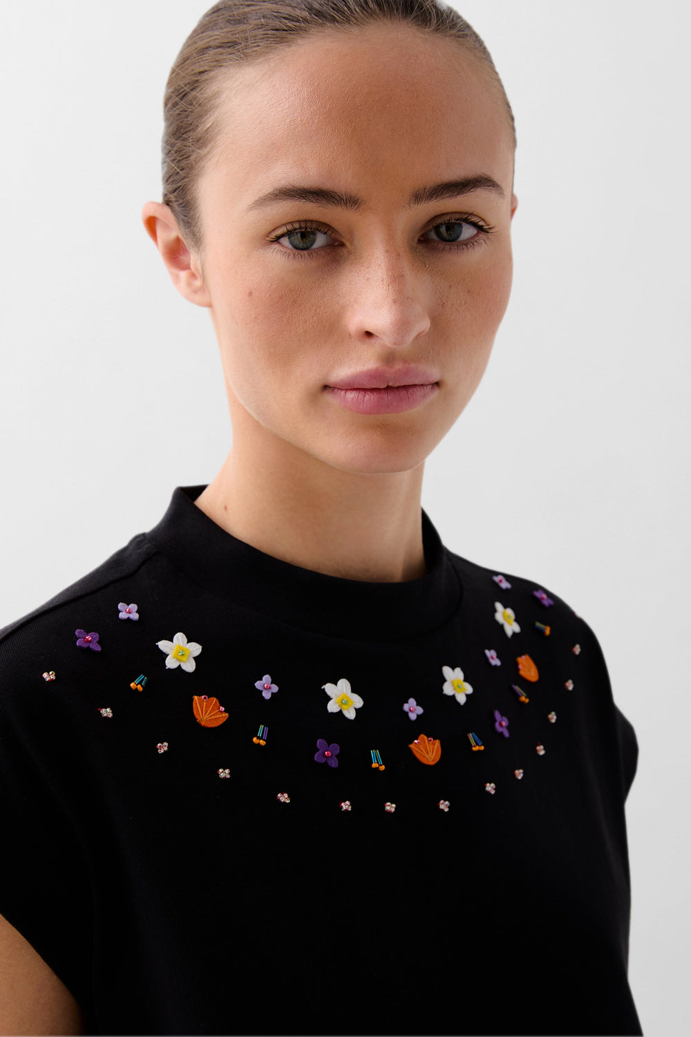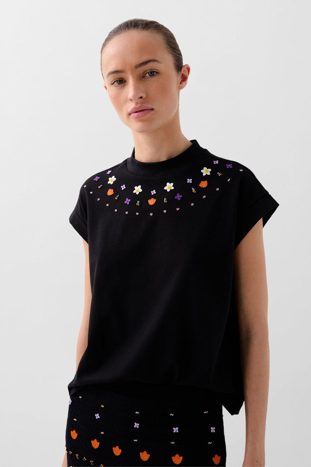 Top confeccionado en algodón. Corte cropped con cuello ligeramente subido y detalles bordados multicolor. Manga en sisa.