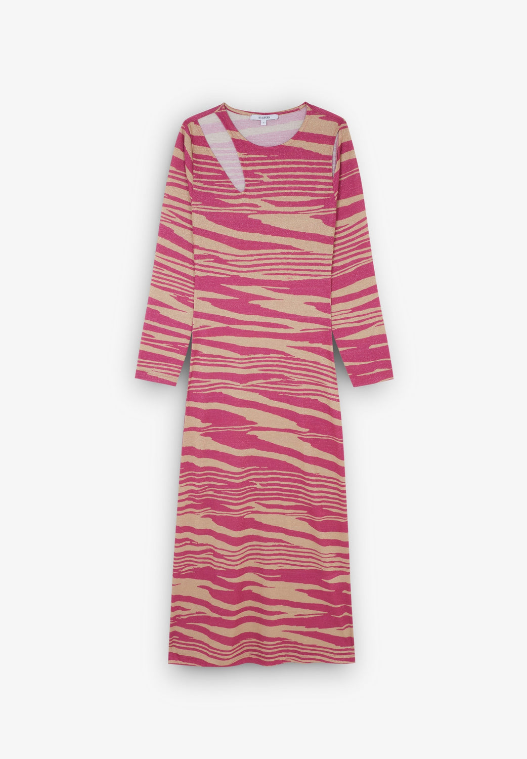 Vestido confeccionado en tejido fluido ligeramente elástico. Corte regular fit, estampado animal print con escote redondo y apertura en hombro. Manga larga.