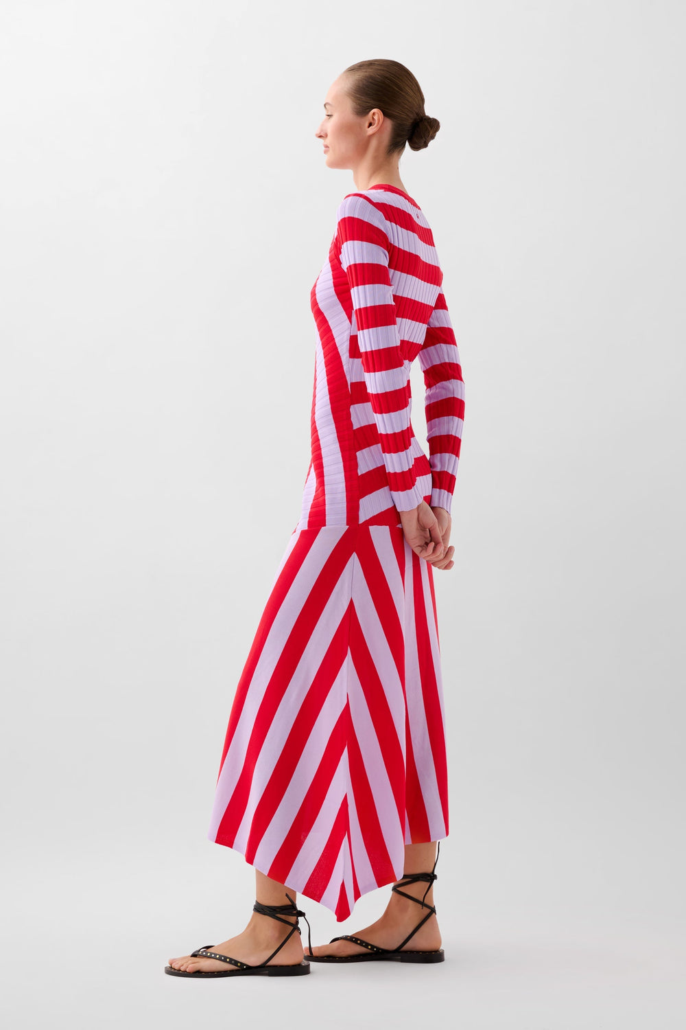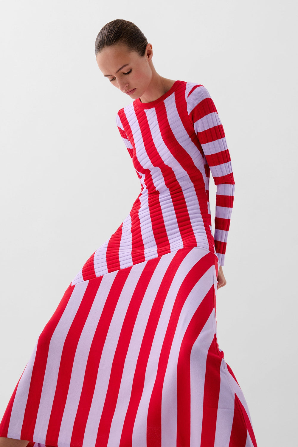 Vestido de rayas de punto. Slim Fit, cuello redondo y manga larga. Detalle de canalé en la parte superior y corte en la falda. Bajo asimétrico.