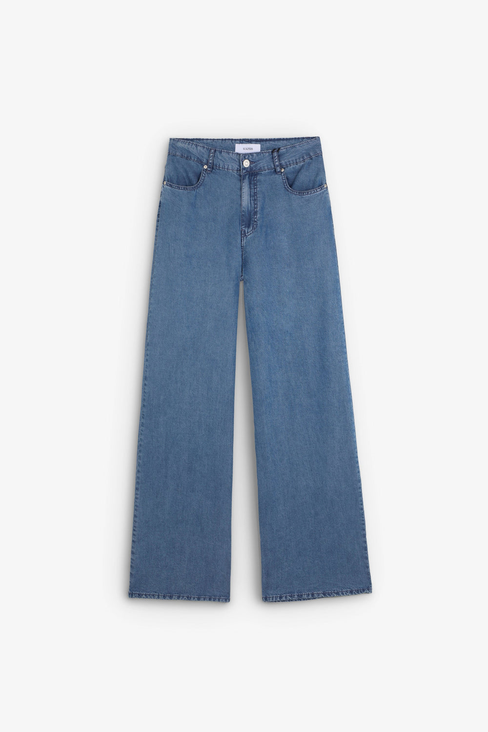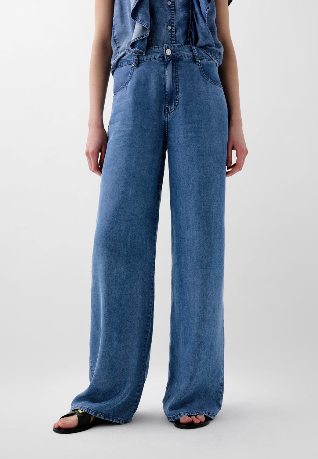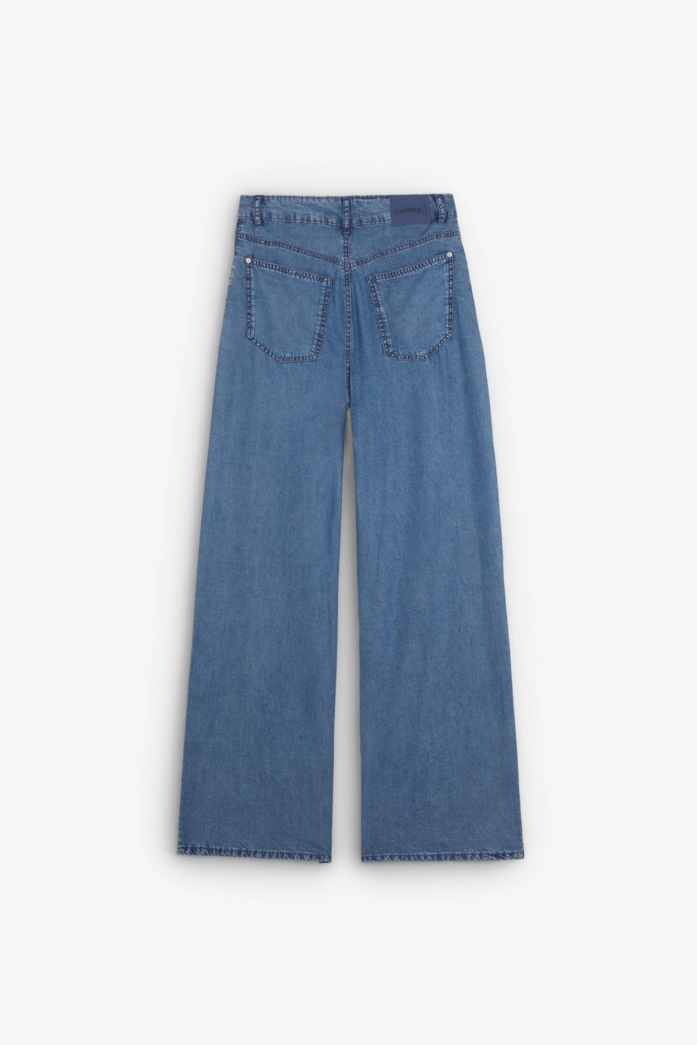 Pantalón confeccionado en tejido fluido. Corte Full Length, cintura alta, cierra con cremallera y botón con trabillas en cintura. Bolsillos traseros y delanteros.