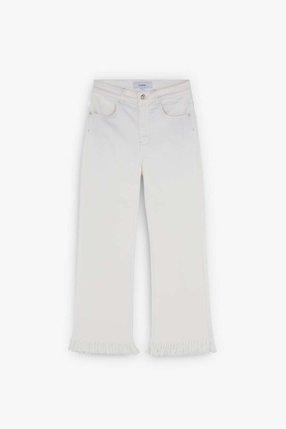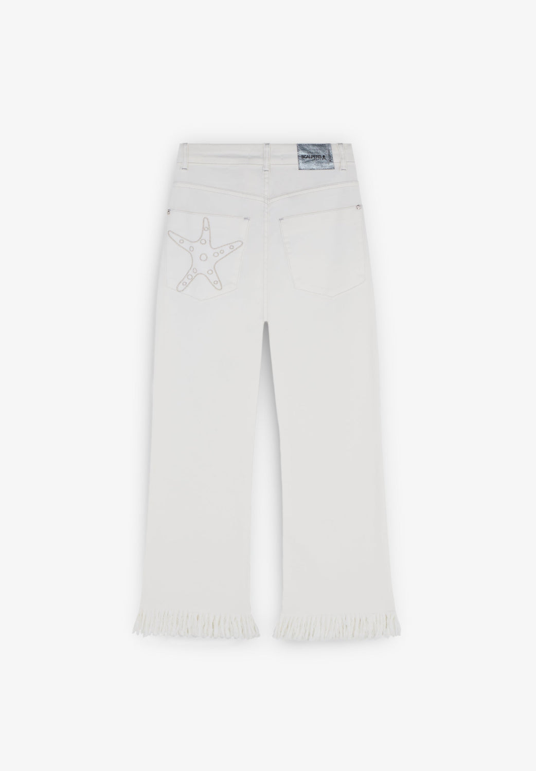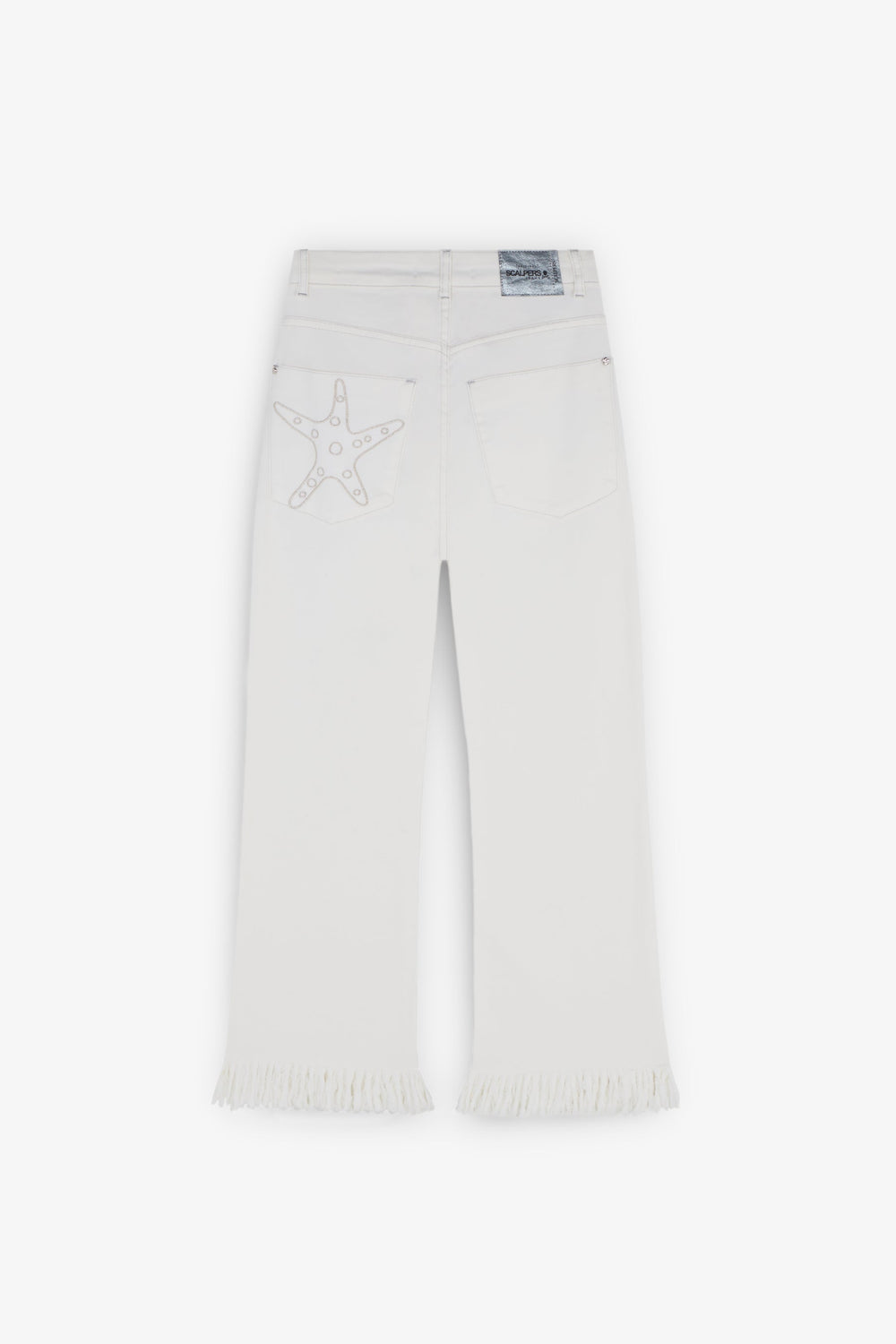 Pantalón vaquero confeccionado en 100% Algodón Orgánico BCI. Dos bolsillos en frontal. Dos bolsillos posteriores con detalle bordado. Motivo desflecado en bajos. Cierre mediante botón y cremallera.