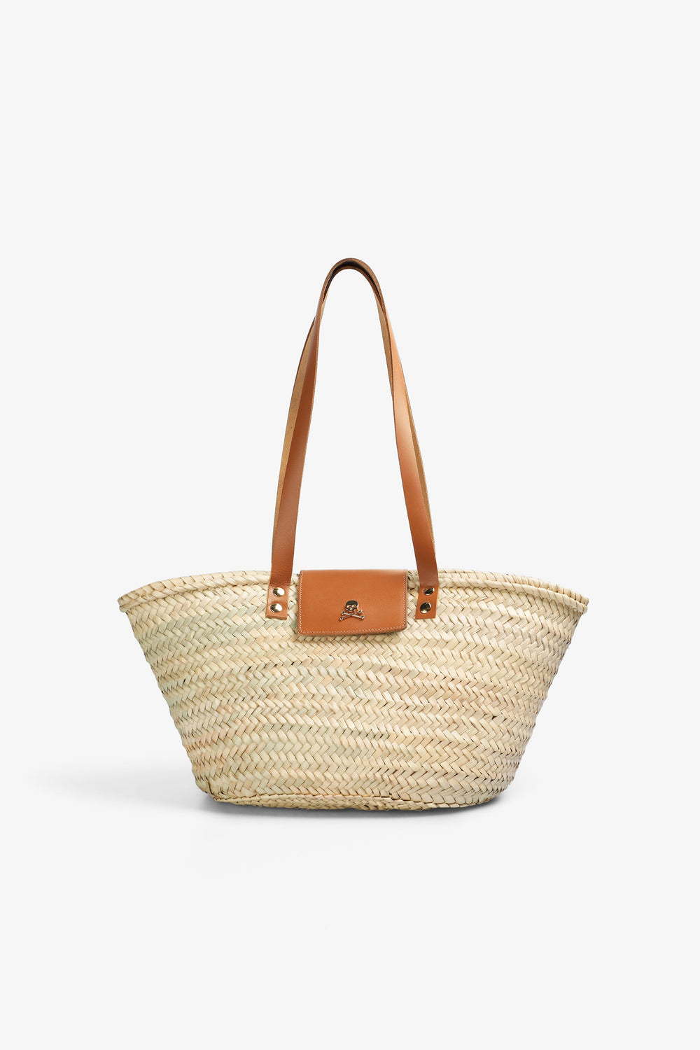 Bolso tipo capazo con logo. Confeccionado en 100% hoja de palma. Asas largas. Cierre con snap.