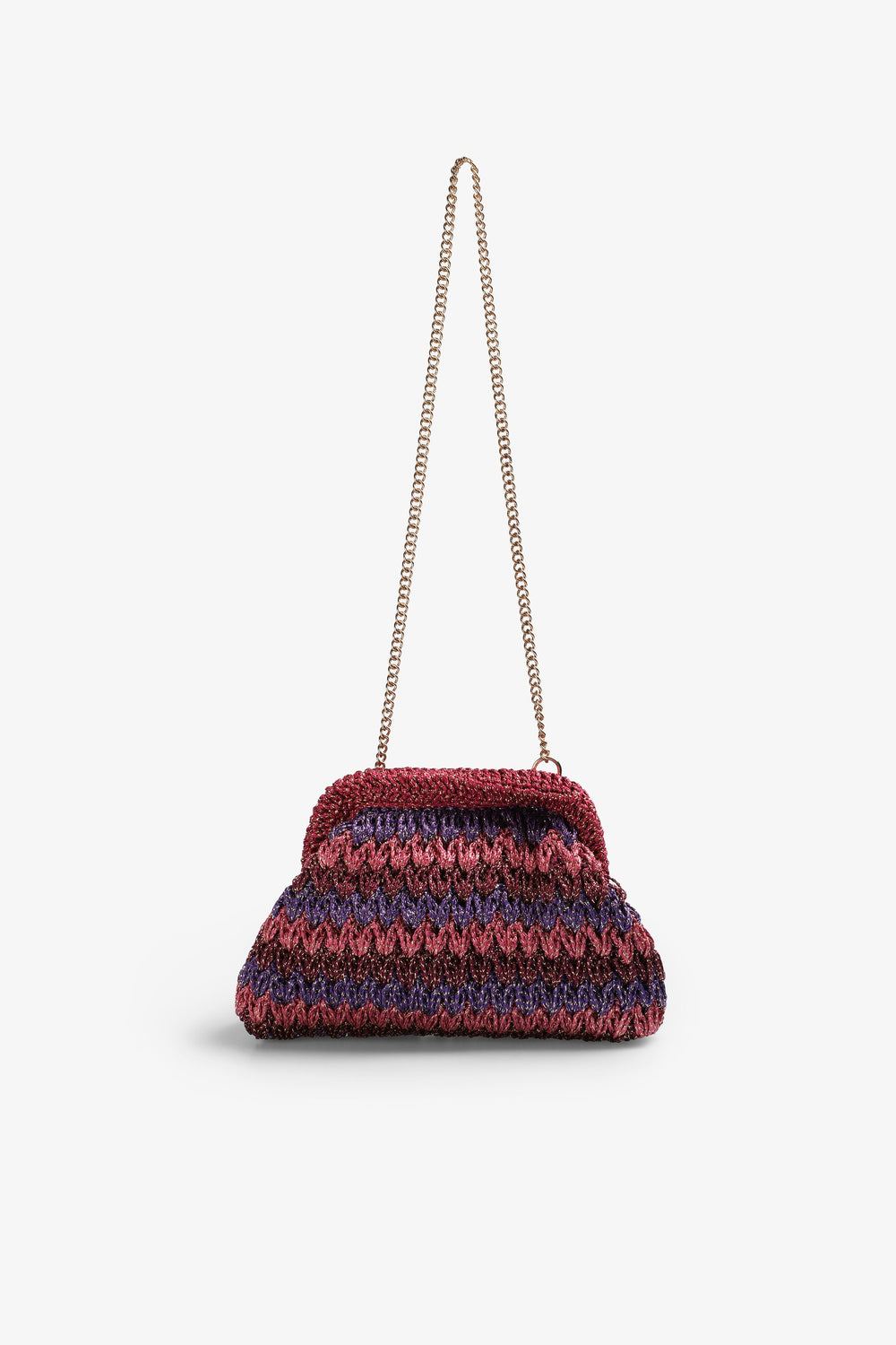 Bolso confeccionado en crochet con hilo metalizado. Forro interior y cadena desmontable.