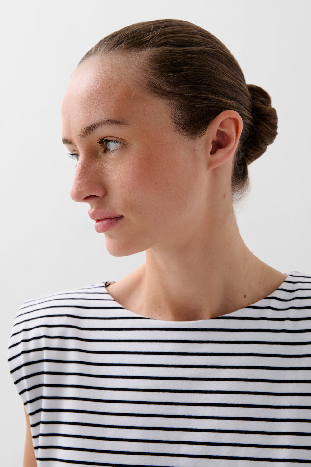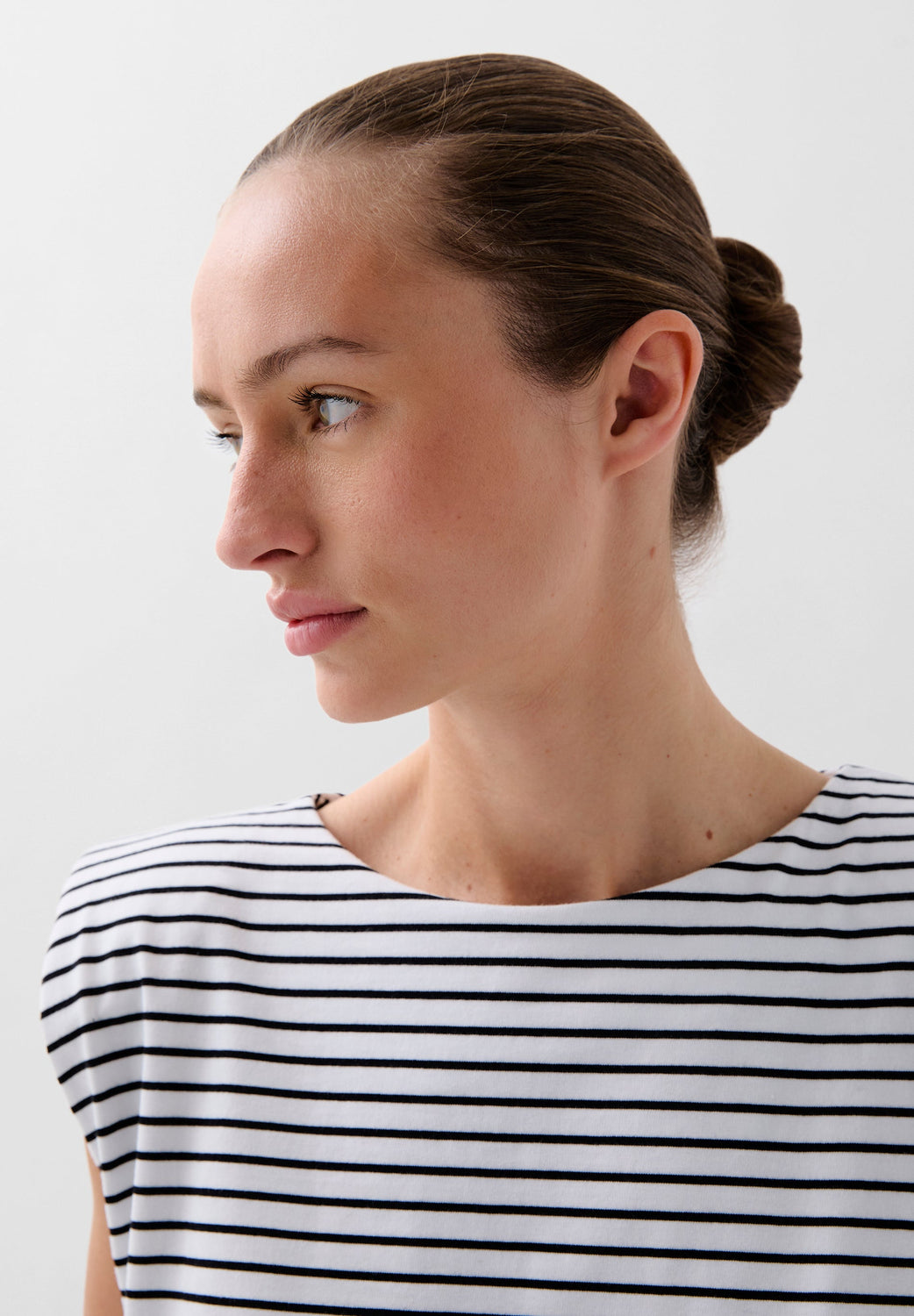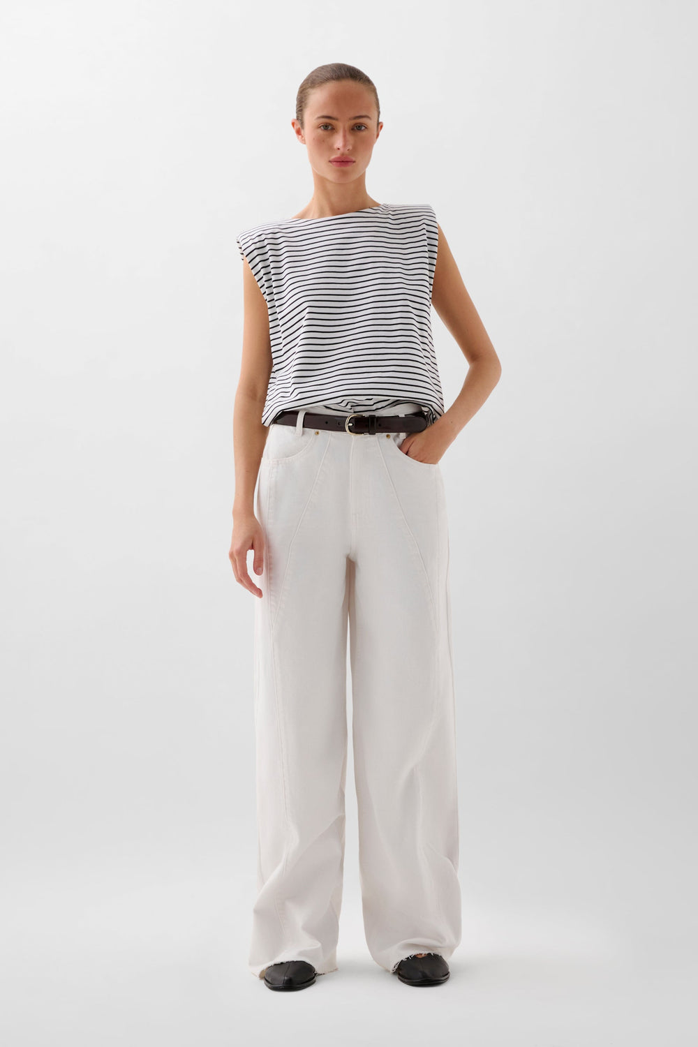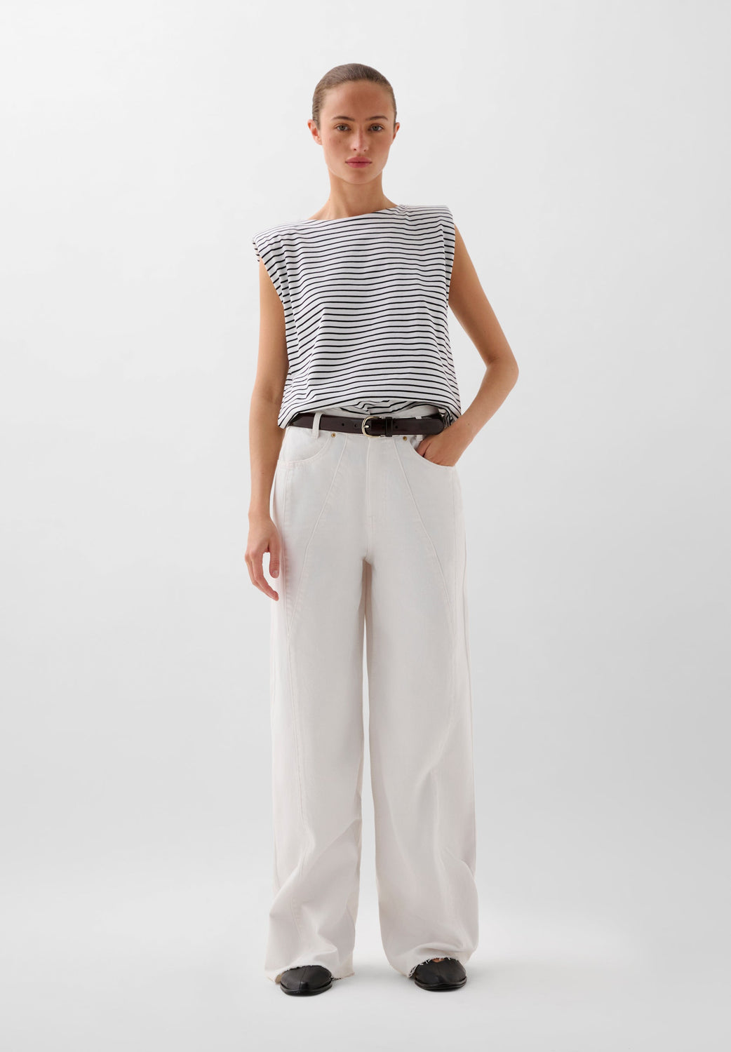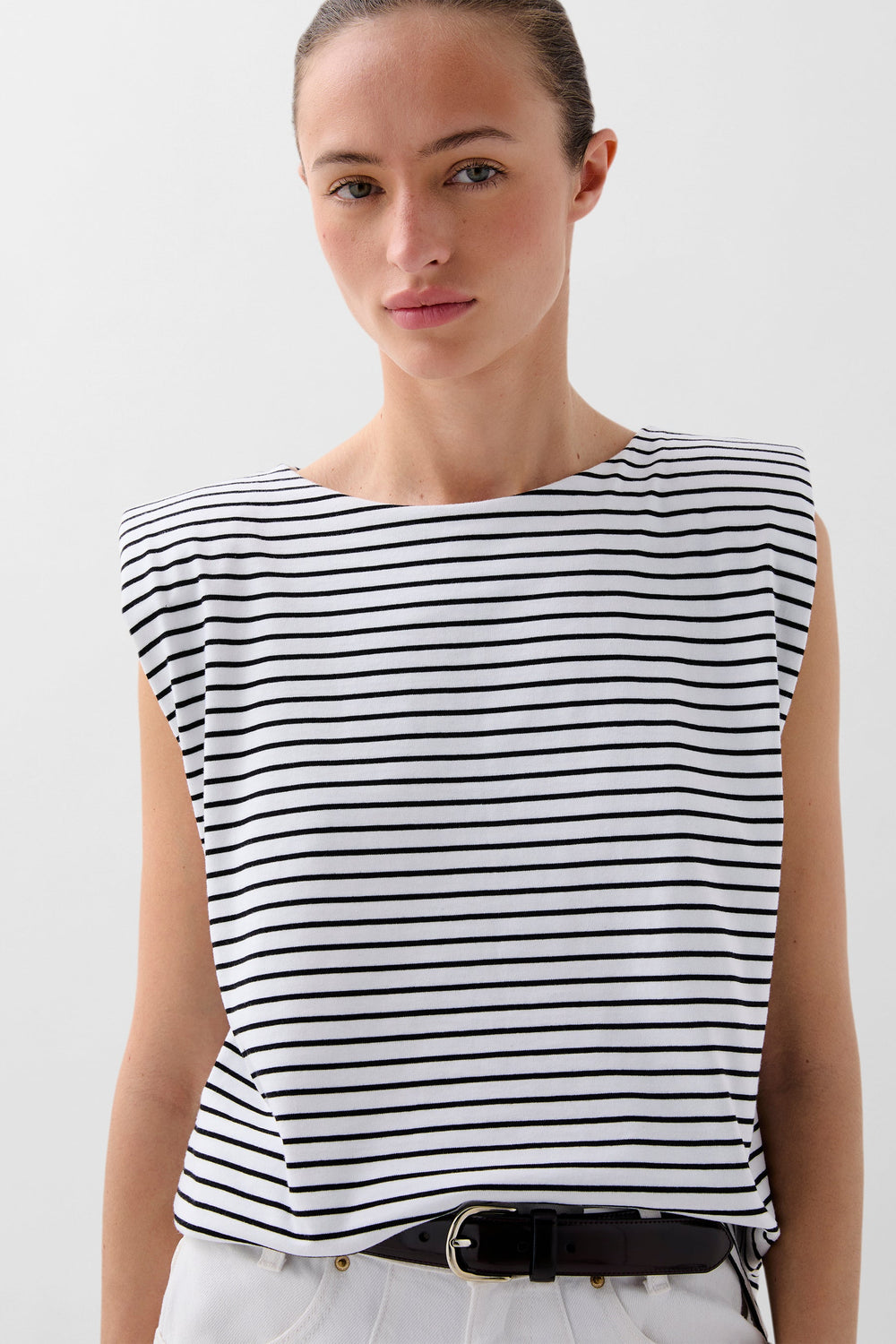 Camiseta confeccionada en 100% algodón de rayas. Corte regular fit, cuello redondo y manga en sisa con ligera hombrera.