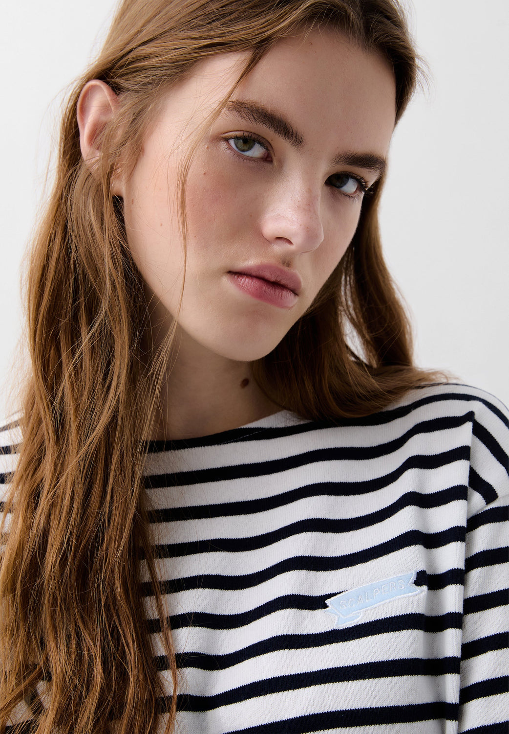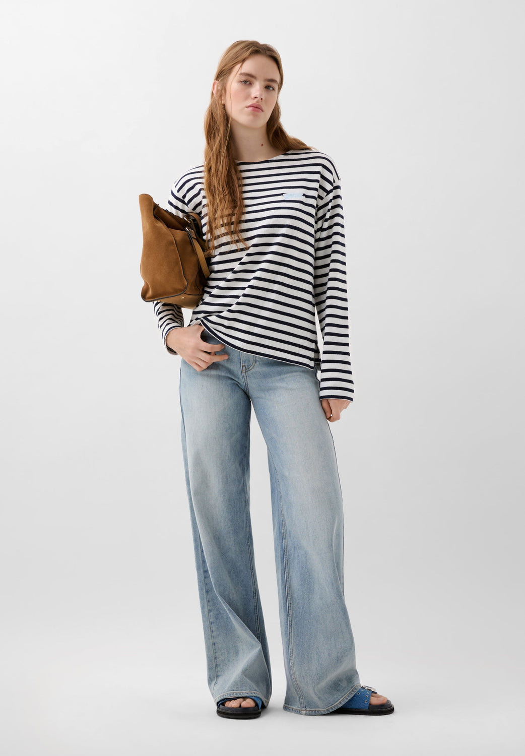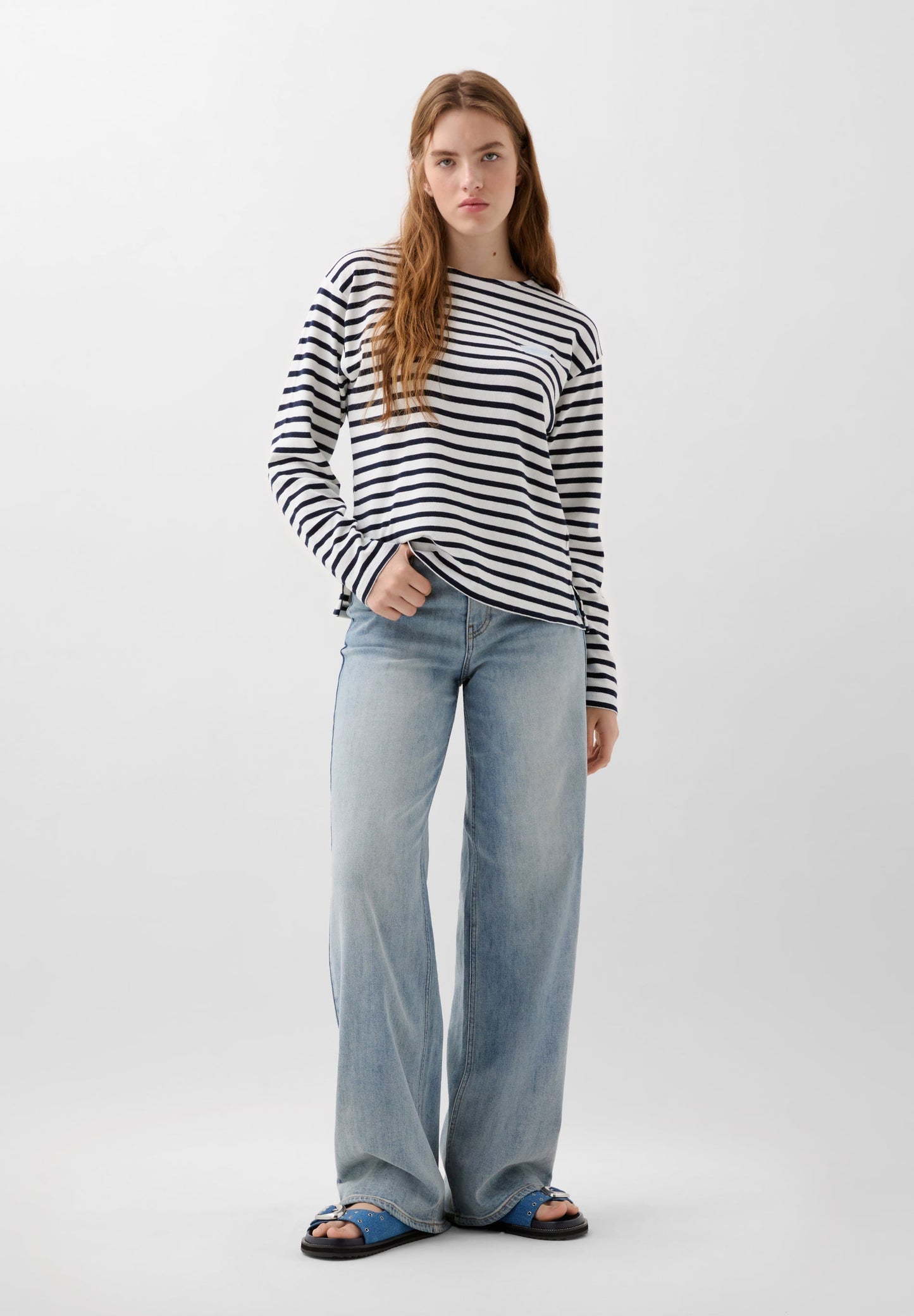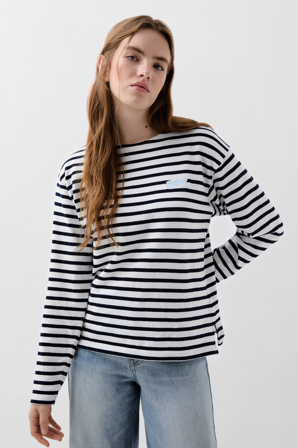 Camiseta de rayas confeccionada en 100% algodón. Regular fit, cuello redondo y manga larga. Detalle de bordado de etiqueta logo en pecho.