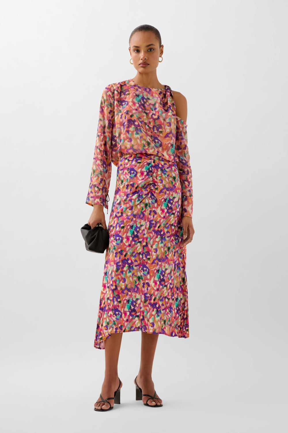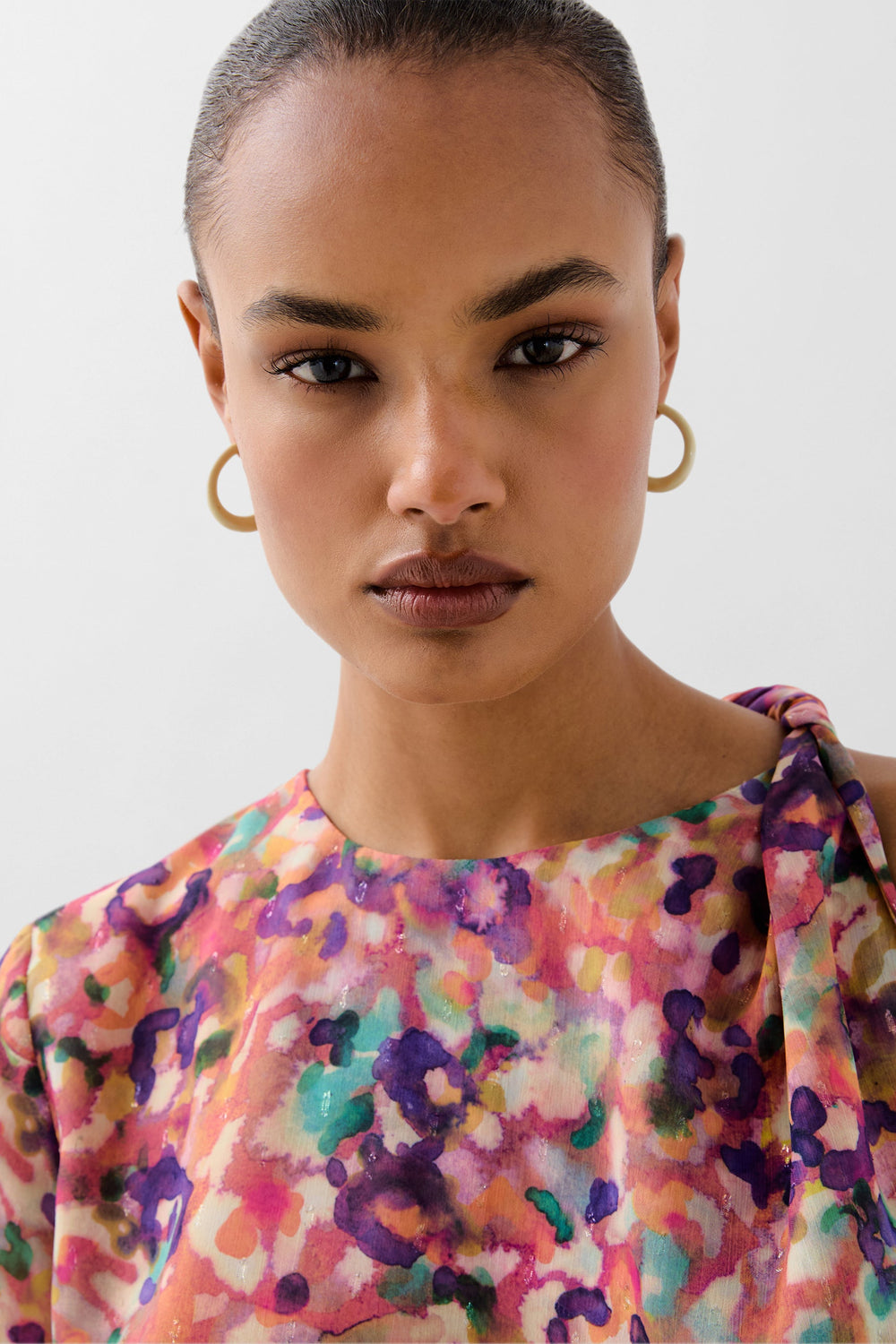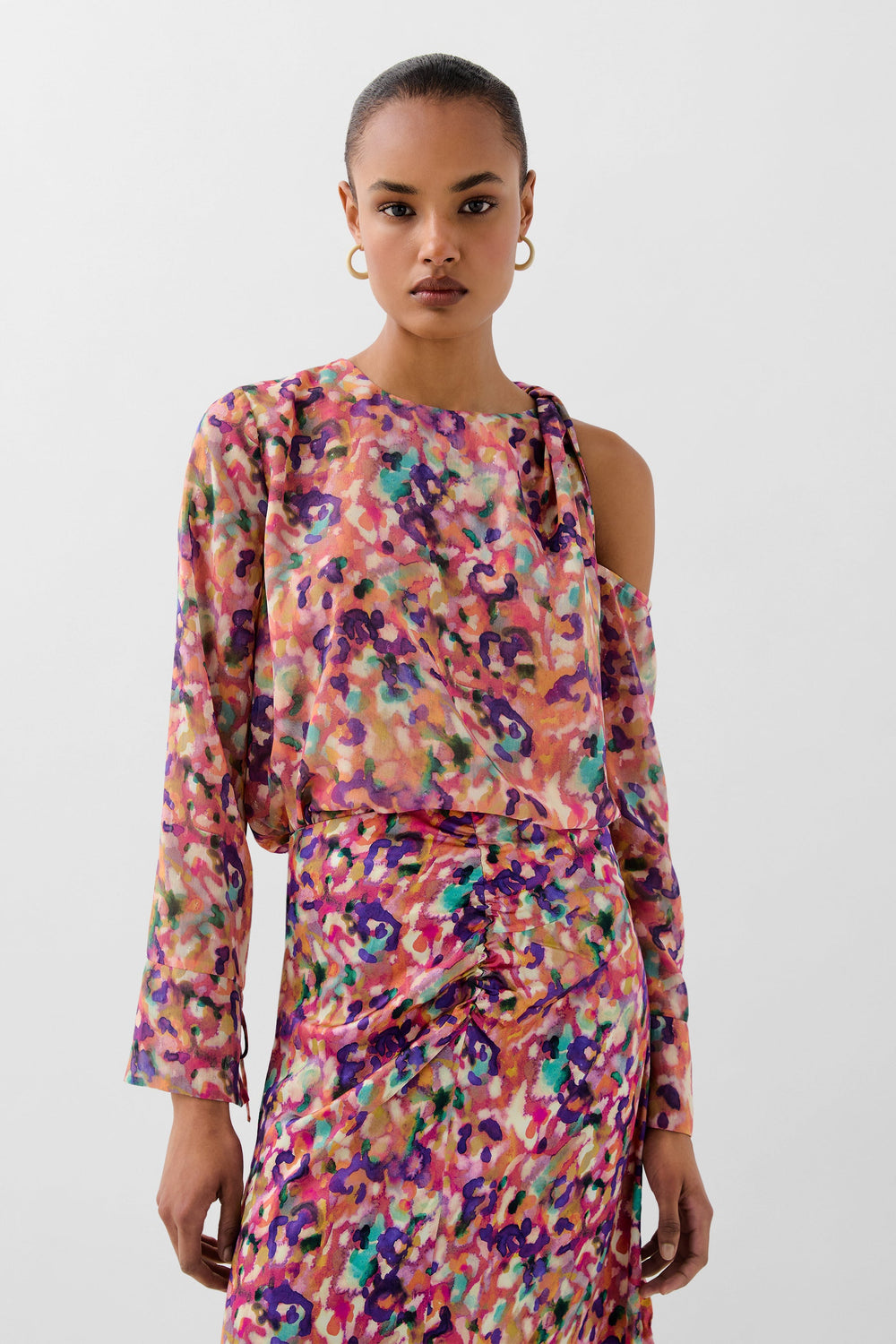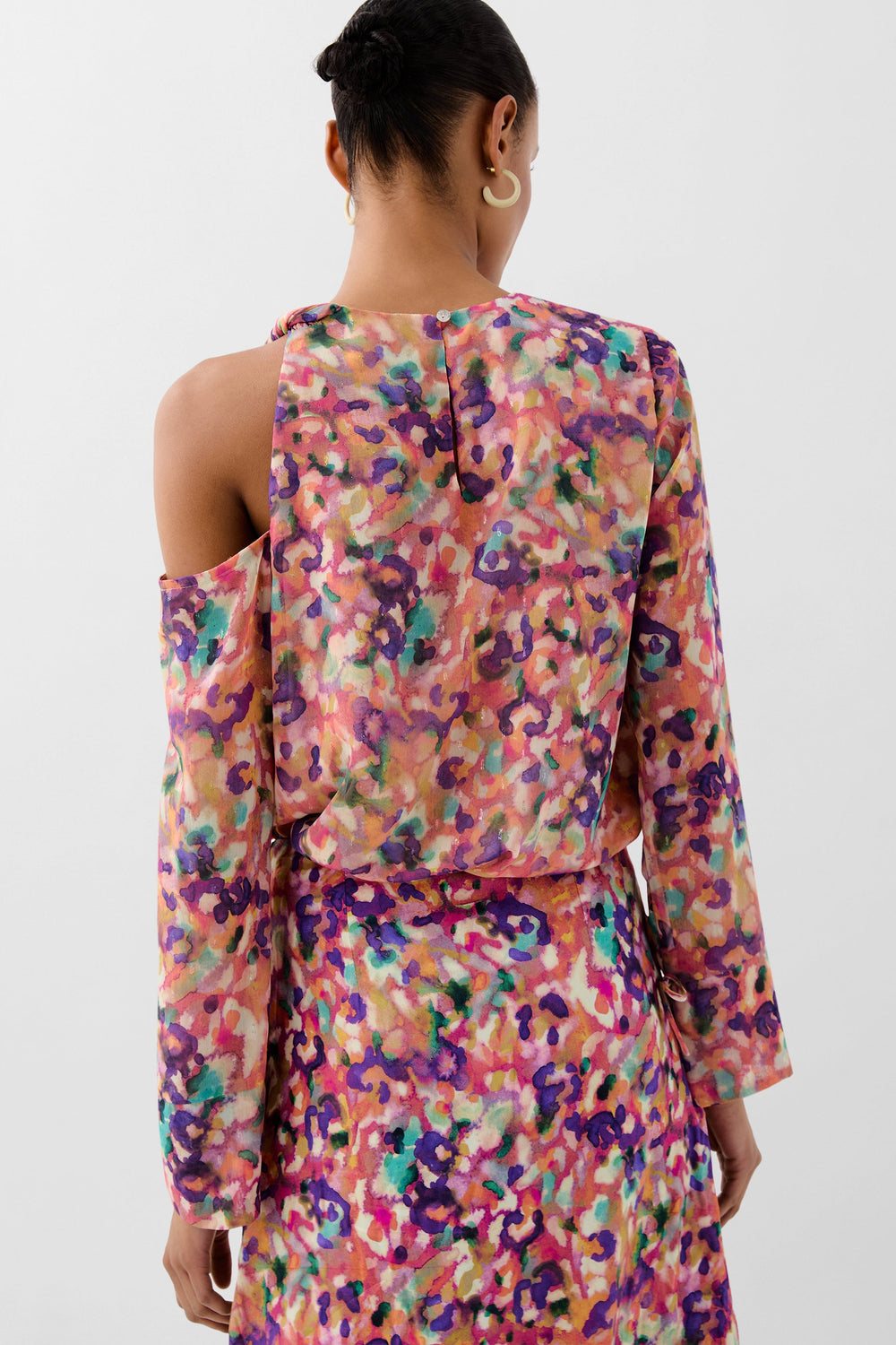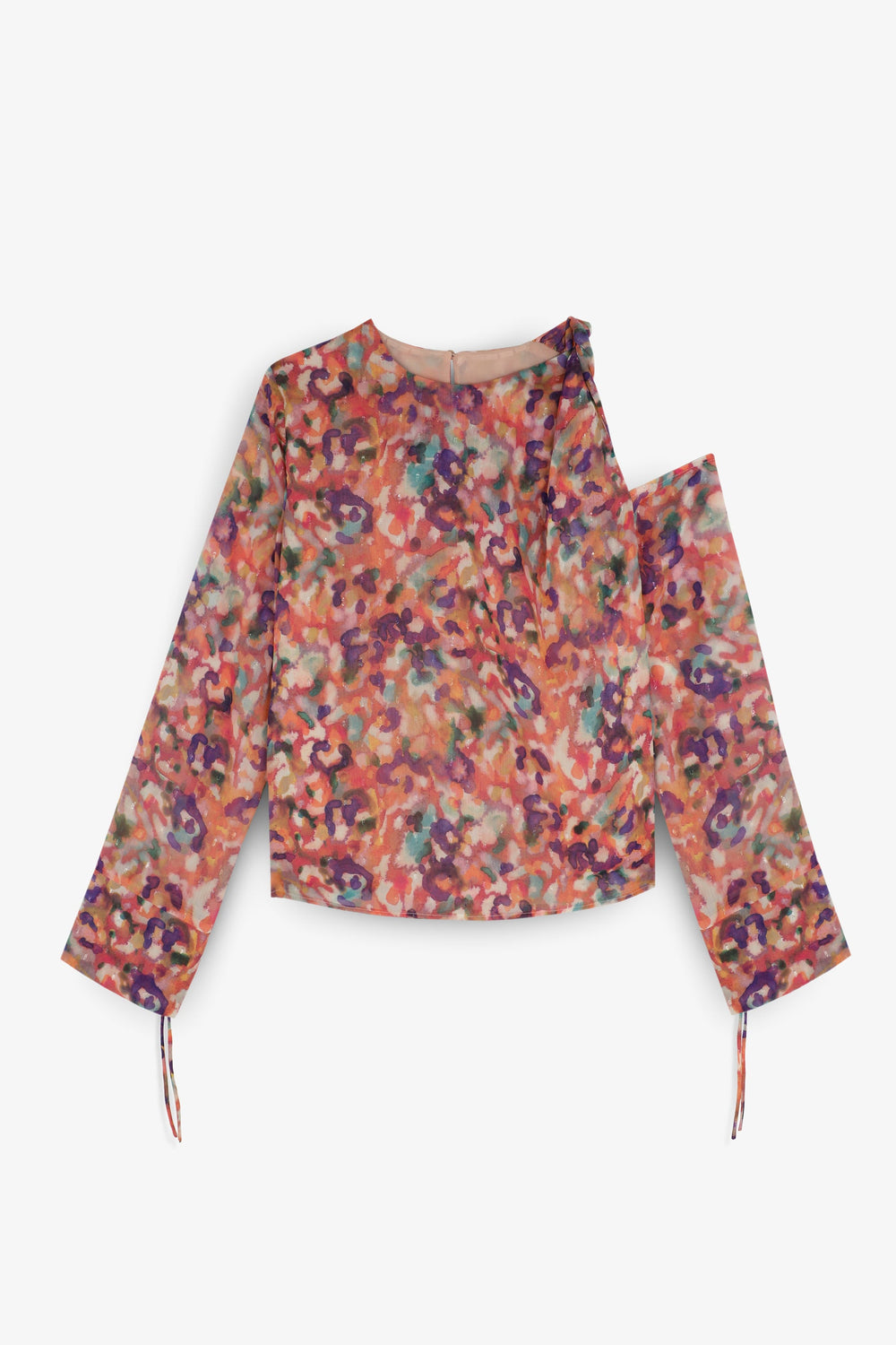 Blusa estampada de manga larga. Abertura en hombro. Detalle de lazada en hombro izquierdo. Cierre por cremallera en espalda. Cuello redondo. Estampada.