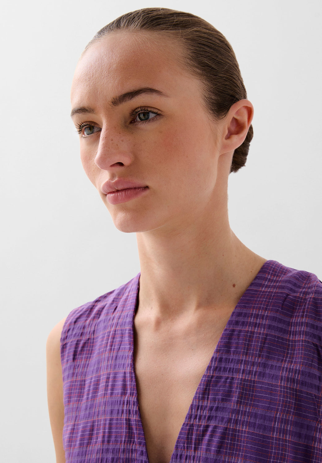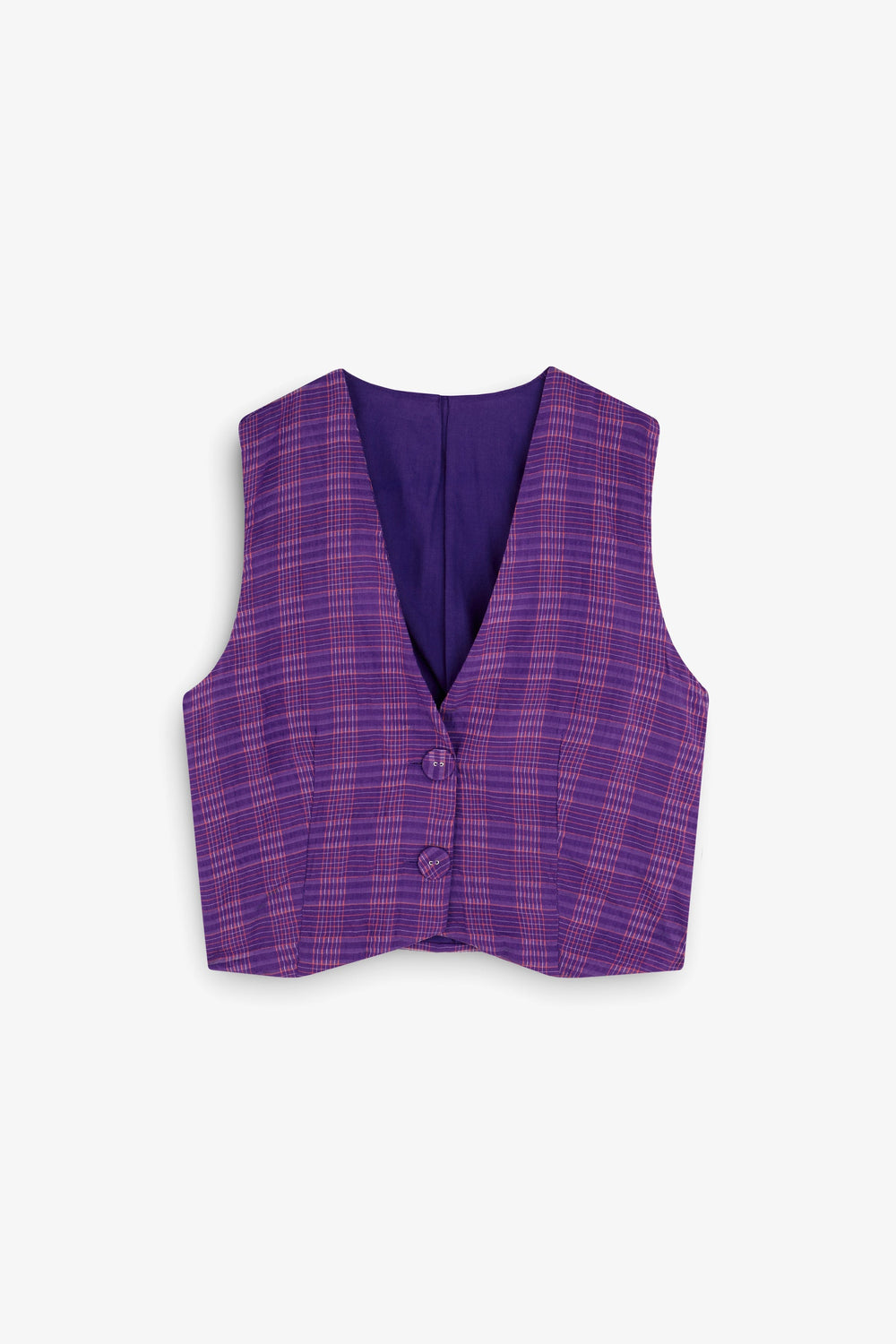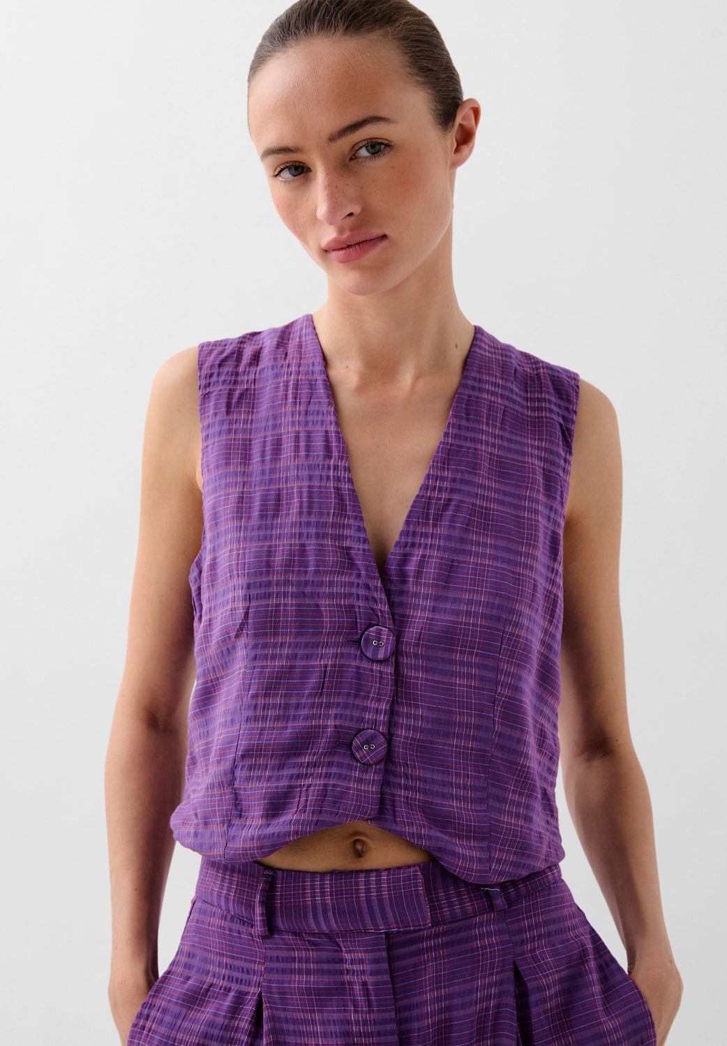 Chaleco de rayas con detalles bordados a contraste. Confeccionado en tejido fluido. Corte Regular fit. Cierre con botones. Escote de pico. Manga en sisa.