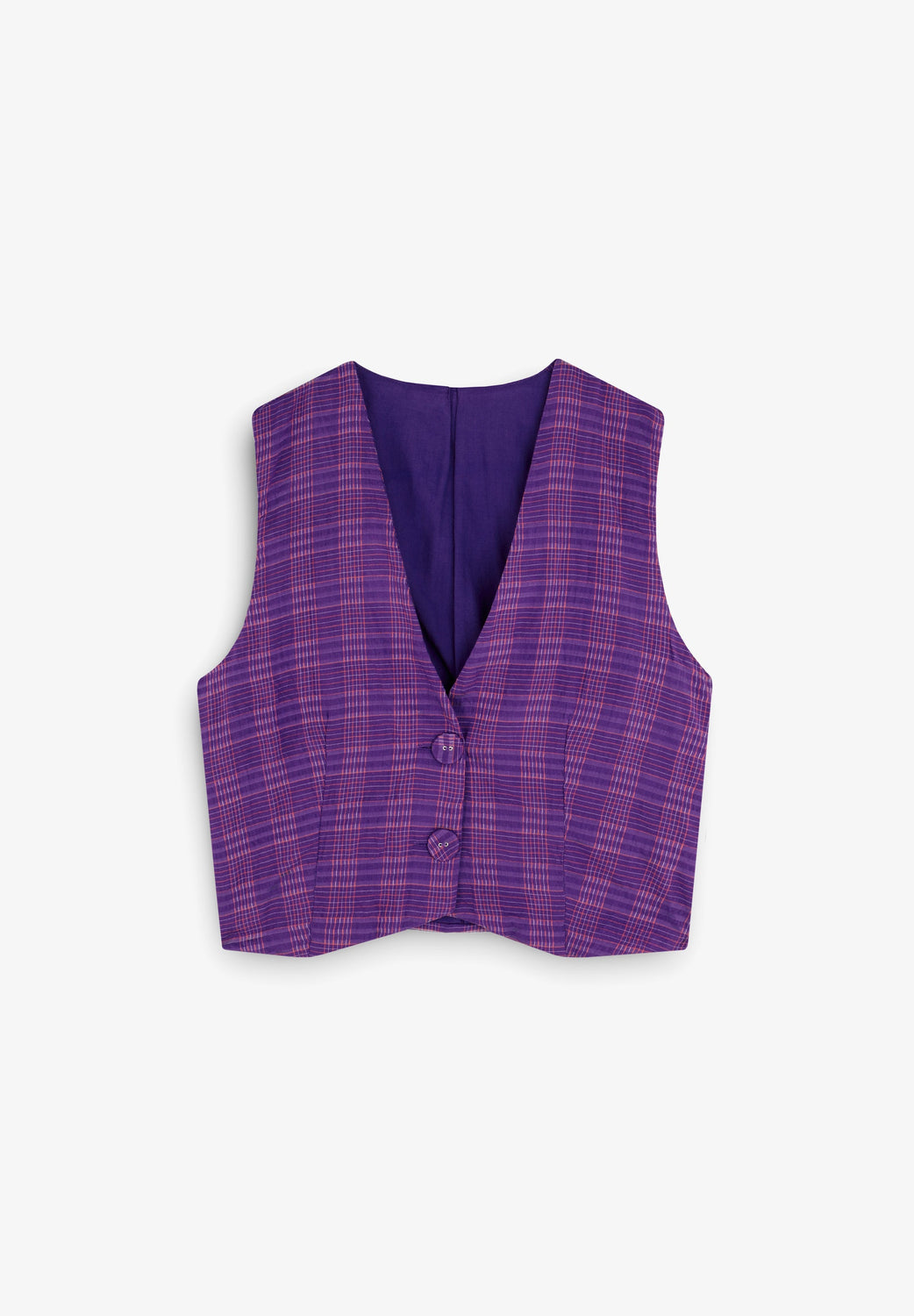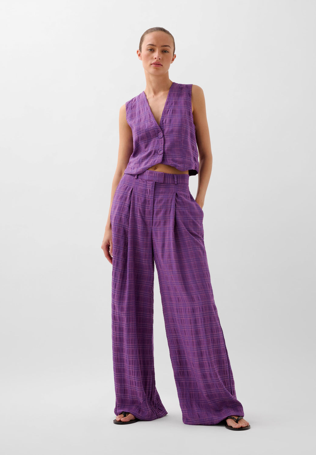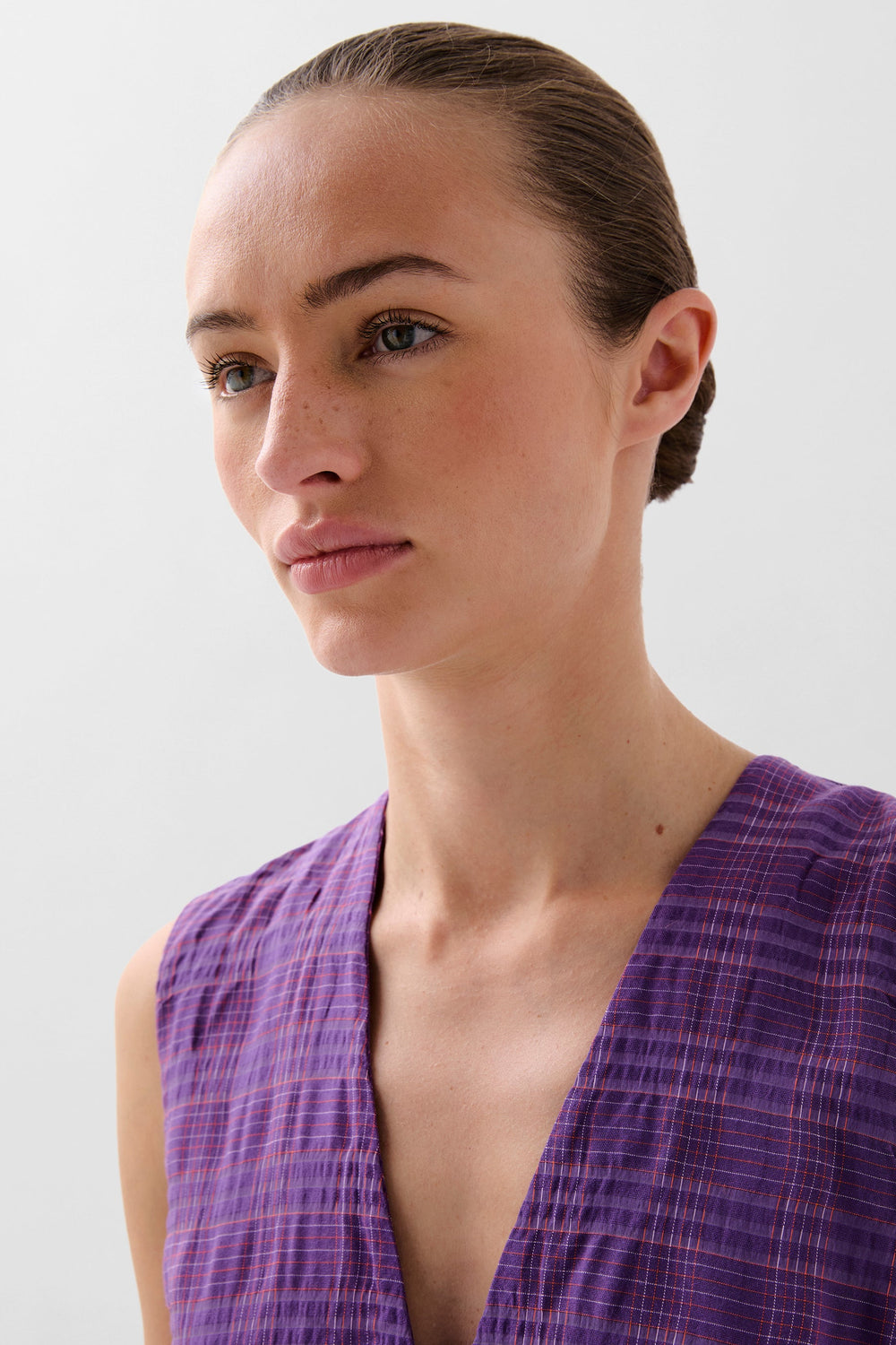 Chaleco de rayas con detalles bordados a contraste. Confeccionado en tejido fluido. Corte Regular fit. Cierre con botones. Escote de pico. Manga en sisa.