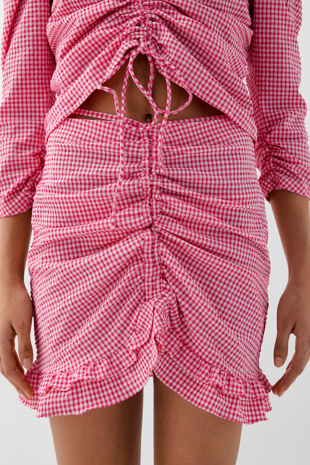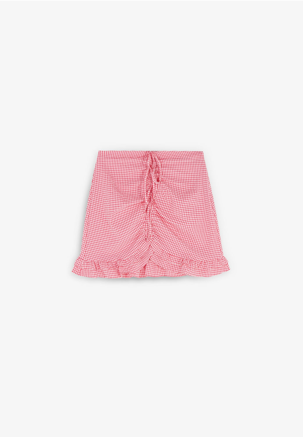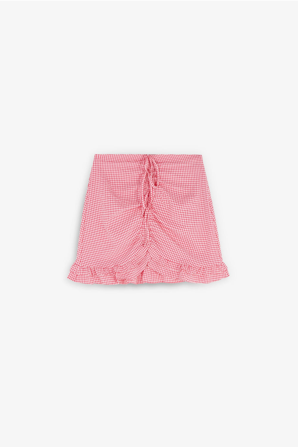 Falda estampado Vichy. Fruncido en frontal. Volantes en bajo. Detalle de nudo ajustable en frontal.