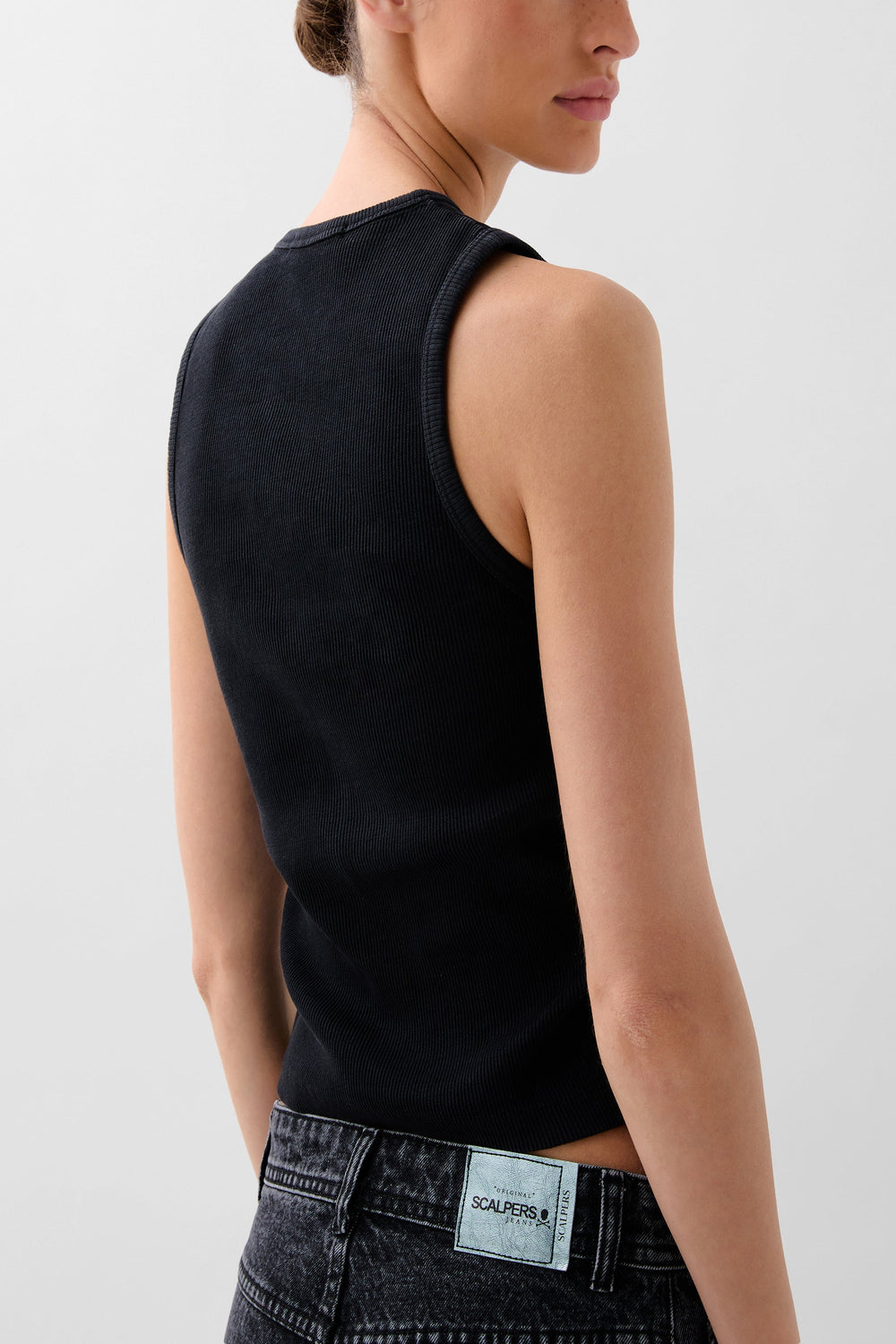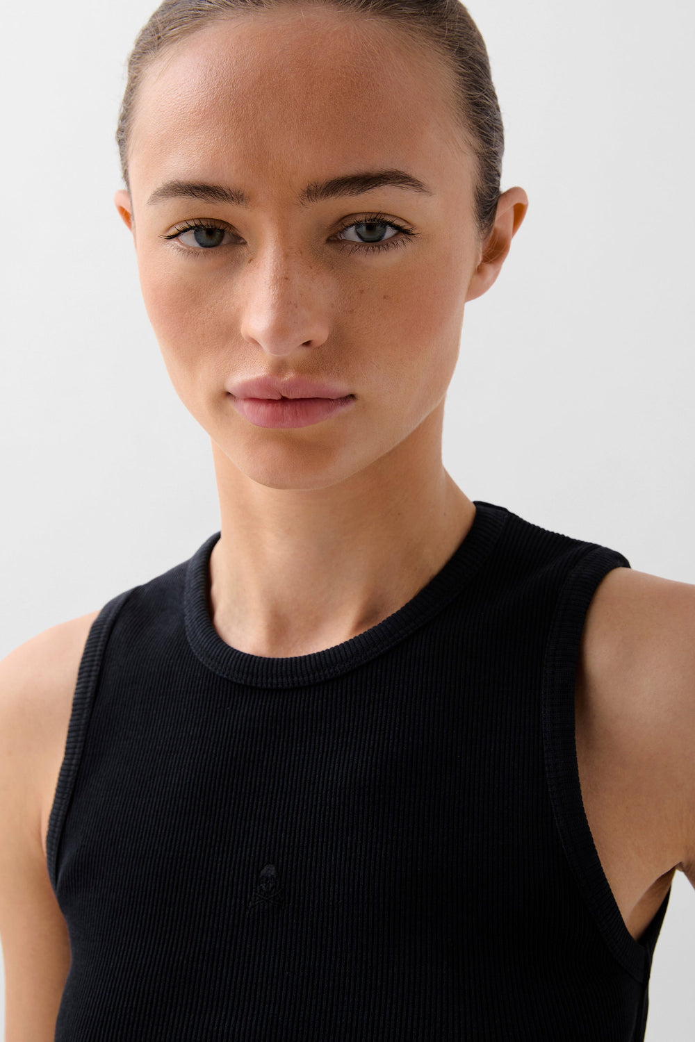 Tank top confeccionado en tejido rib en mezcla de 90% algodón BCI con elastano. Corte slim fit, cuello redondo y manga en sisa. Detalle de frunces laterales.
