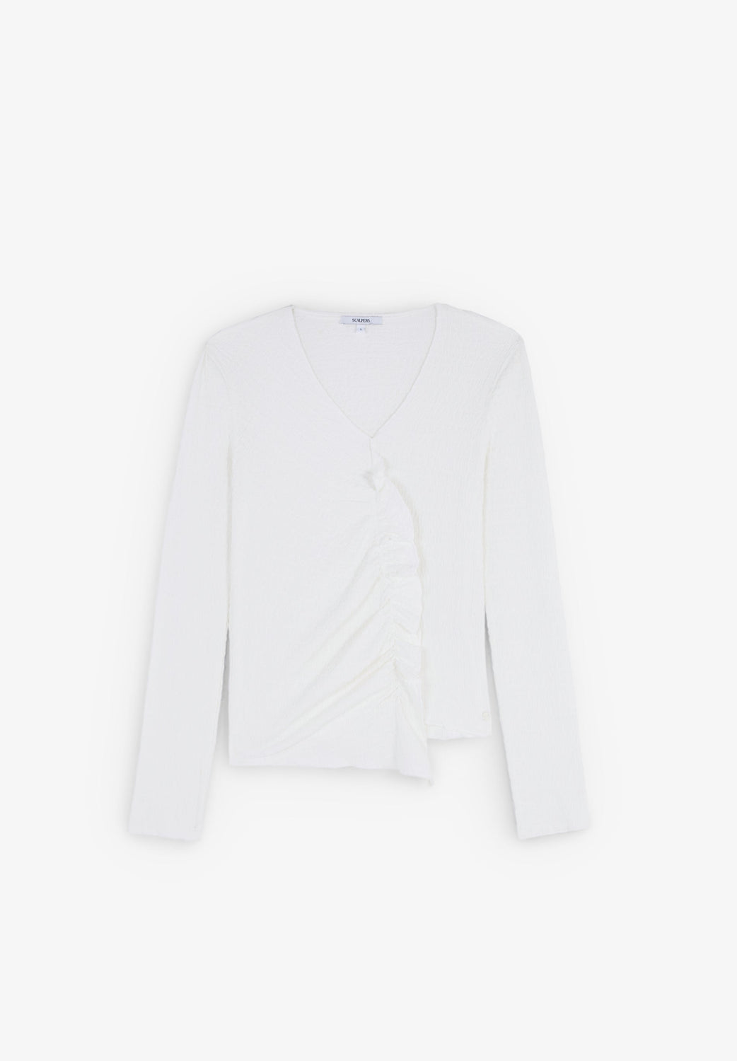 Top acabado textura de escote asimétrico en pico con volantes y manga larga.