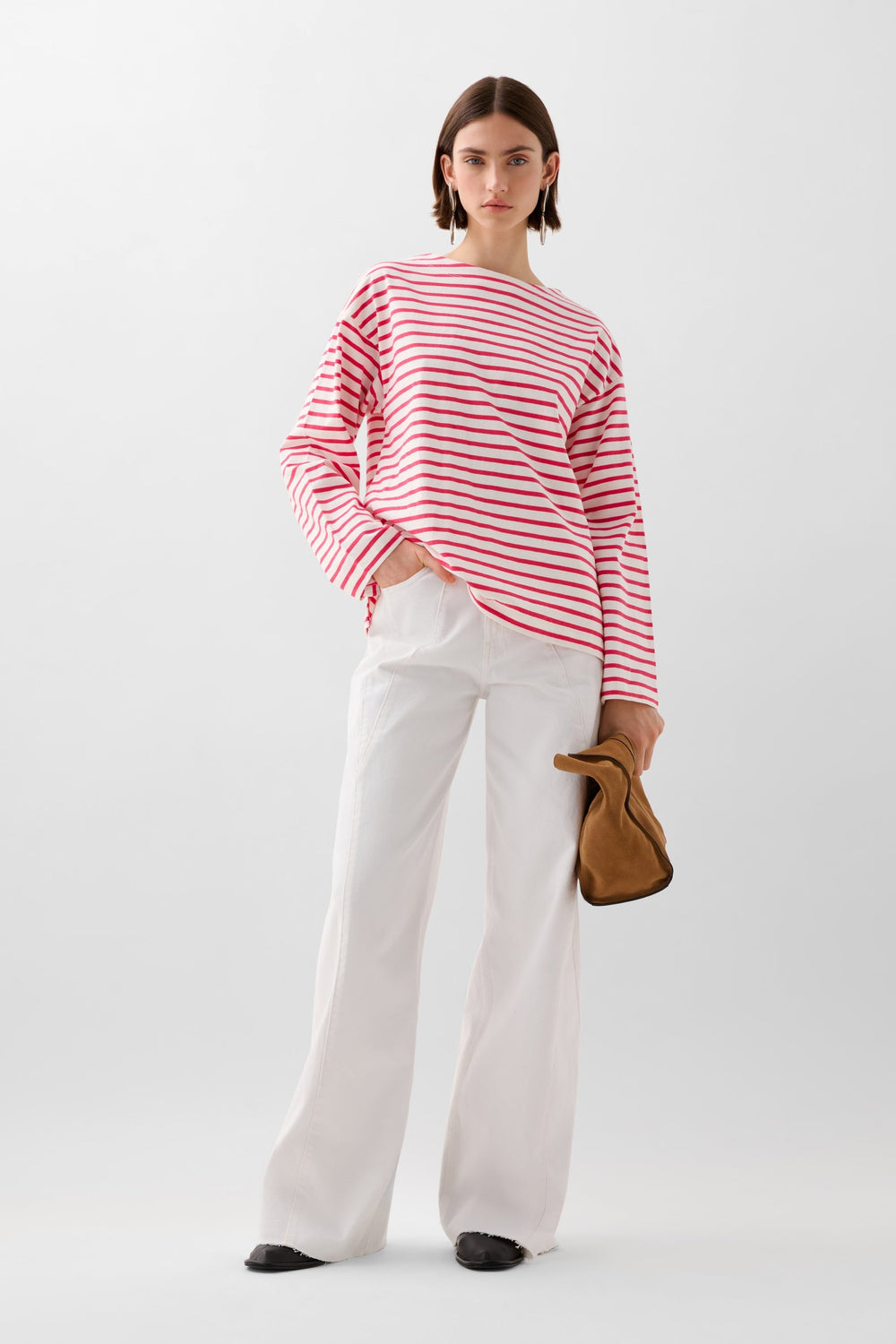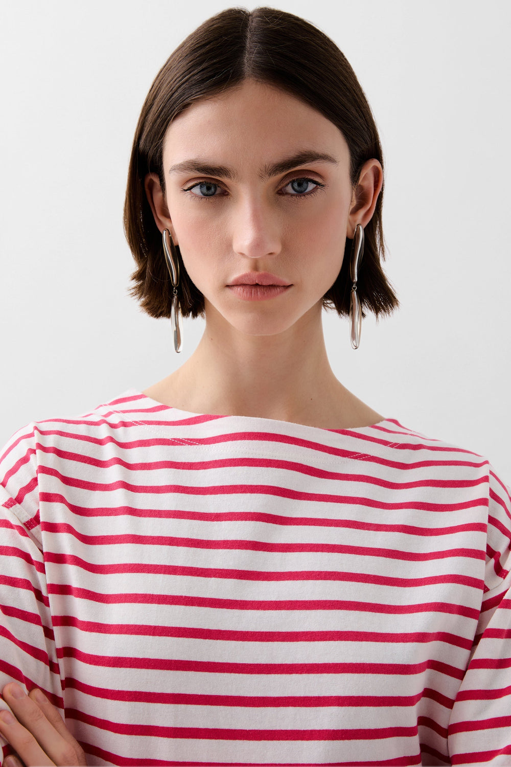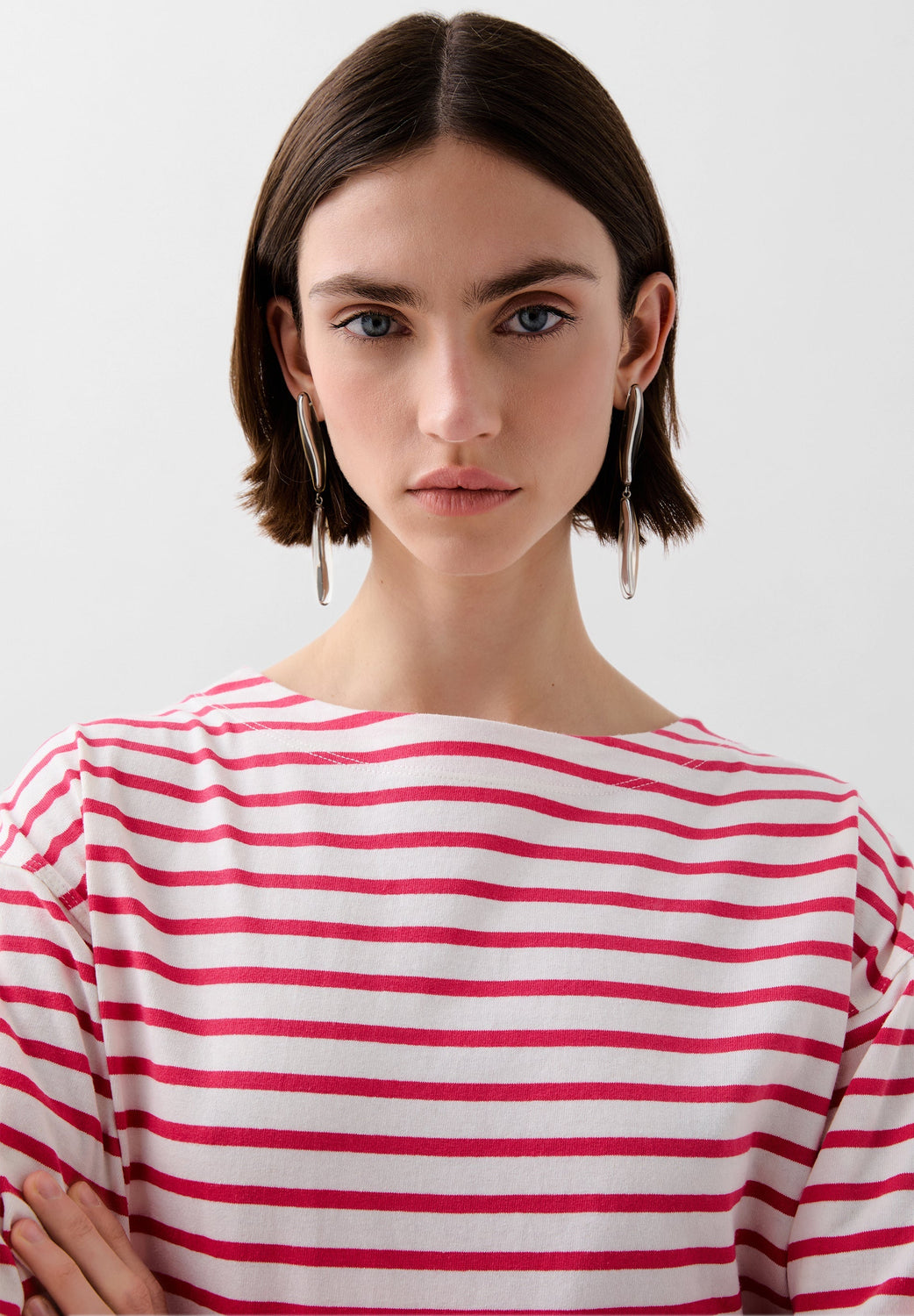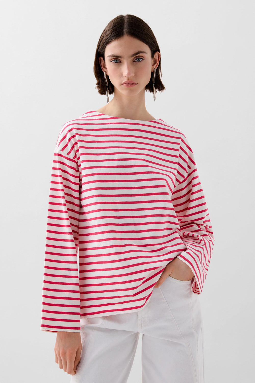 Camiseta de rayas confeccionada en 100% algodón. Relaxed fit, cuello redondo y manga larga. Detalle de etiqueta de logo trasera.
