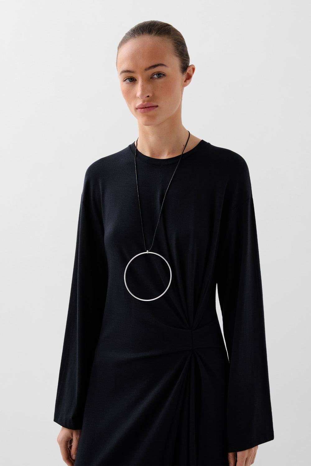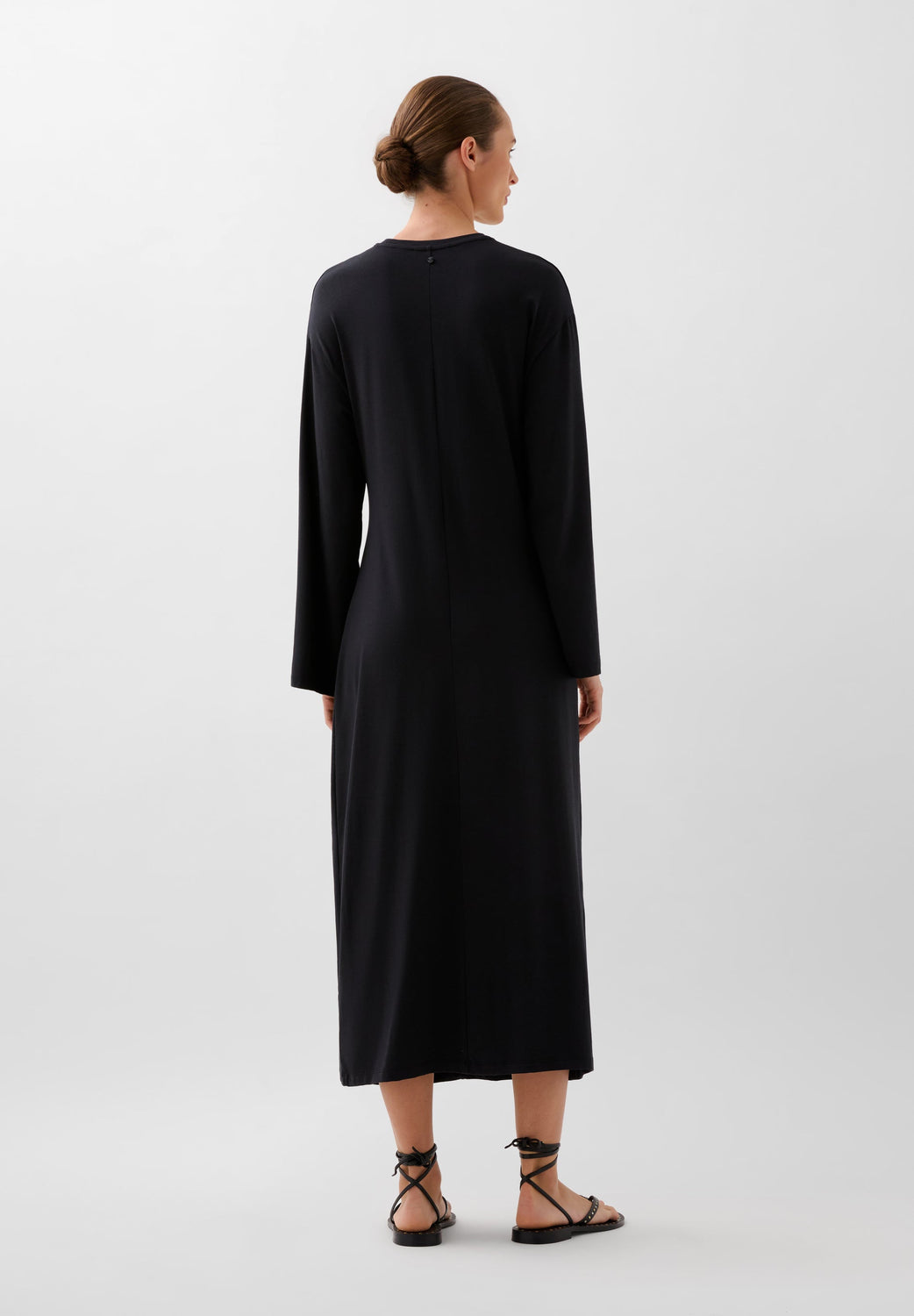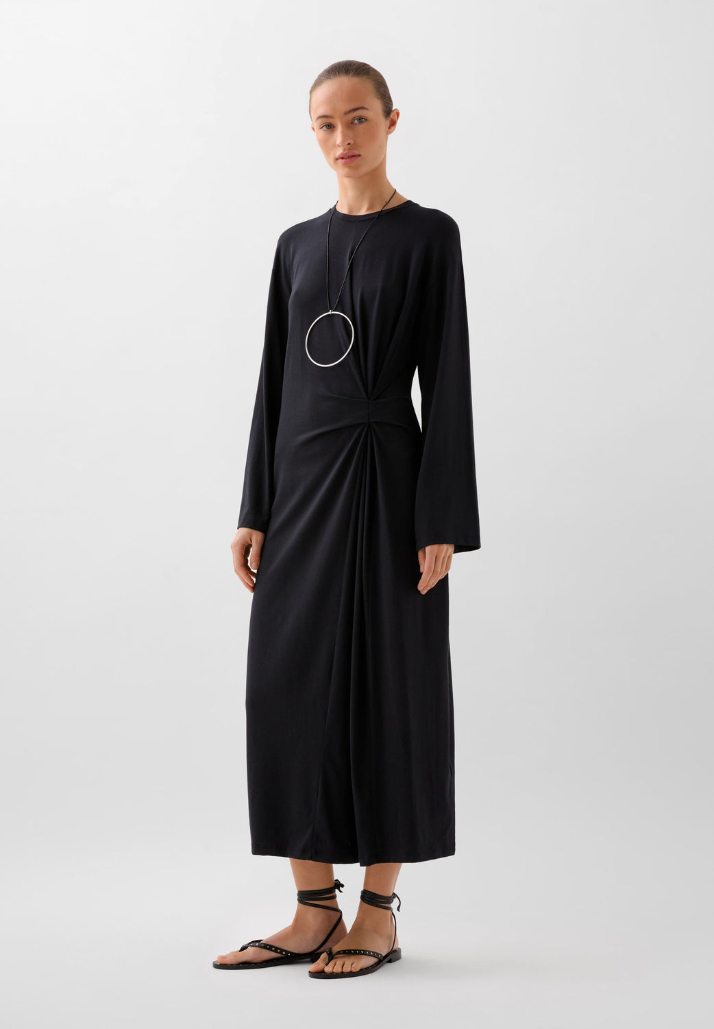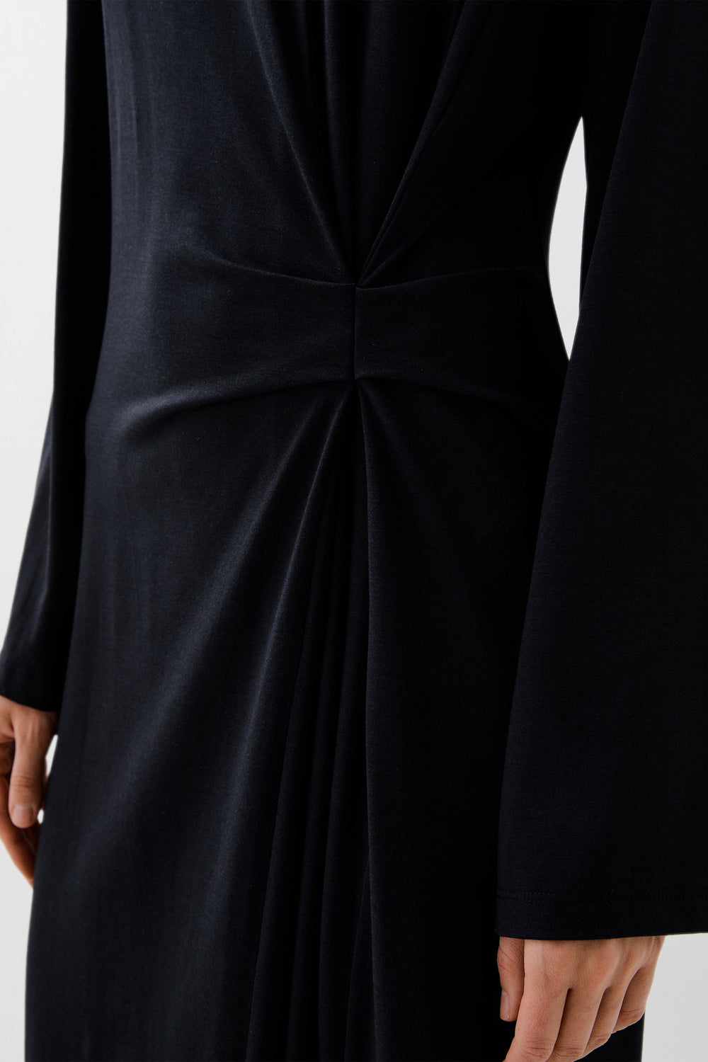 Vestido fluido confeccionado en material fluido ligeramente elástico. Corte regular fit, cuello redondo y manga larga. Detalle de nudo en cintura.