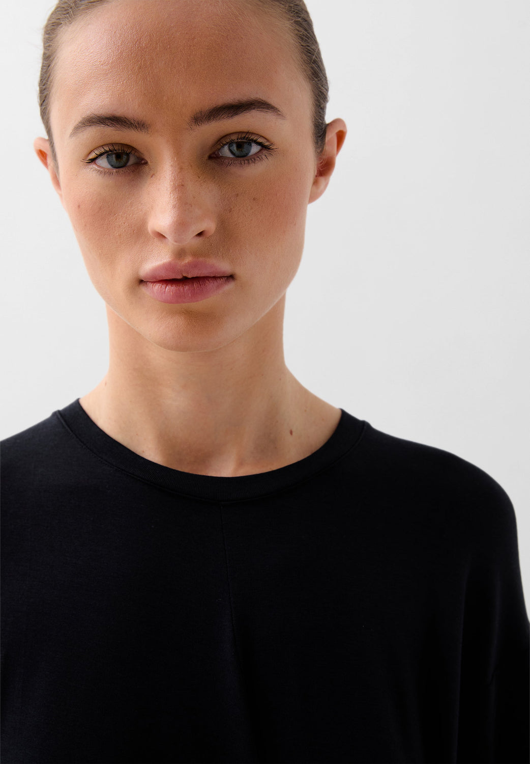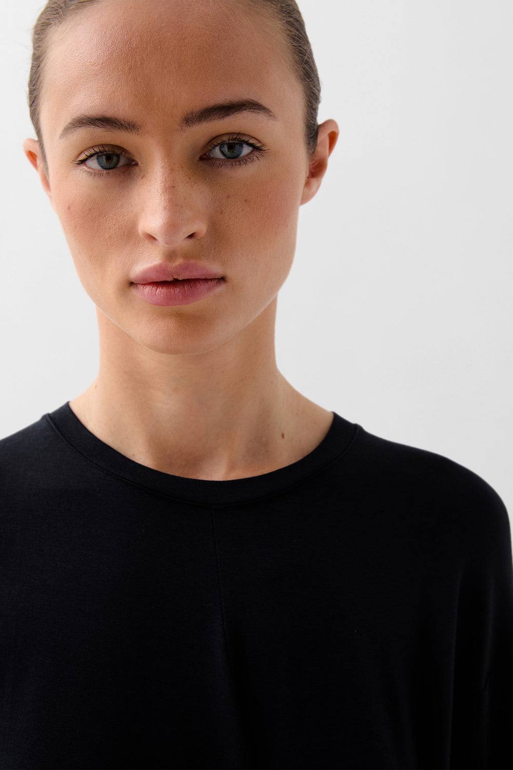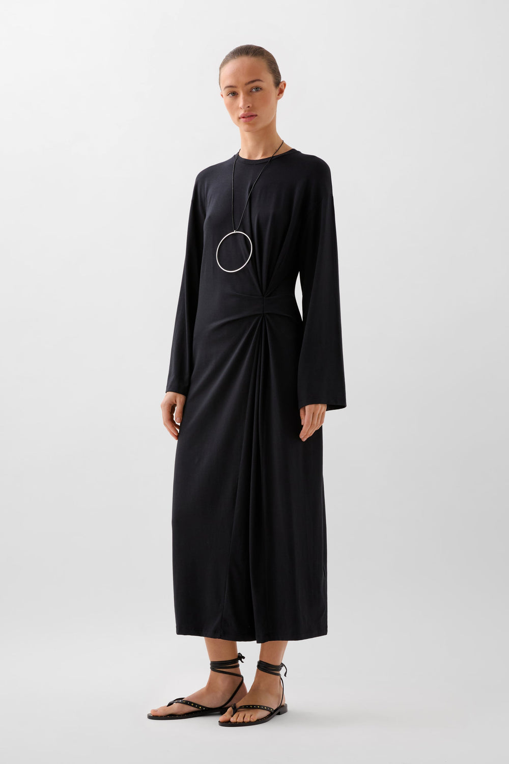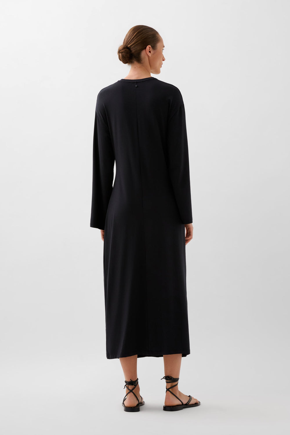 Vestido fluido confeccionado en material fluido ligeramente elástico. Corte regular fit, cuello redondo y manga larga. Detalle de nudo en cintura.