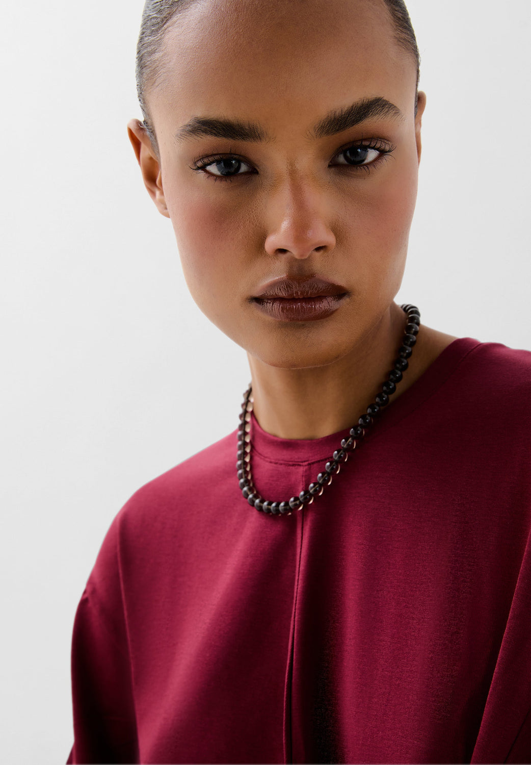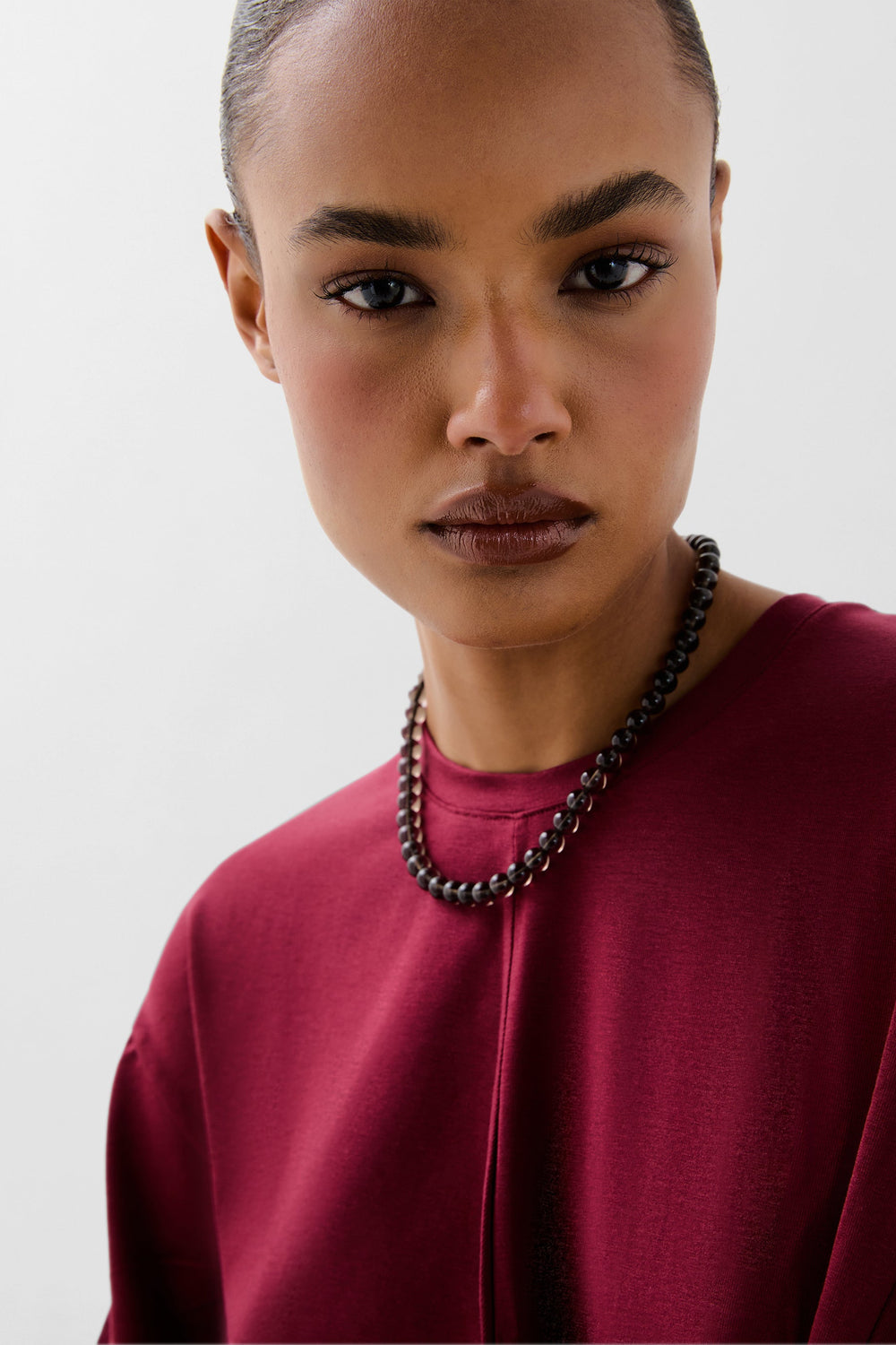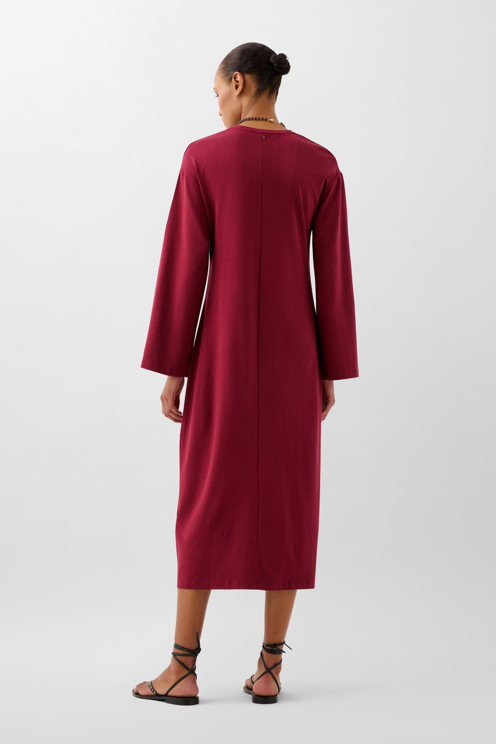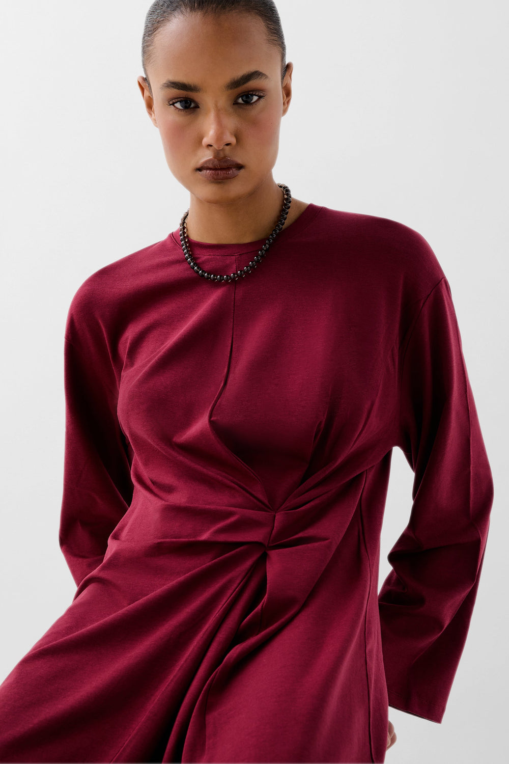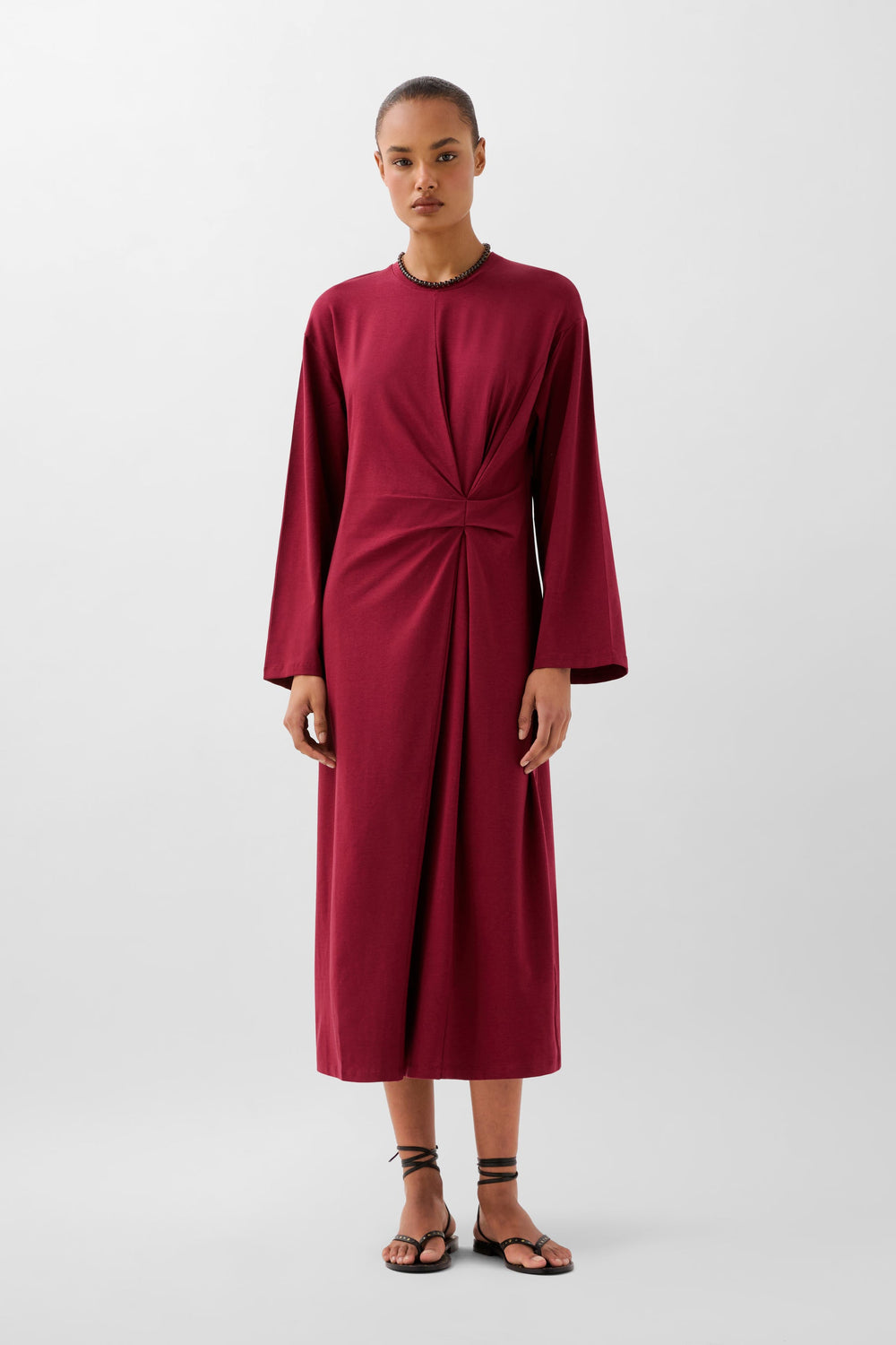 Vestido fluido confeccionado en material fluido ligeramente elástico. Corte regular fit, cuello redondo y manga larga. Detalle de nudo en cintura.