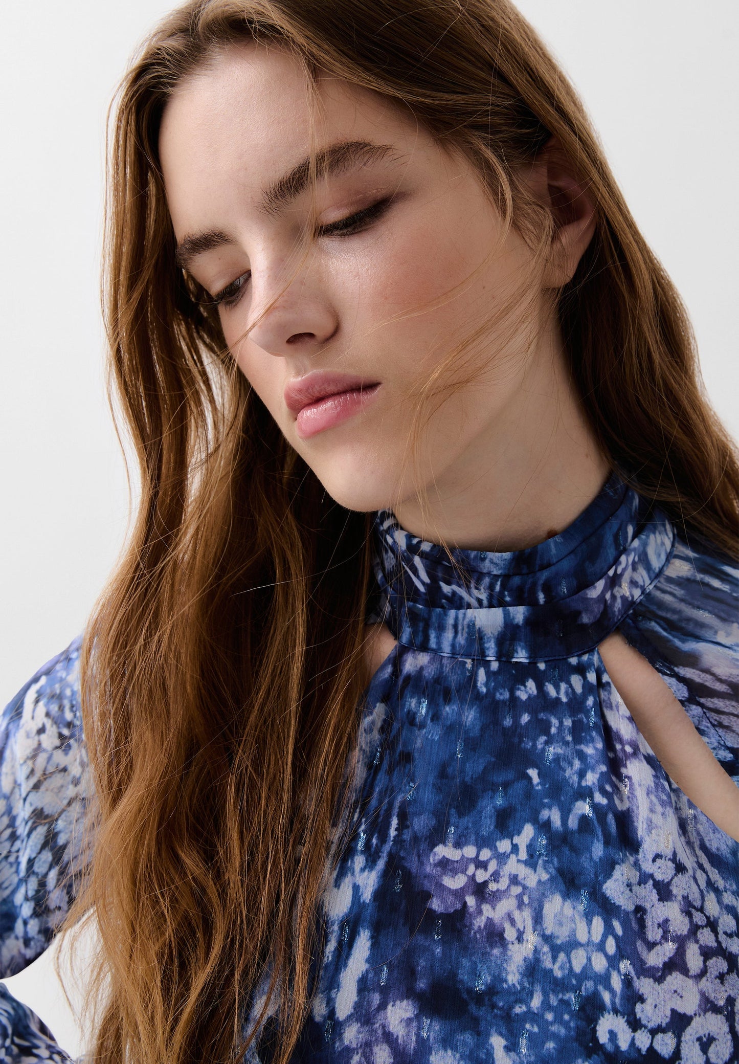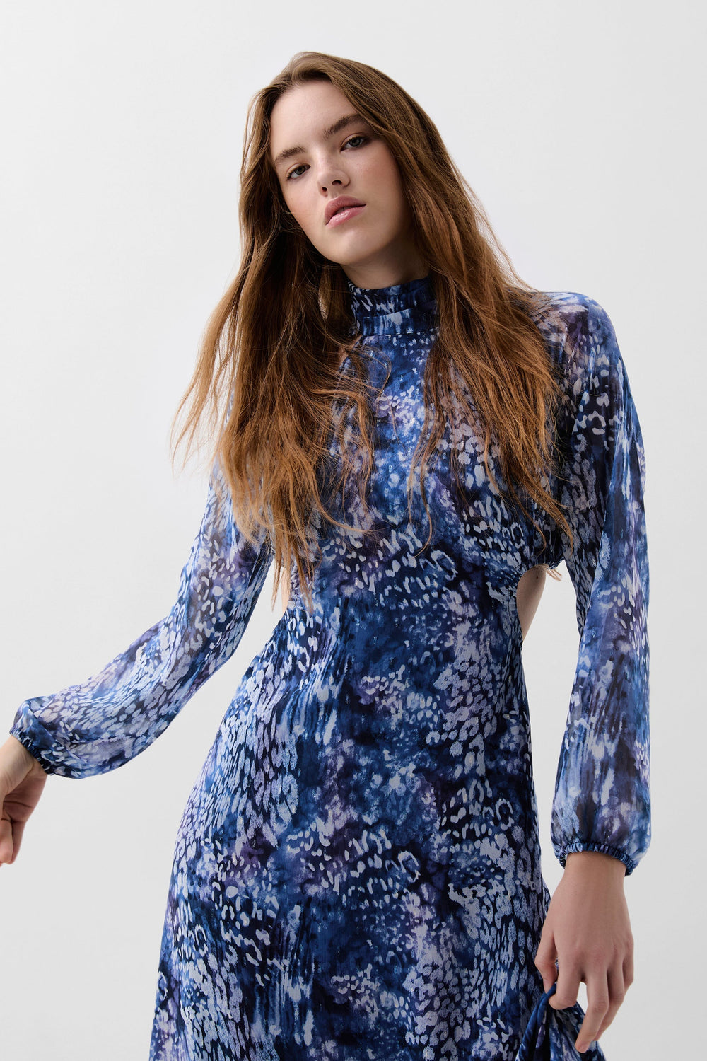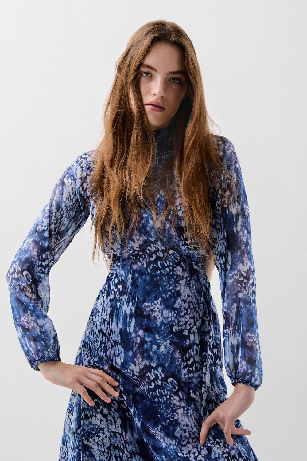 Vestido midi con print confeccionado en tejido fluido. Regular fit, cuello subido y cierre con botón. Aberturas en el escote y abertura trasera con goma.