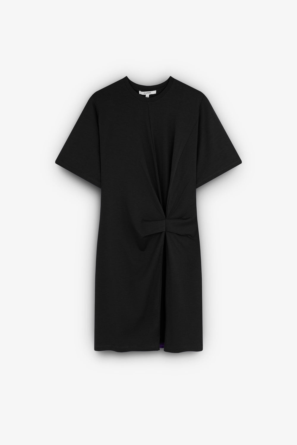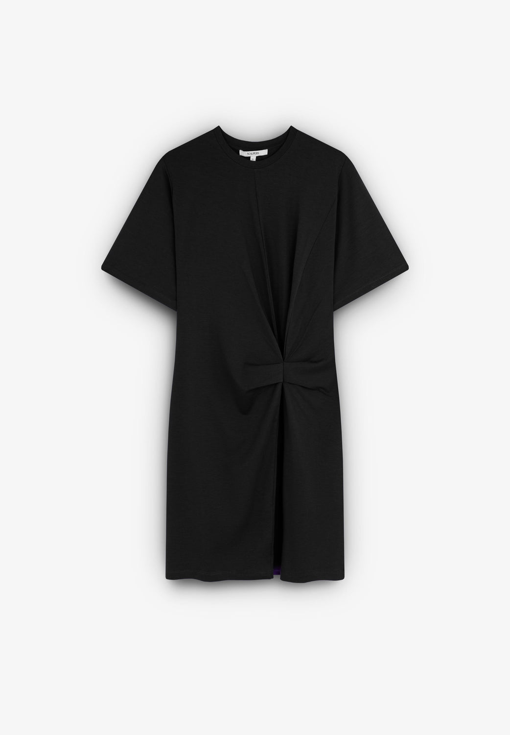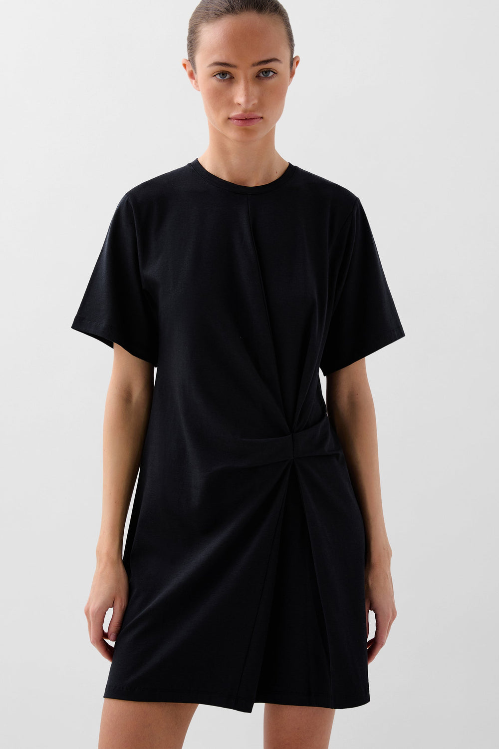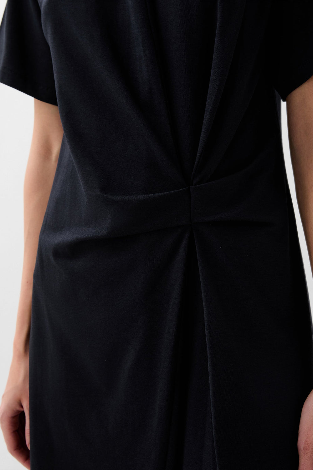 Vestido mini confeccionado en tejido fluido ligeramente elástico. Corte regular fit, cuello redondo y manga corta con detalle de nudo en cintura.
