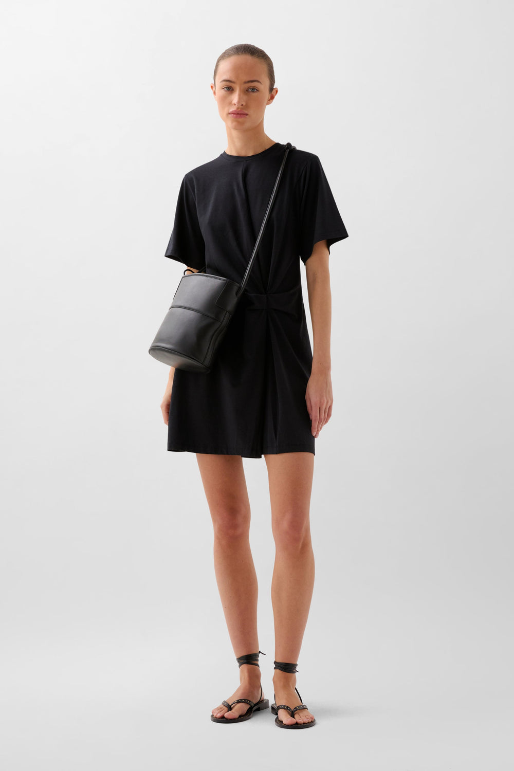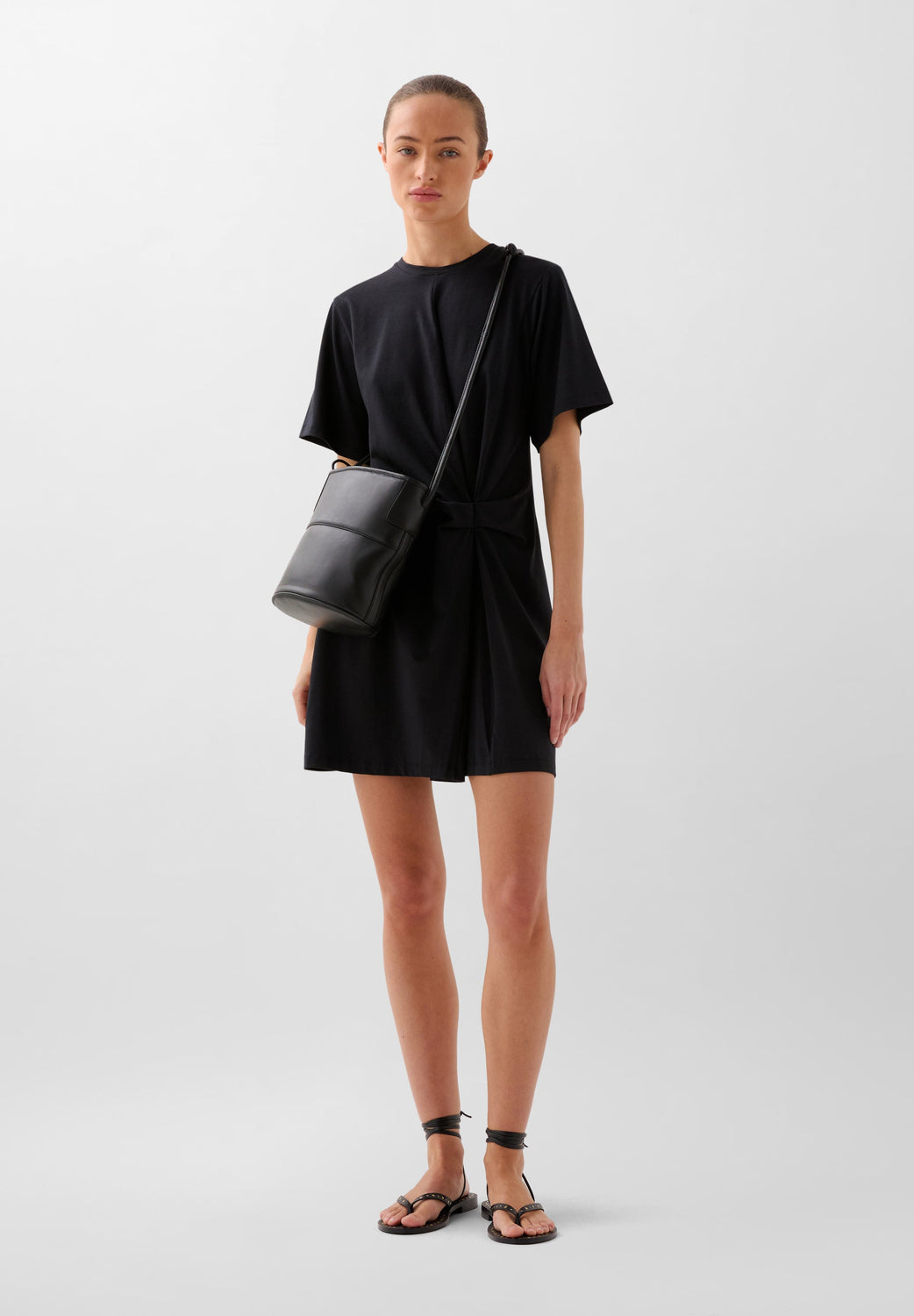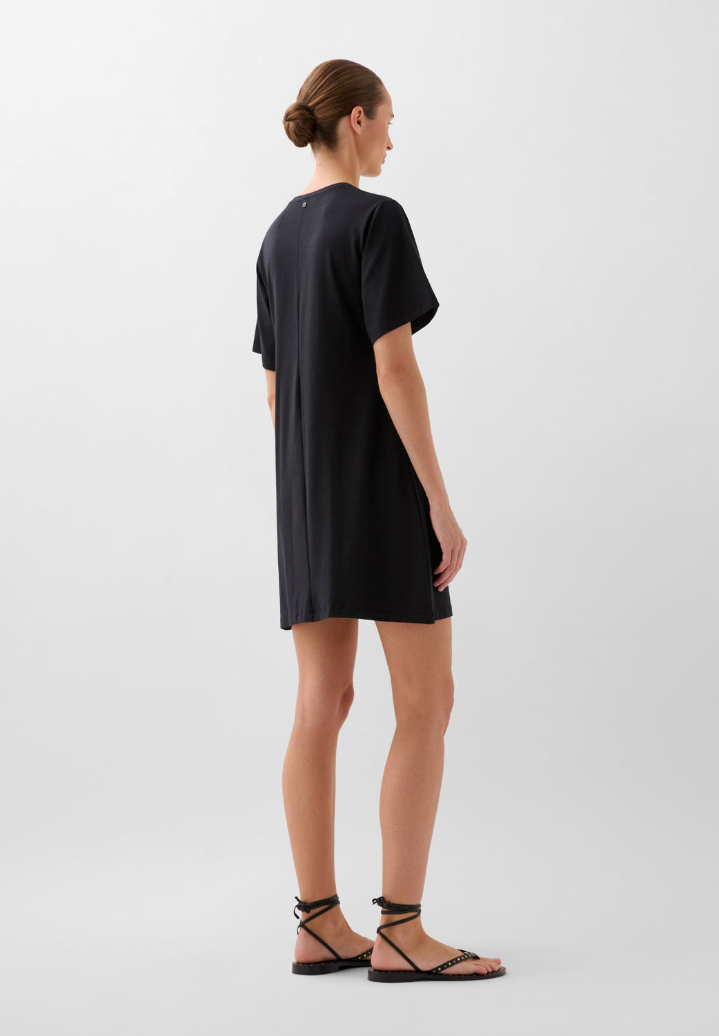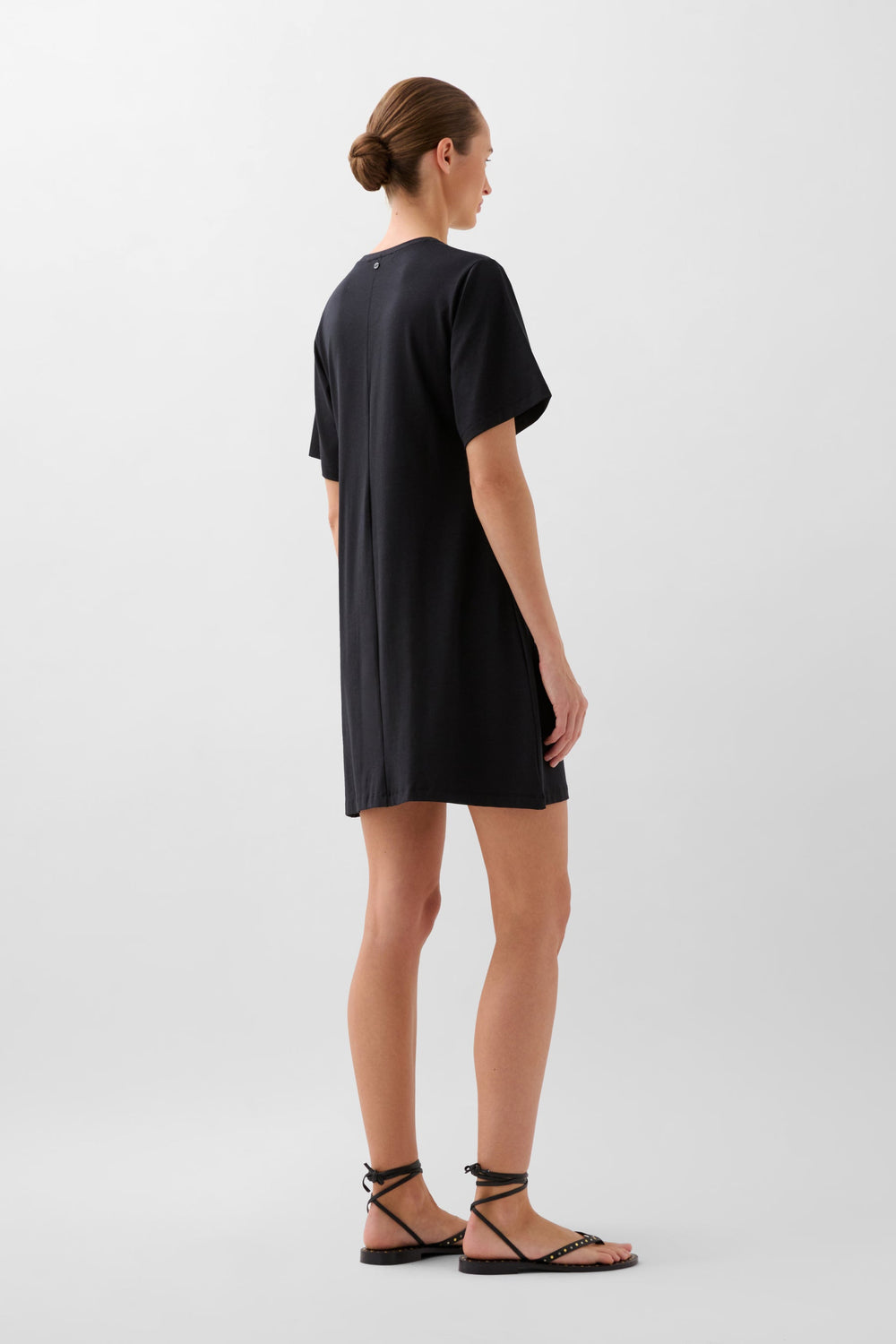 Vestido mini confeccionado en tejido fluido ligeramente elástico. Corte regular fit, cuello redondo y manga corta con detalle de nudo en cintura.
