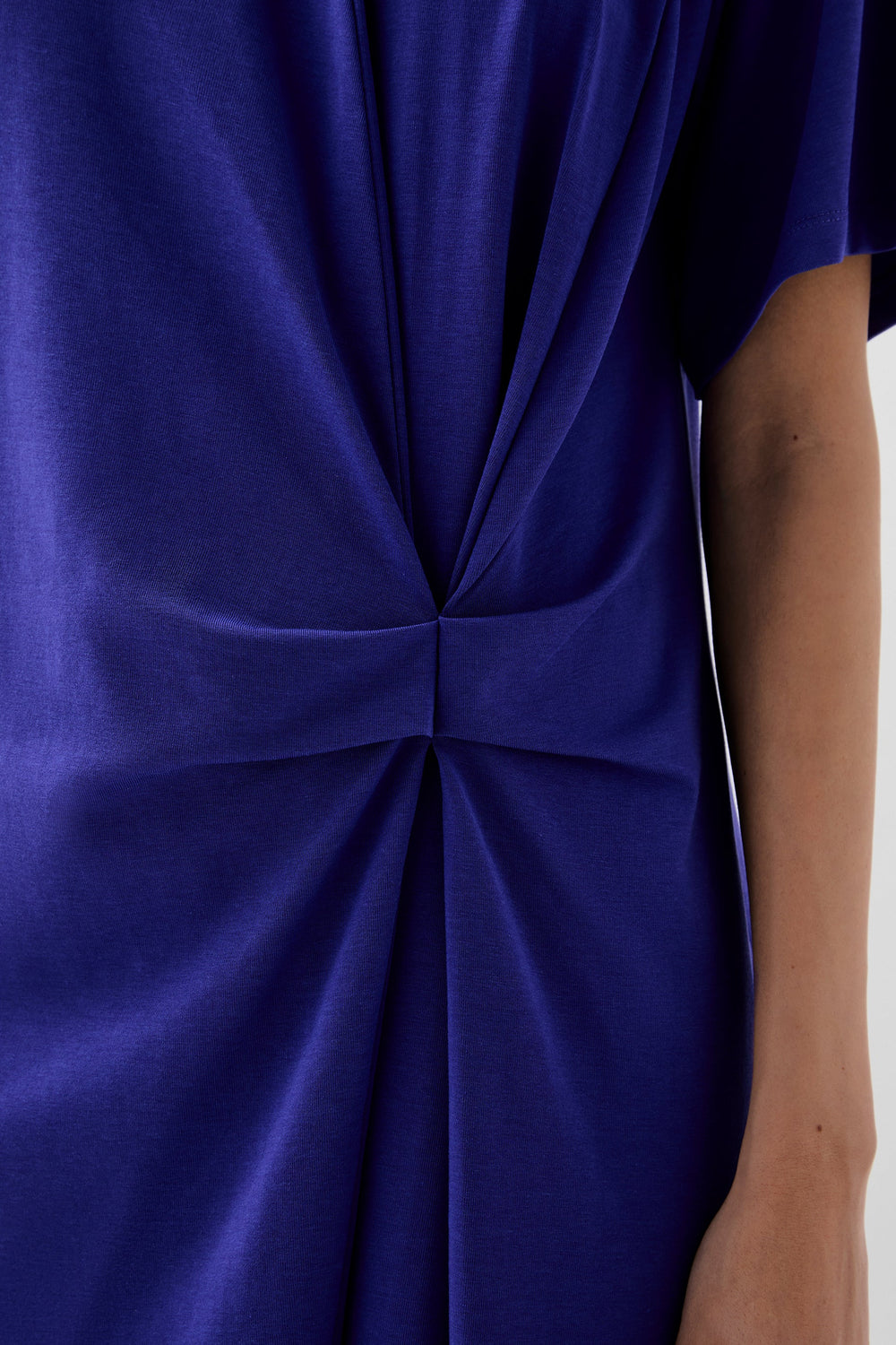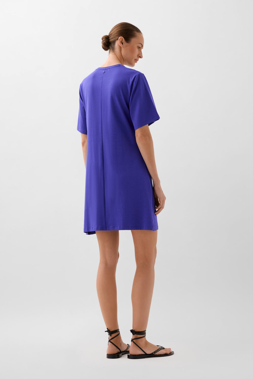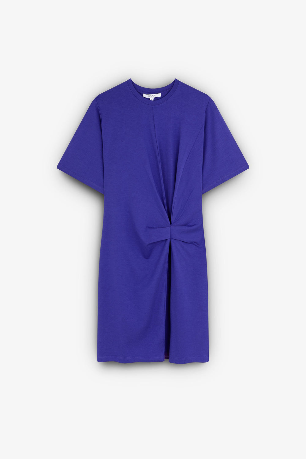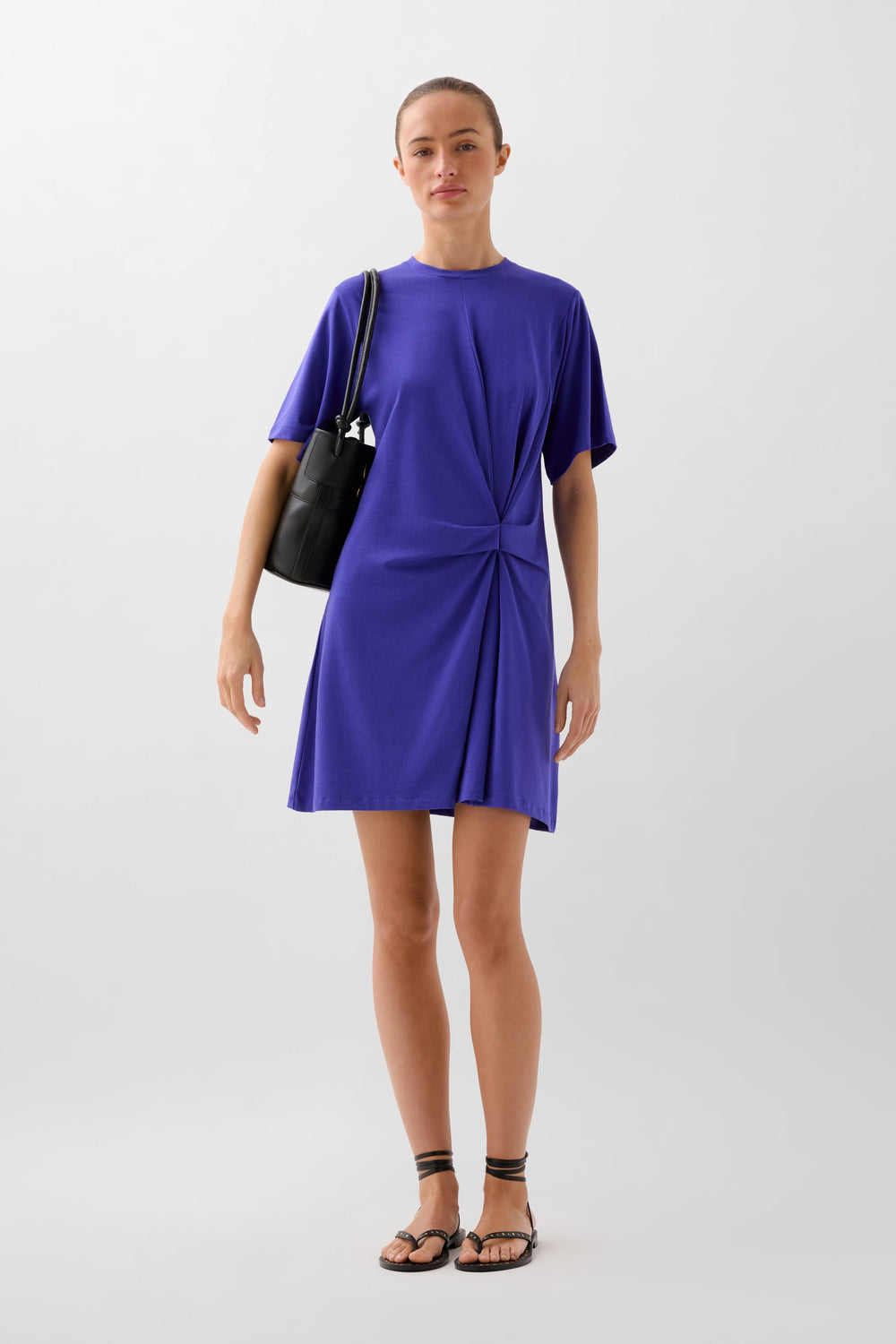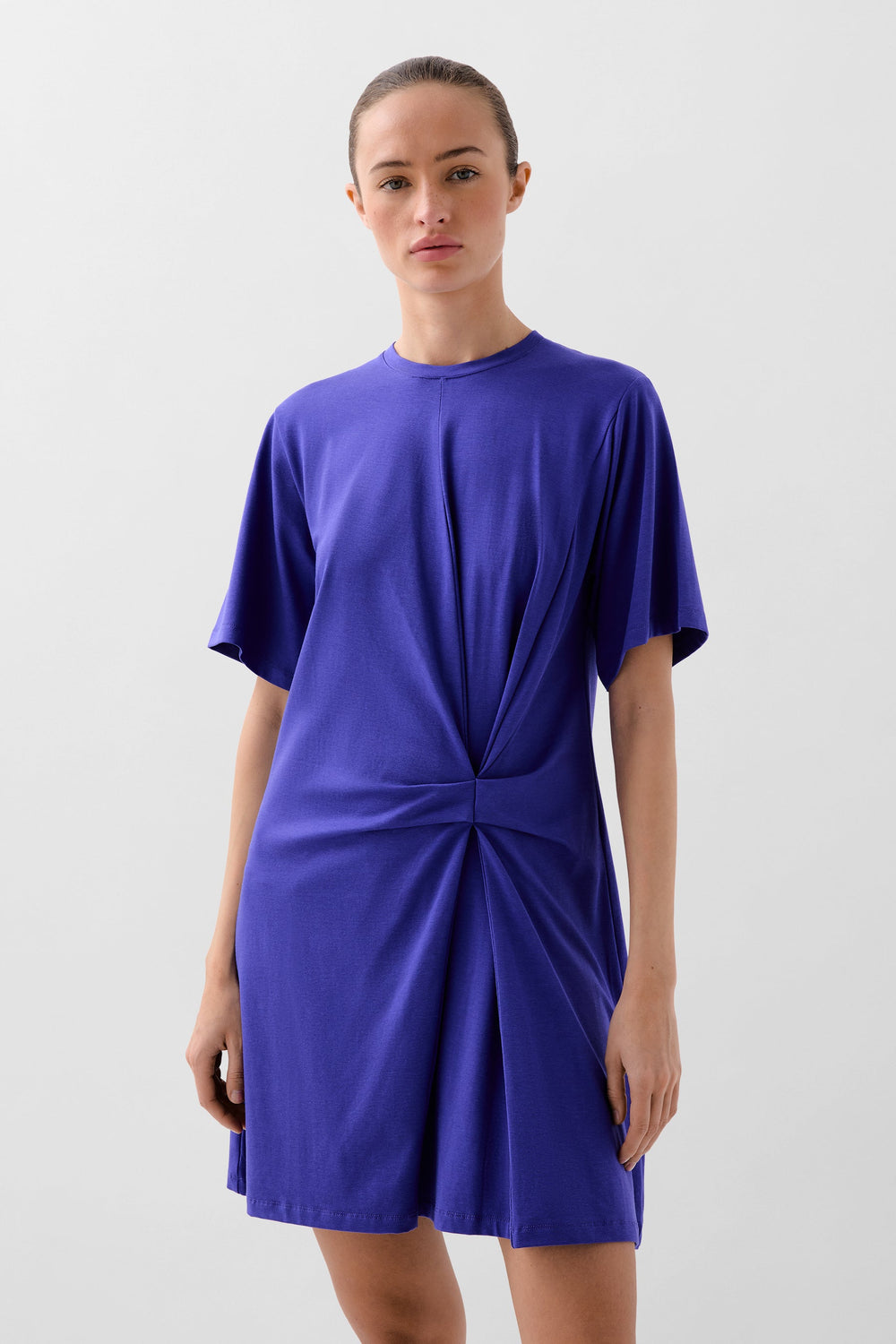 Vestido mini confeccionado en tejido fluido ligeramente elástico. Corte regular fit, cuello redondo y manga corta con detalle de nudo en cintura.
