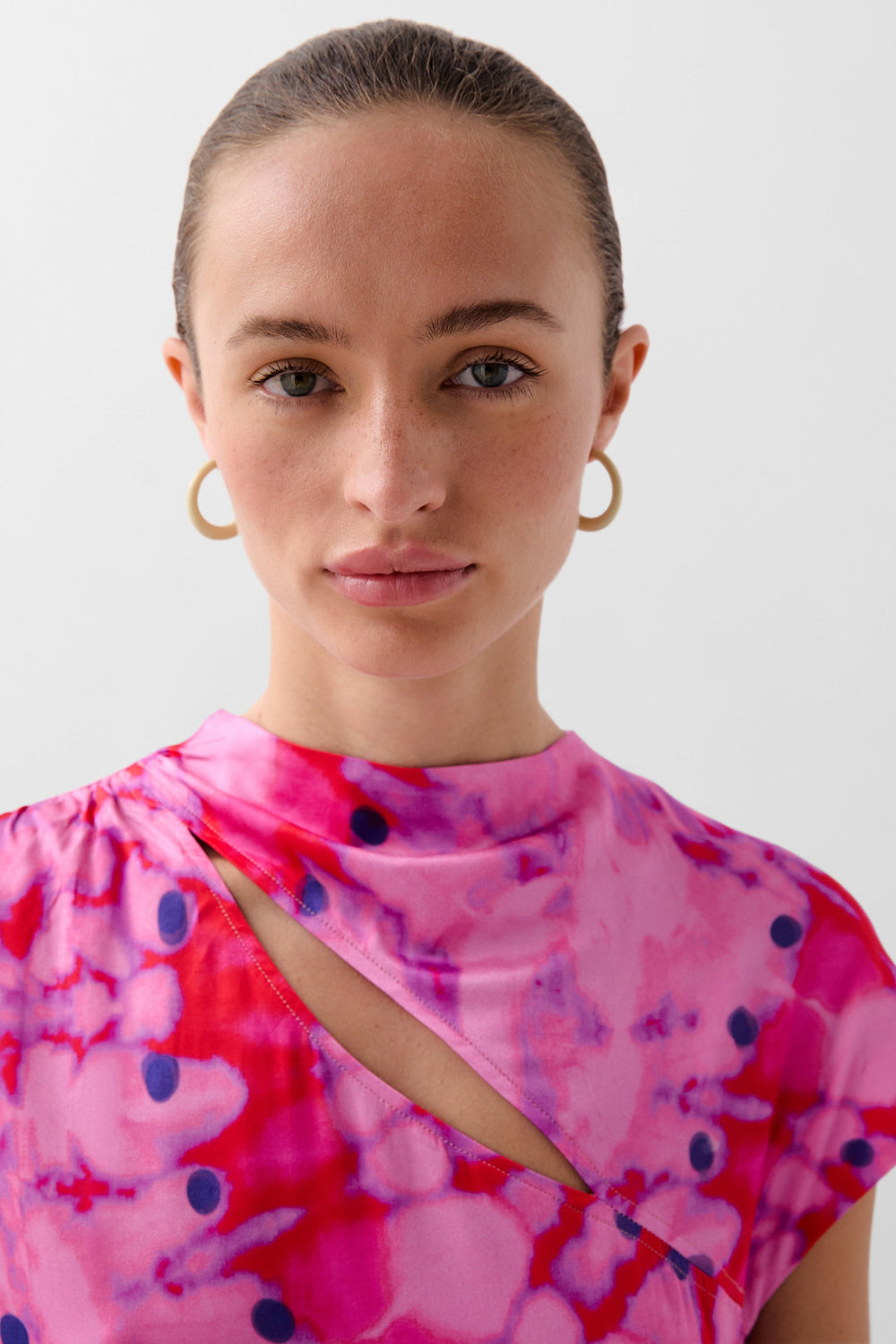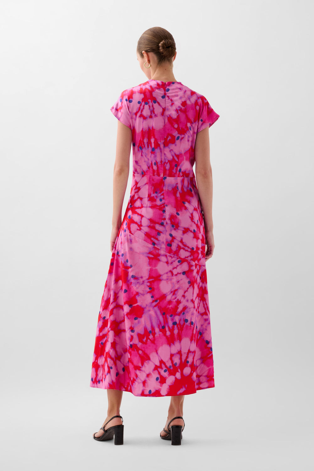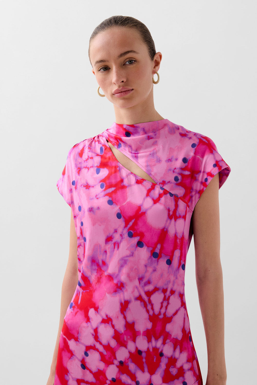 Vestido confeccionado en tejido fluido con estampado tie dye. Corte midi, cuello subido con detalle de abertura asimétrica en pecho y cierre con cremallera trasera. Manga corta y abertura lateral.