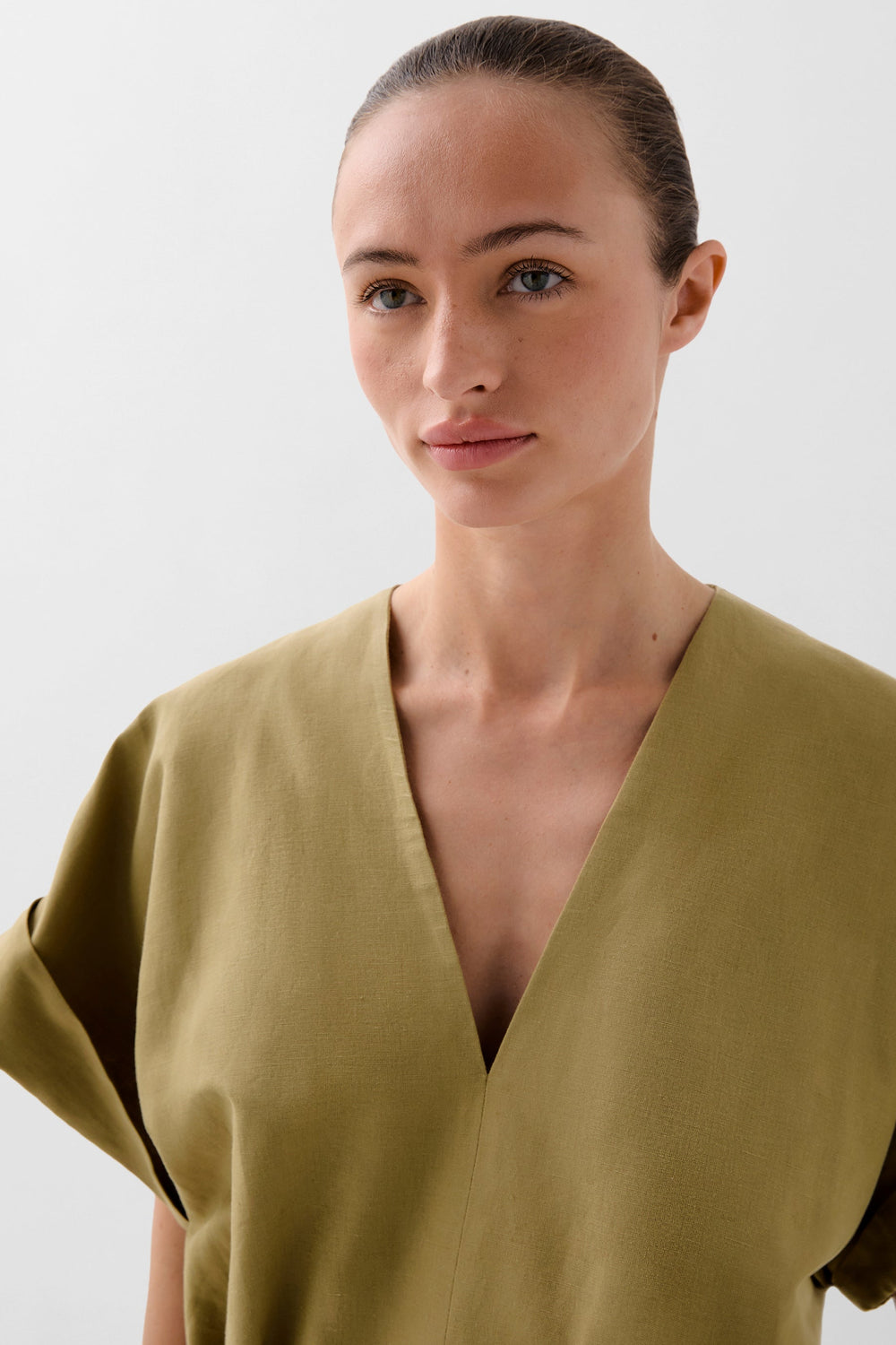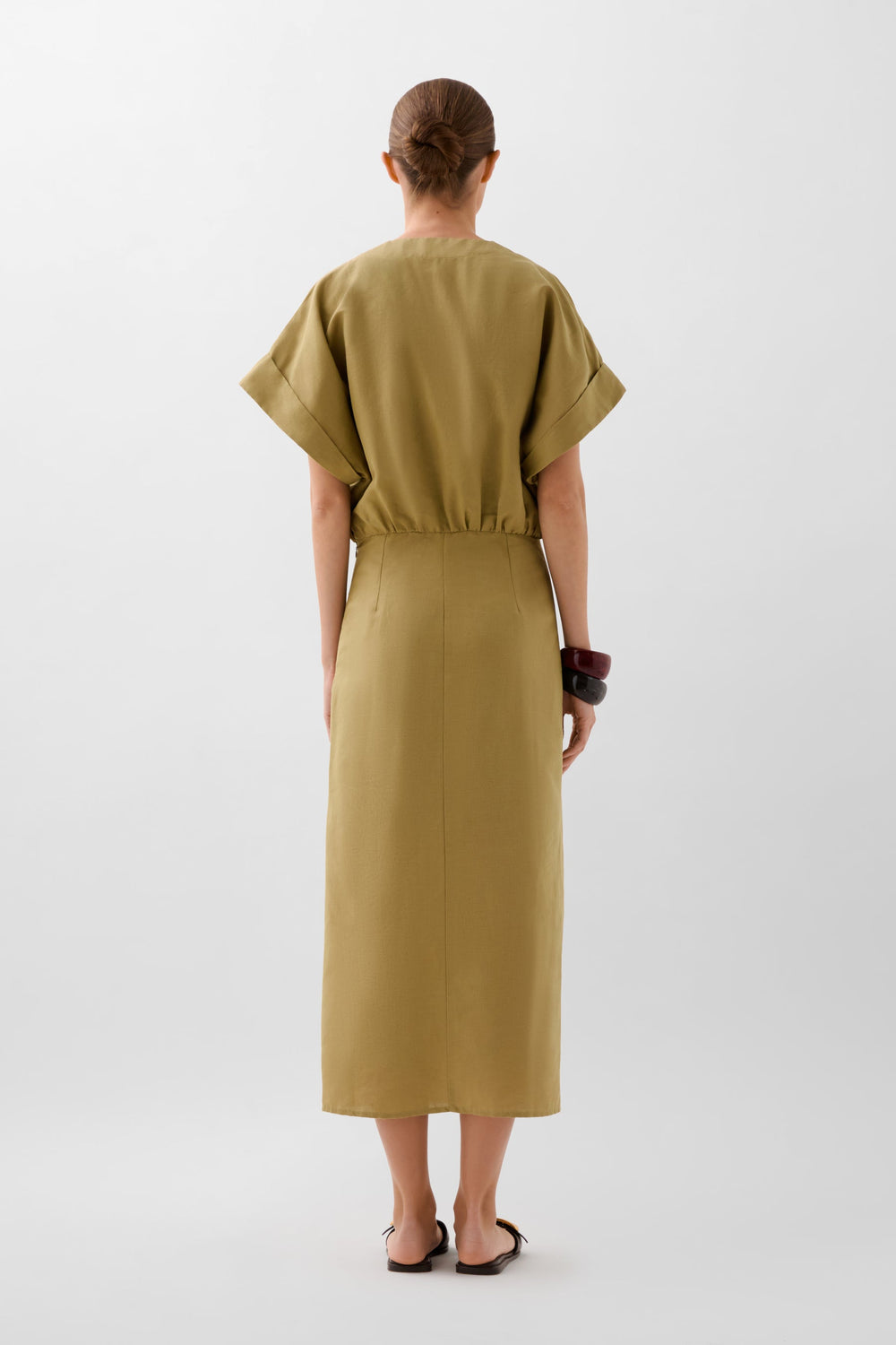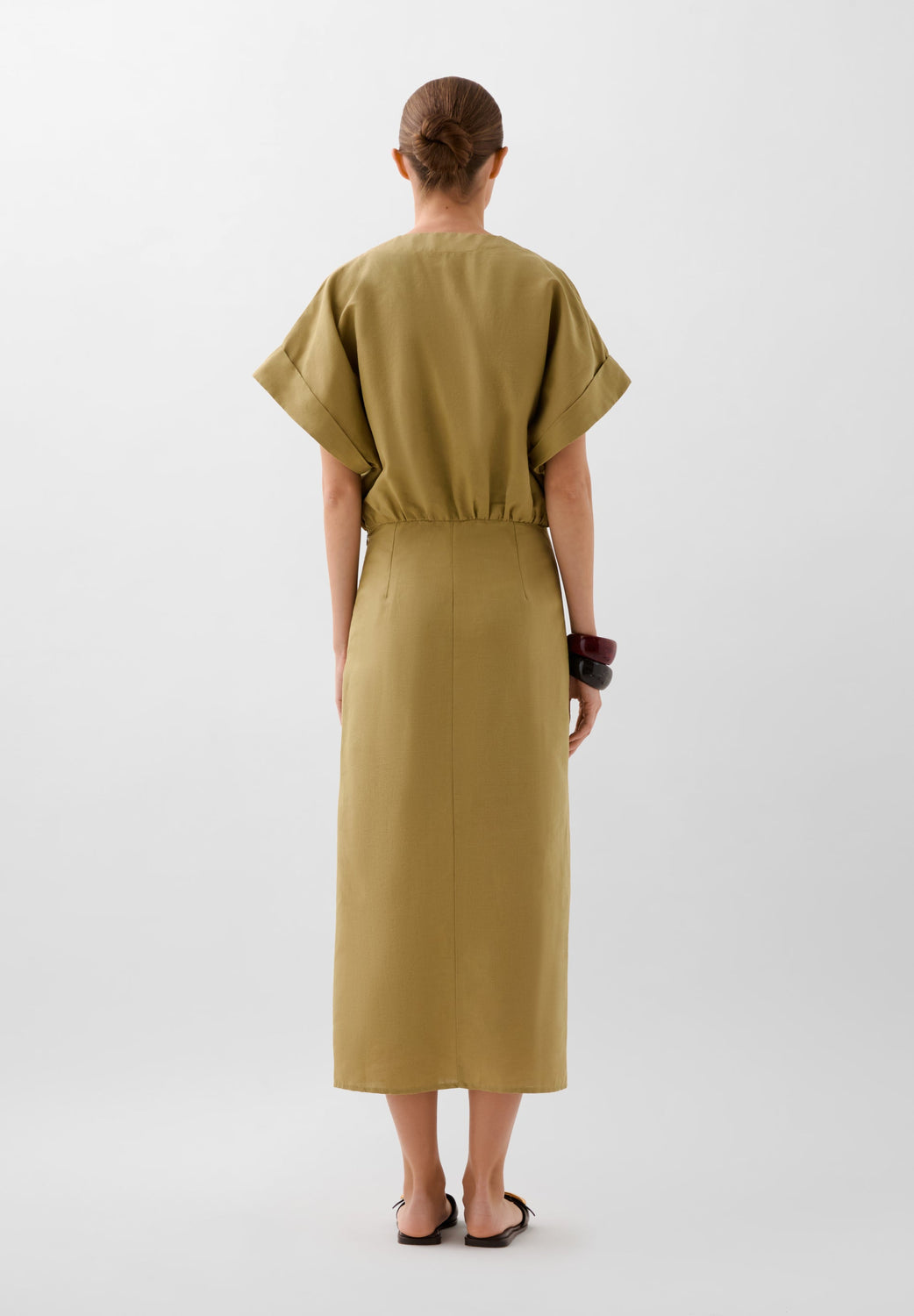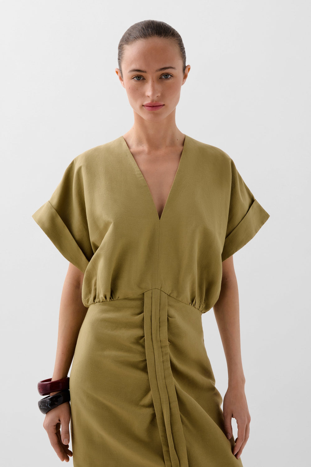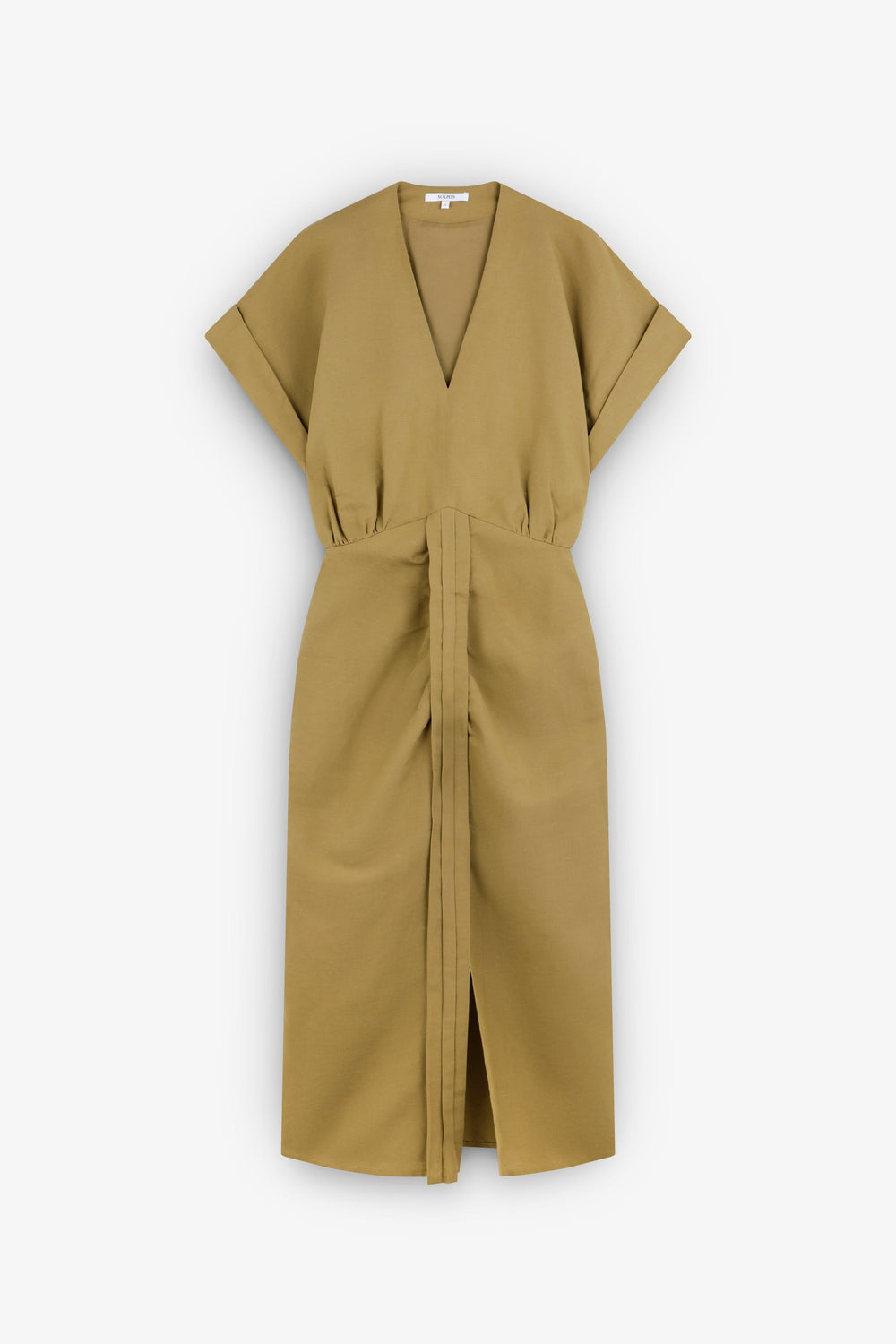 Vestido midi con detalle de frunce frontal. Confeccionado en mezcla de lino y algodón. Corte Regular fit. Escote de pico. Cierre con cremallera. Manga en sisa. Abertura delantera