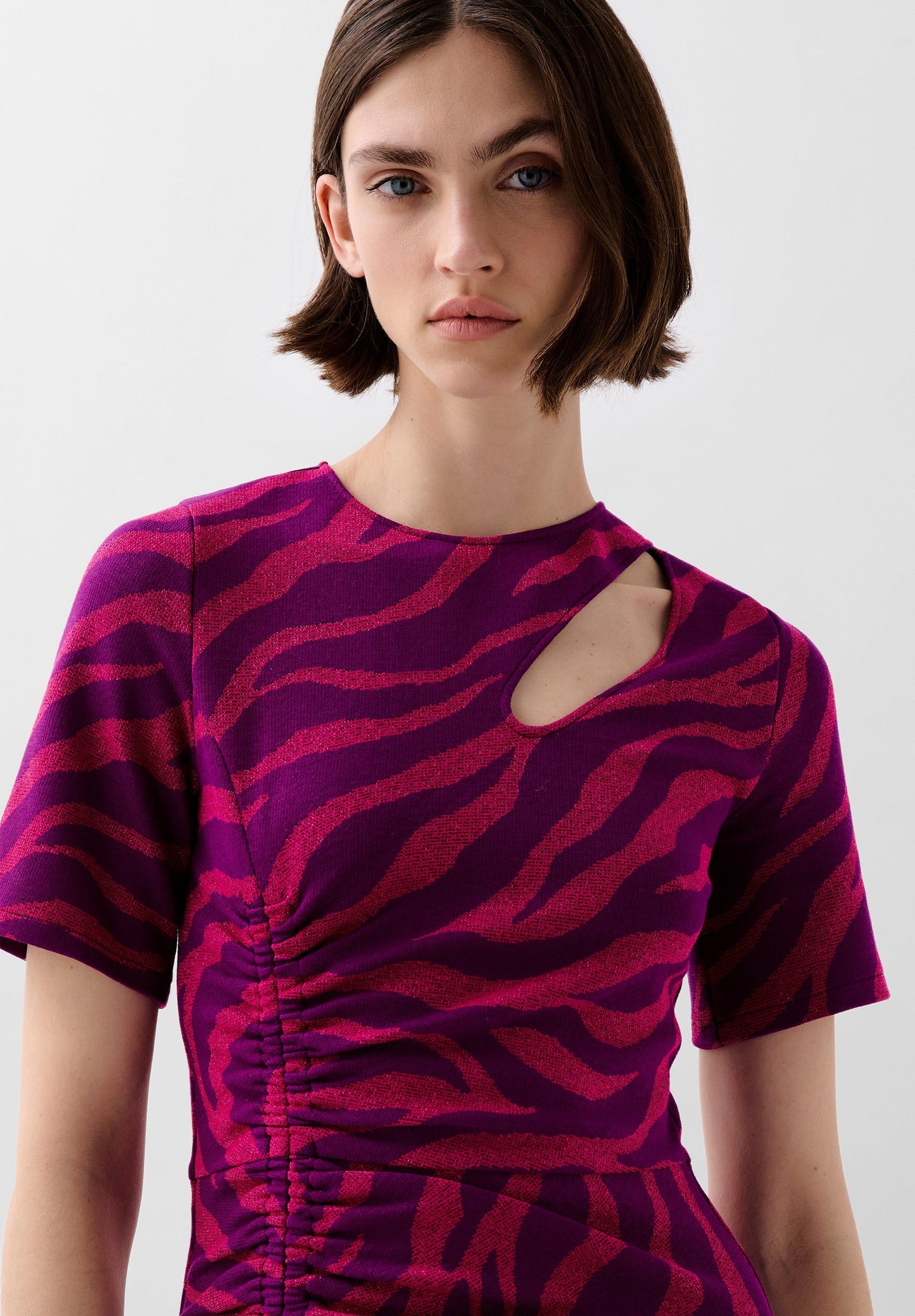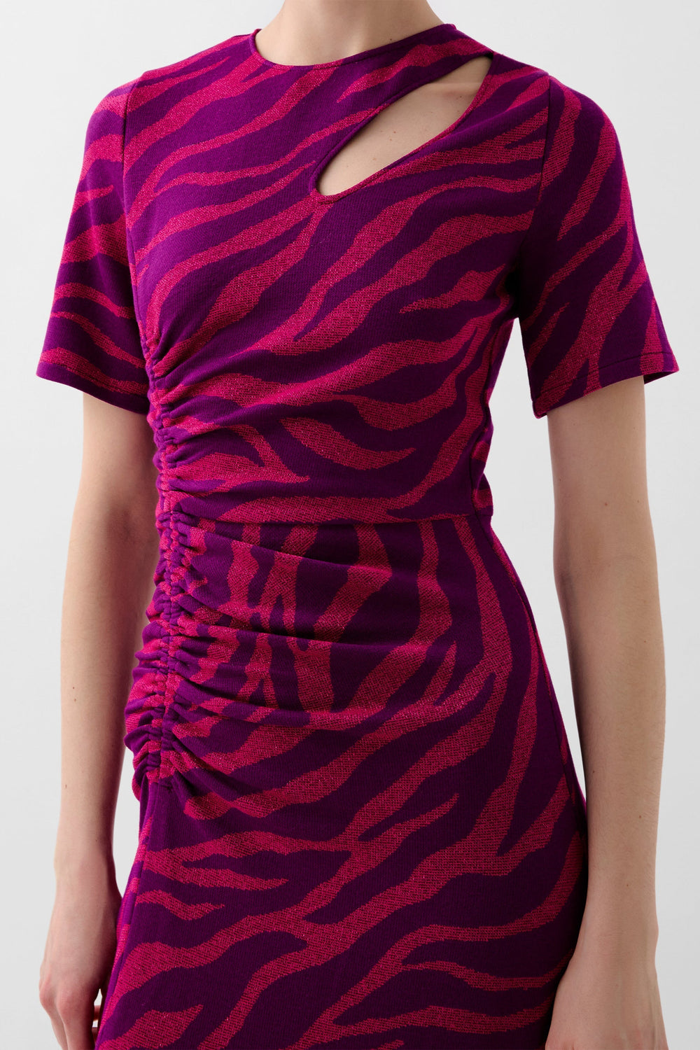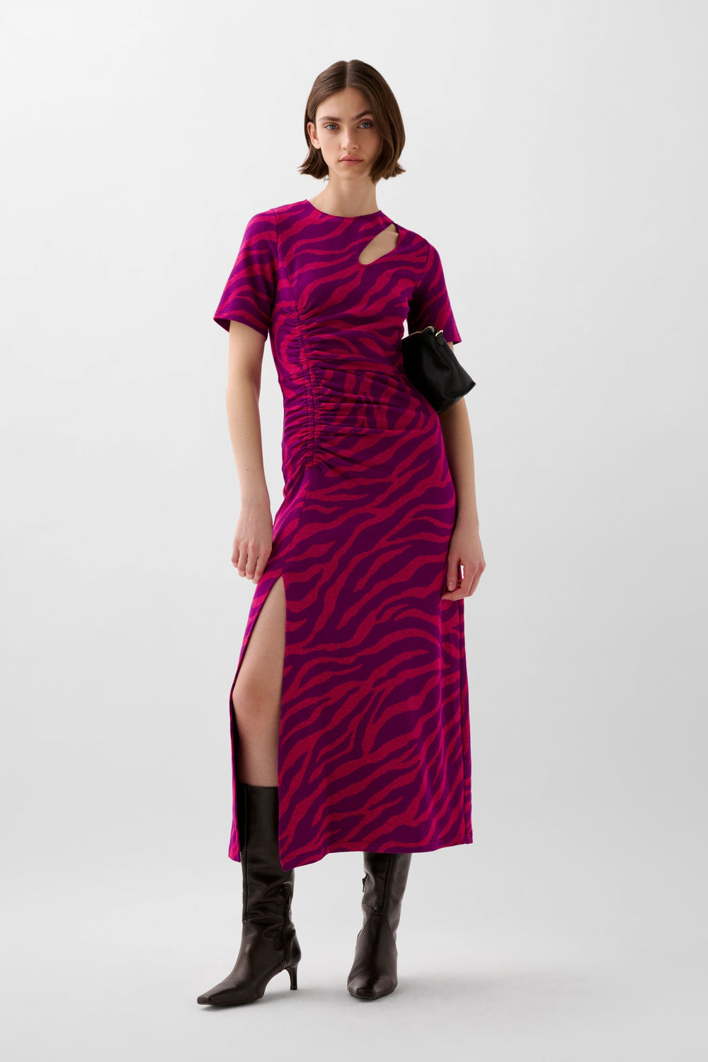 Vestido confeccionado en punto ligeramente elástico con estampado animal print. Corte midi, cuello redondo y cierre con cremallera trasera. Manga corta y detalle de abertura en forma de lágrima en parte superior, frunce en cintura y abertura en pierna.