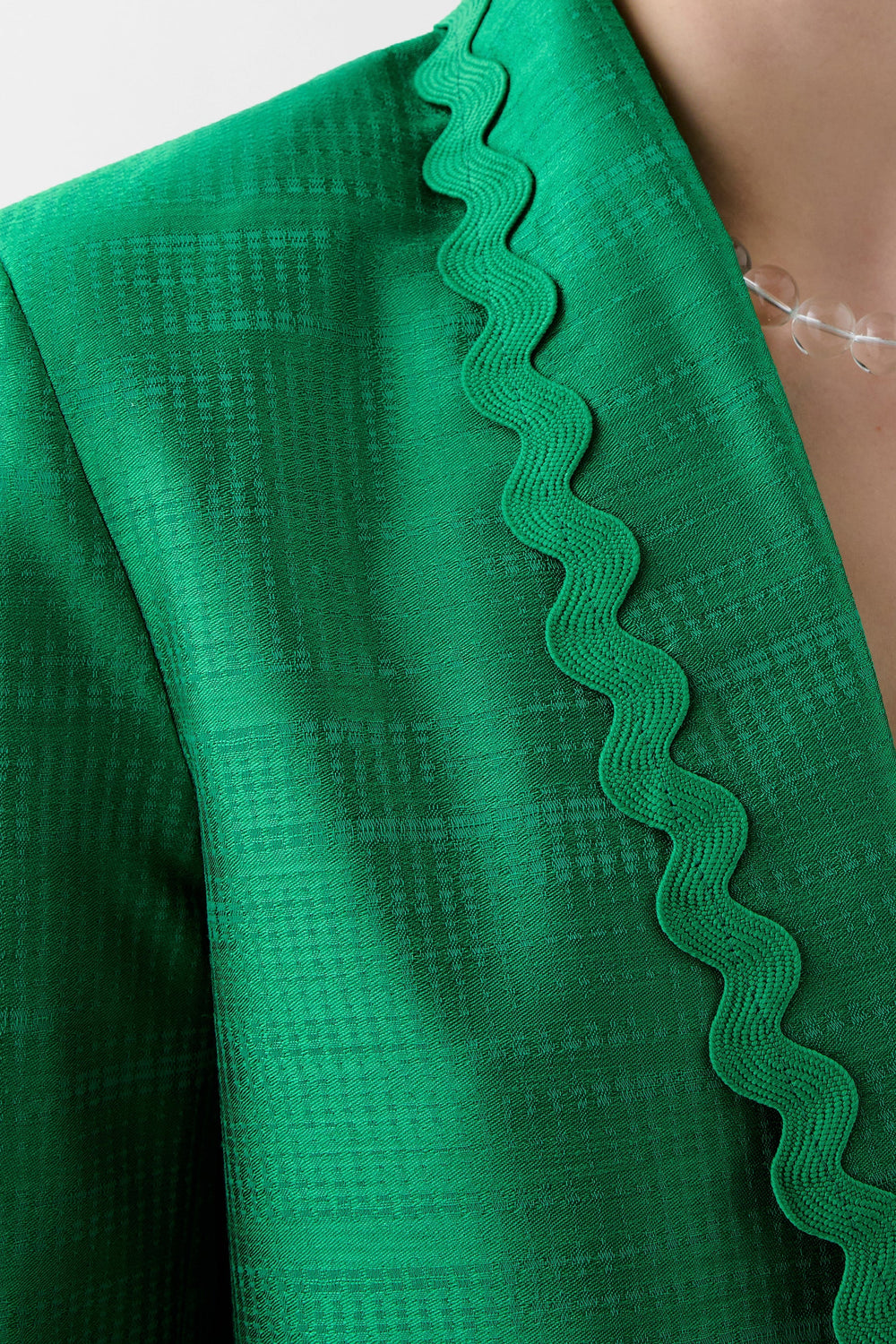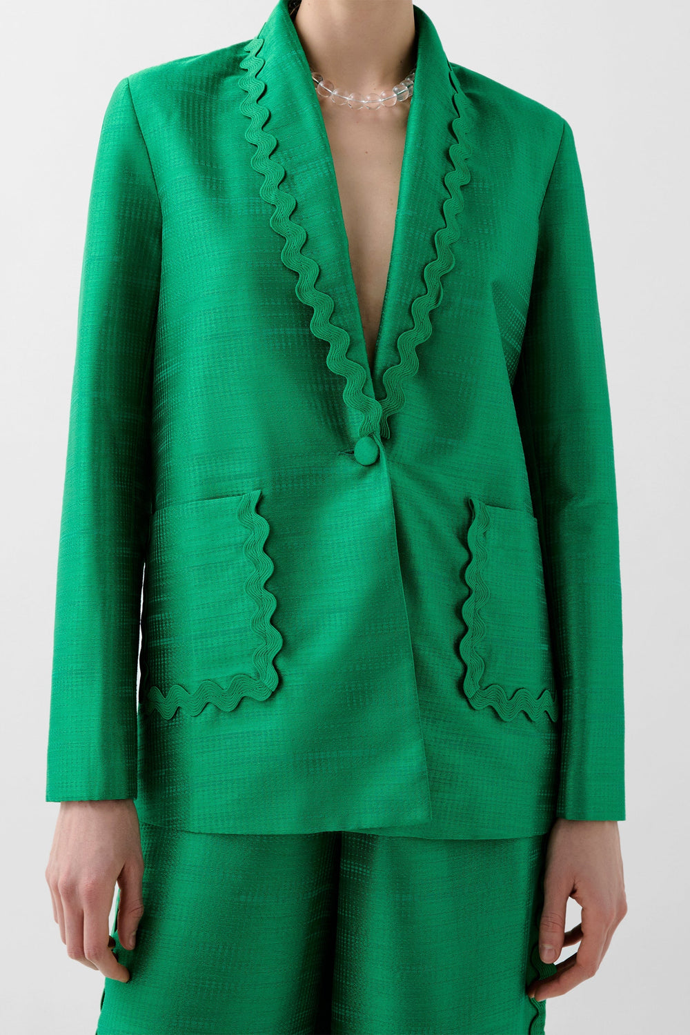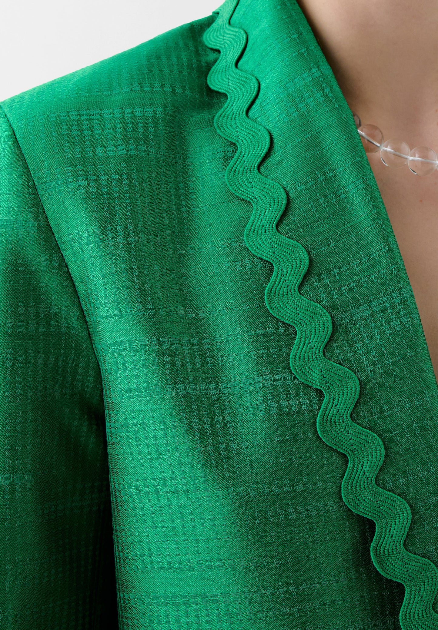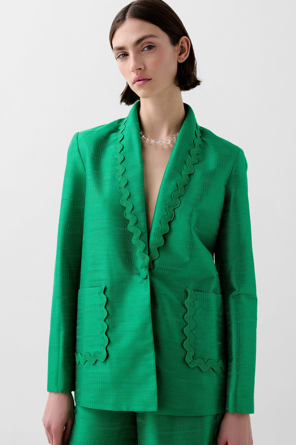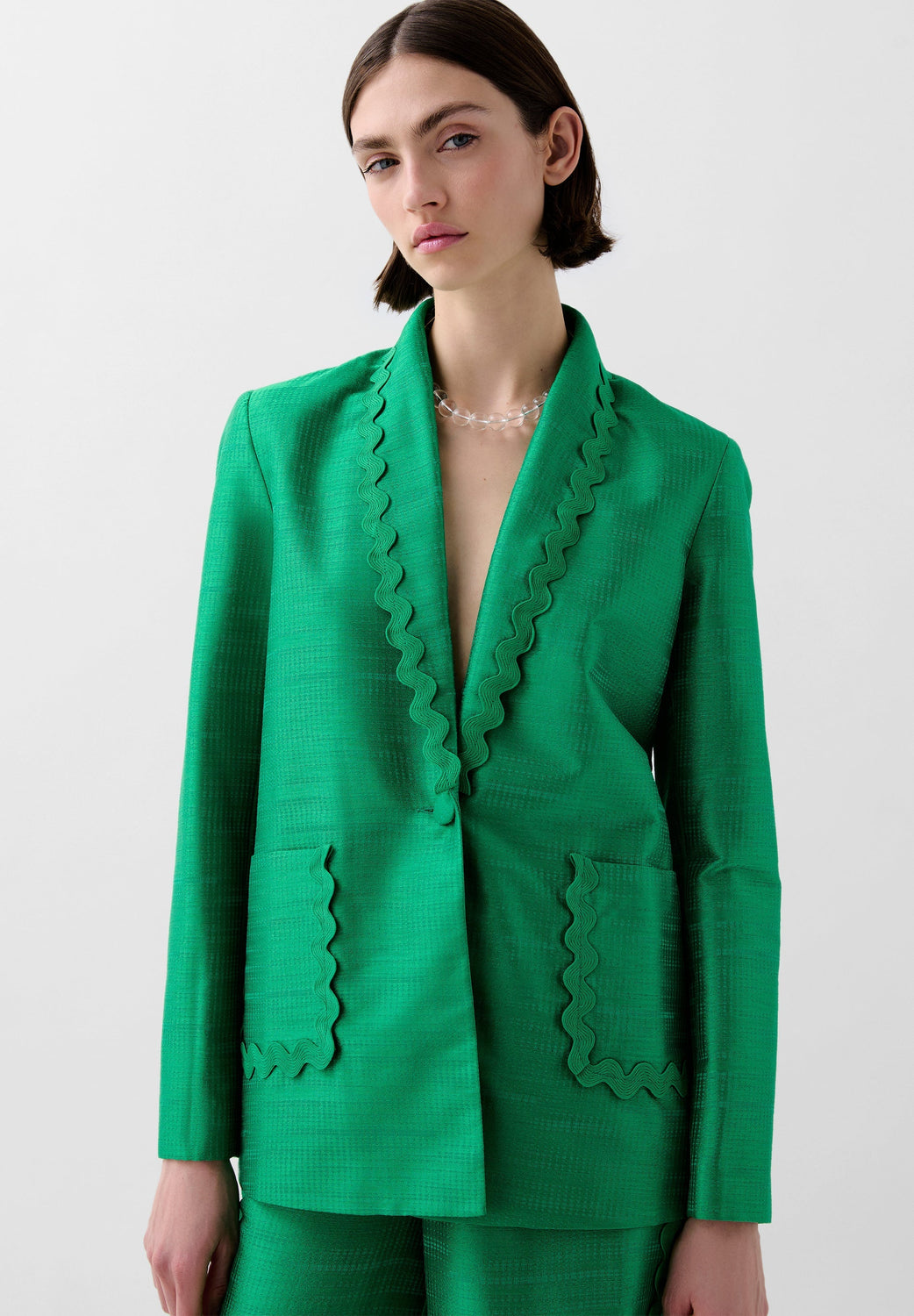 Blazer confeccionada en tejido ligeramente satinado. Regular fit con estructura, cuello con solapas y cierre con botón. Manga larga con hombreras y bolsillos de parche. Detalle de ondas en solapas y bolsillos.