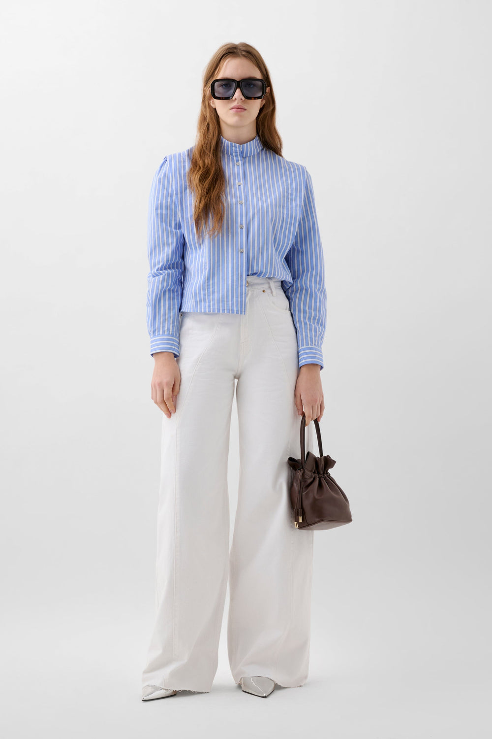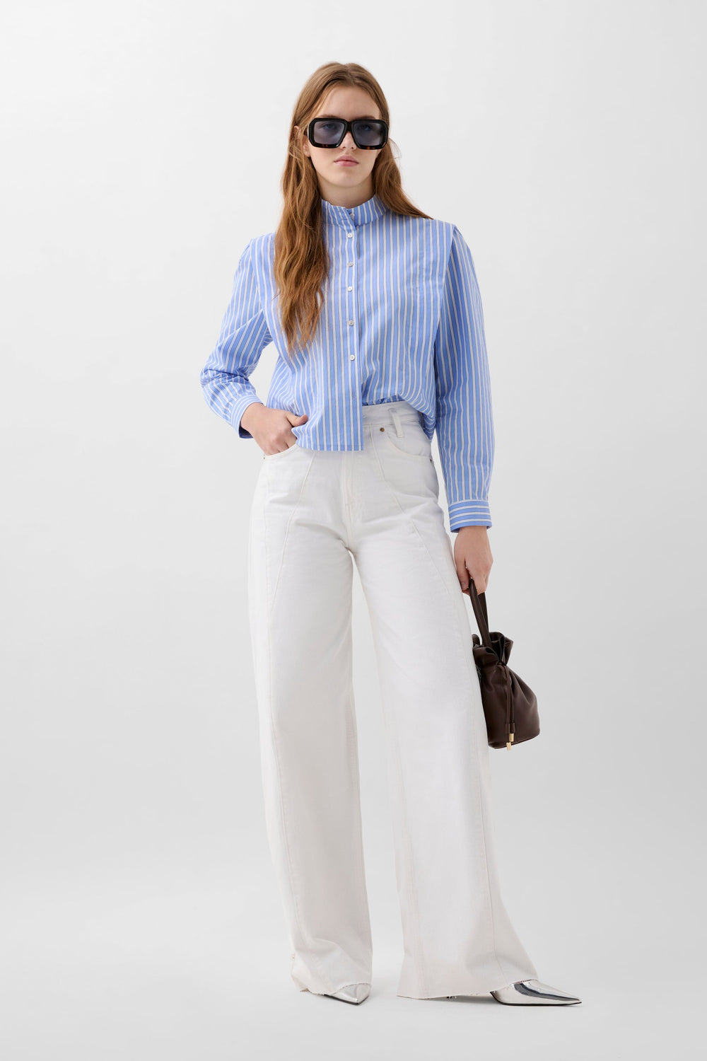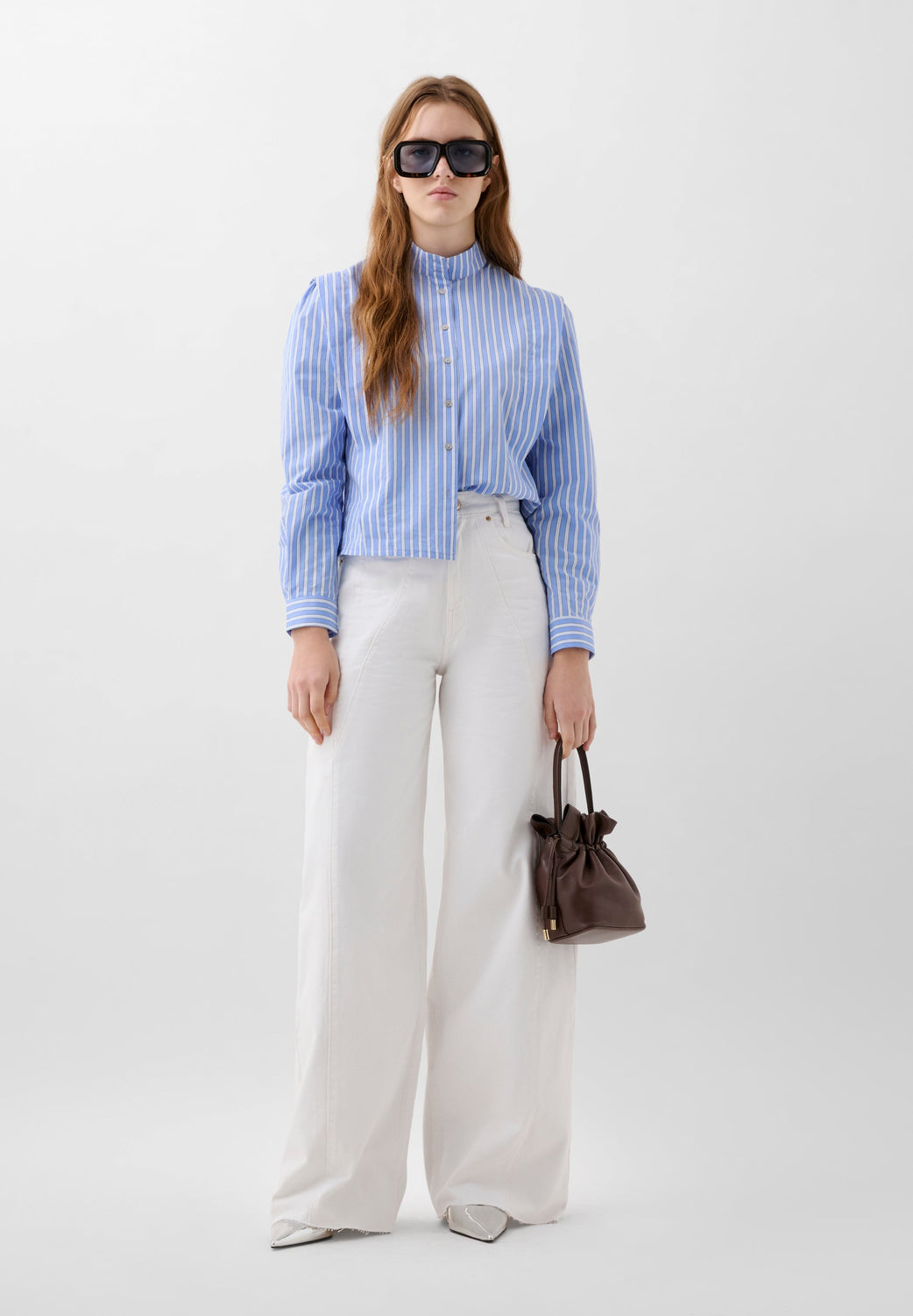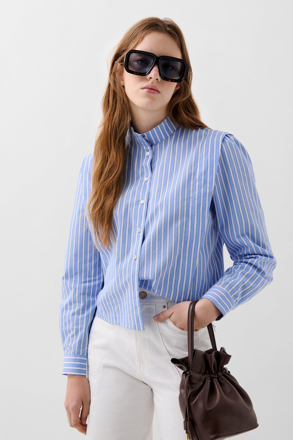 Camisa de rayas con detalle de frunce en el hombro. Confeccionada en mezcla de algodón. Corte cropped cuello subido y cierre de botones. Terminación de botones en el puño.