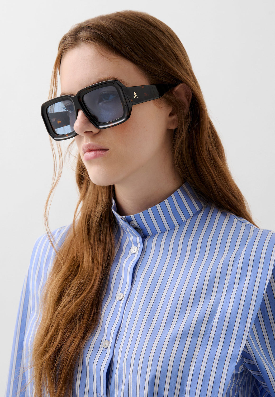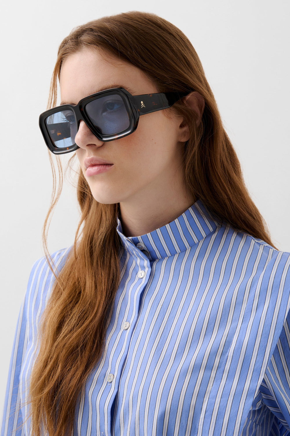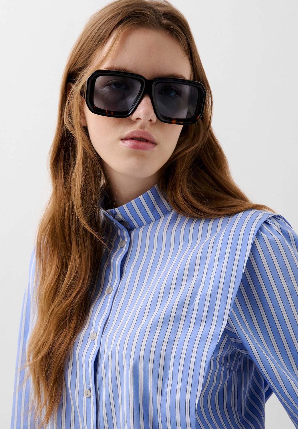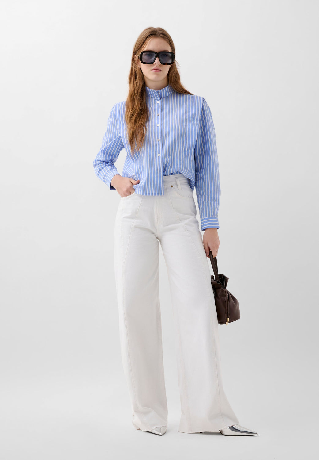 Camisa de rayas con detalle de frunce en el hombro. Confeccionada en mezcla de algodón. Corte cropped cuello subido y cierre de botones. Terminación de botones en el puño.