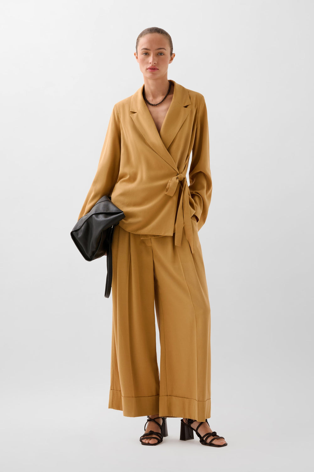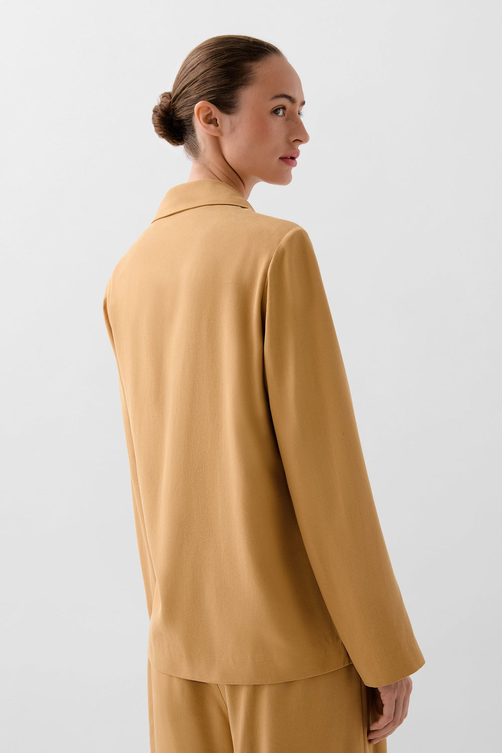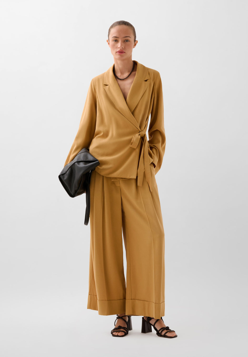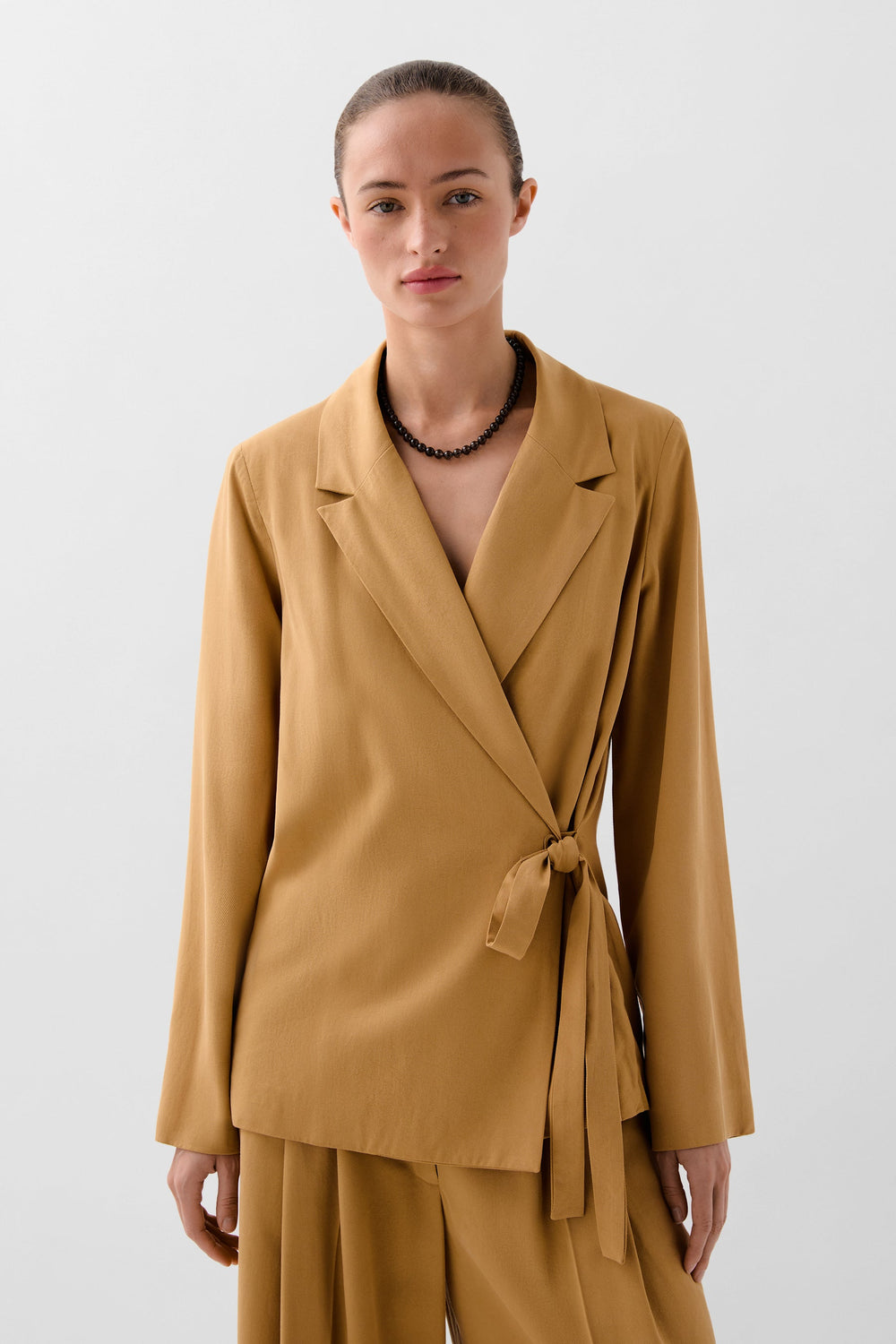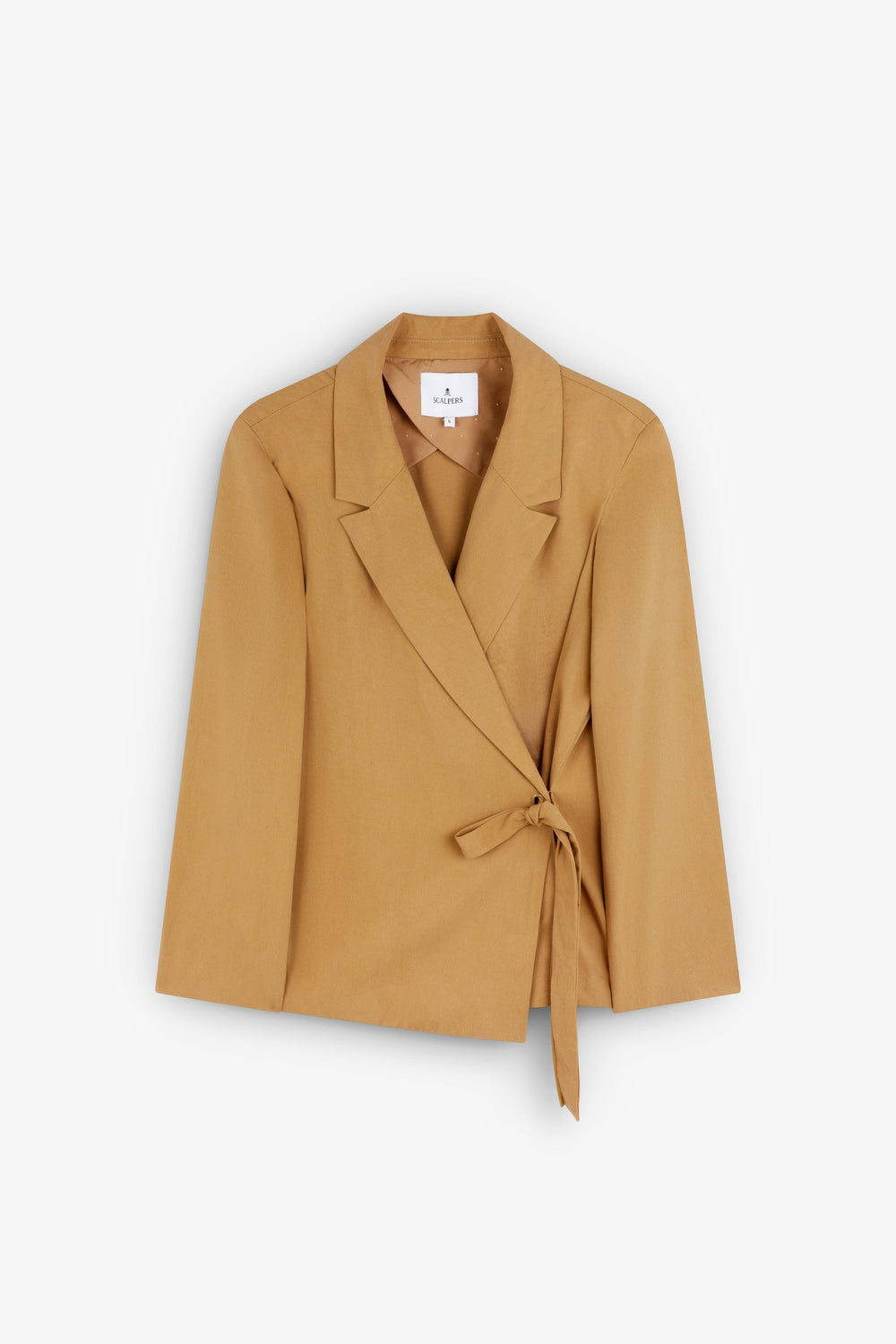 Blazer confeccionada en Algodón. Cierre cruzado. Detalle de nudo en forma de lazo. Cuello solapa. Forro interior. Corte entallado. Esta prenda forma parte de un conjunto.