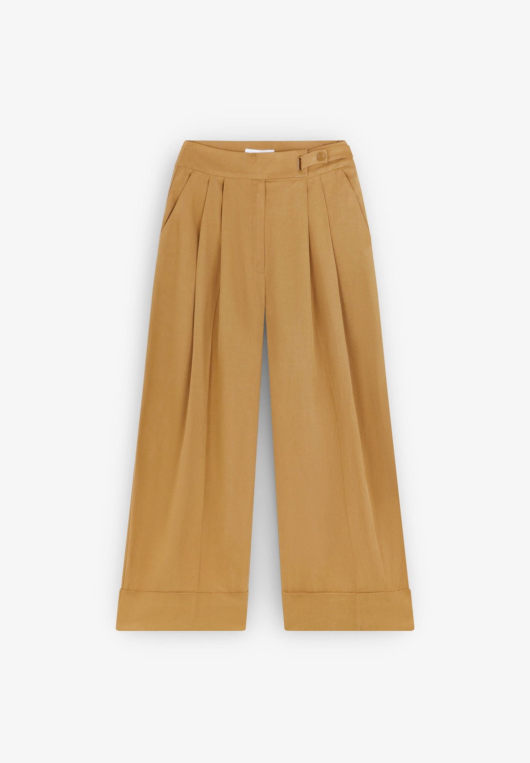 Pantalón confeccionado en Algodón. Presenta un corte amplio y holgado desde la cadera hasta el tobillo. Tiro alto. Cierre mediante botón en cintura. Dos bolsillos laterales. Un bolsillo en parte trasera con cierre por botón. Detalle de doble pinza en frontal. Detalle de bajos doblados.