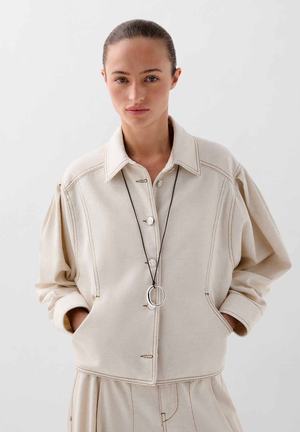 Chaqueta tipo bomber confeccionada con tejido en mezcla de algodón. Consta de cierre por botón en parte delantera. Dos bolsillos laterales. Detalle de costuras a contraste.