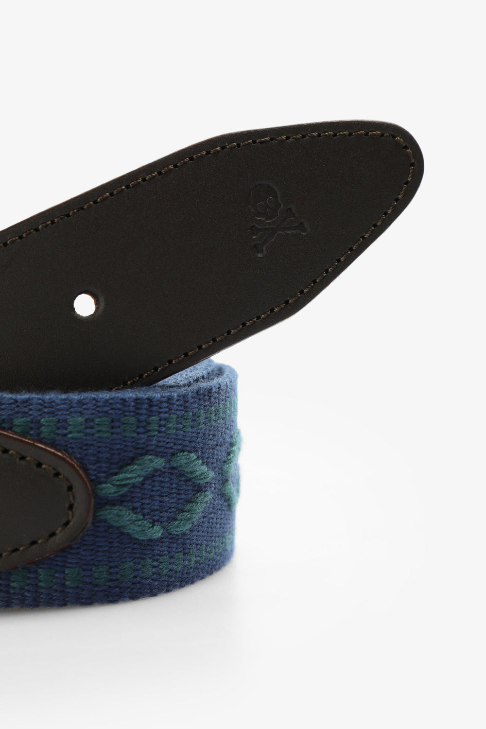 Cinturón con estampado étnico y detalles de piel con cierre de hebilla metálica.