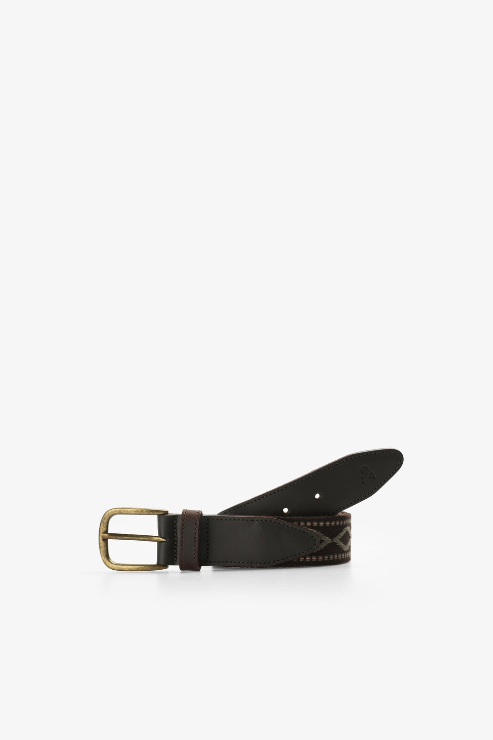 Cinturón con estampado étnico y detalles de piel con cierre de hebilla metálica.