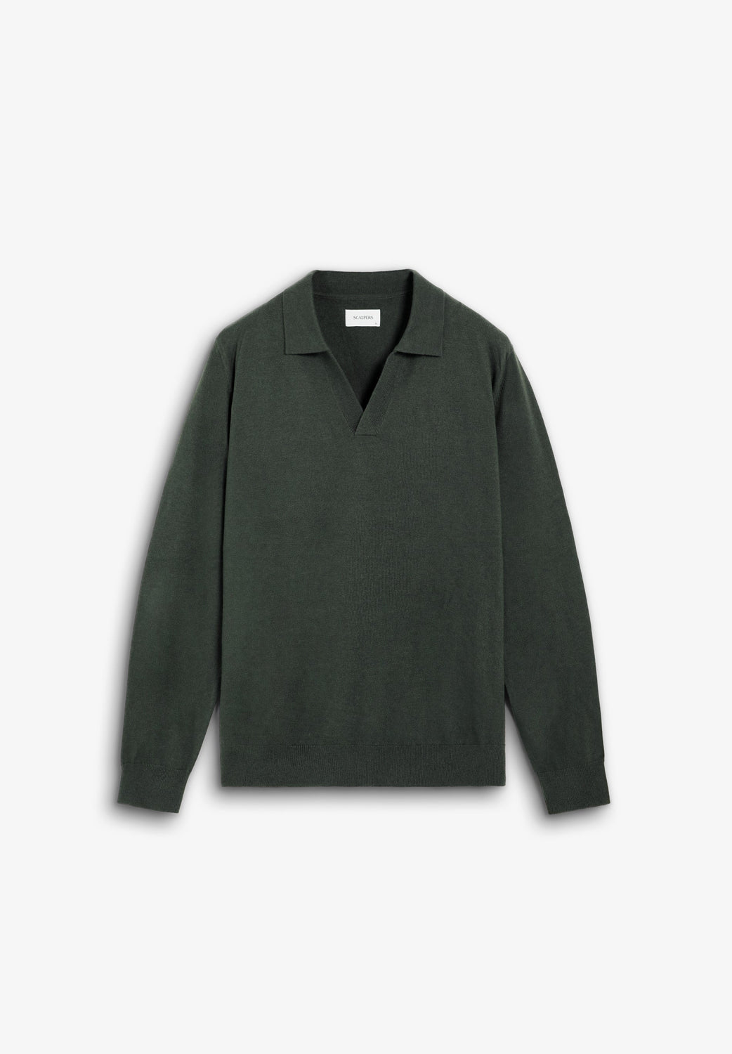 Jersey de punto confeccionado en tejido mezcla lana . Cuello pico tipo polo. Manga larga. Acabados en rib.
