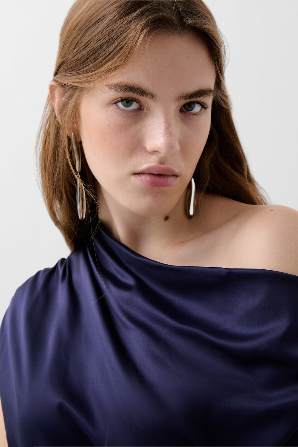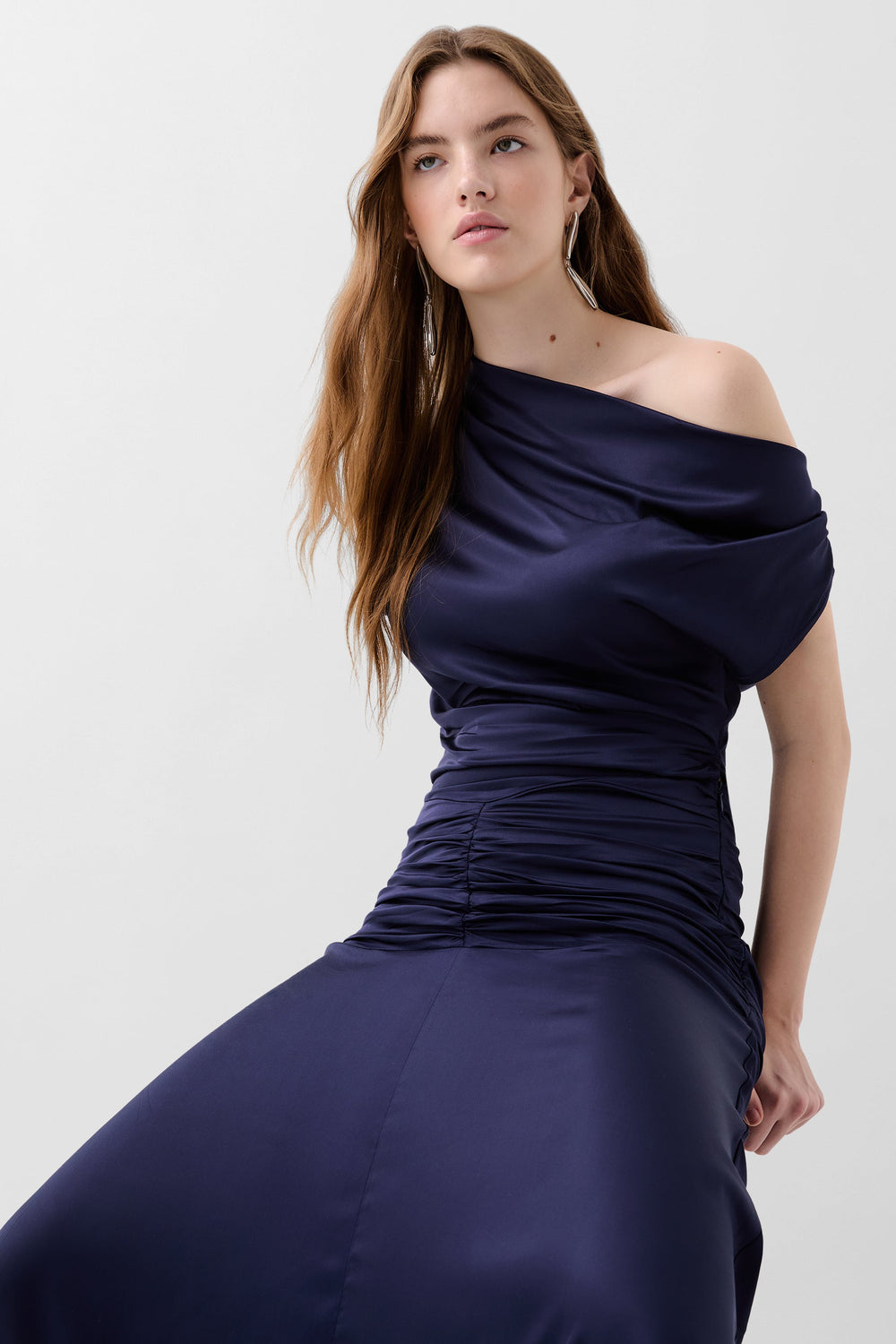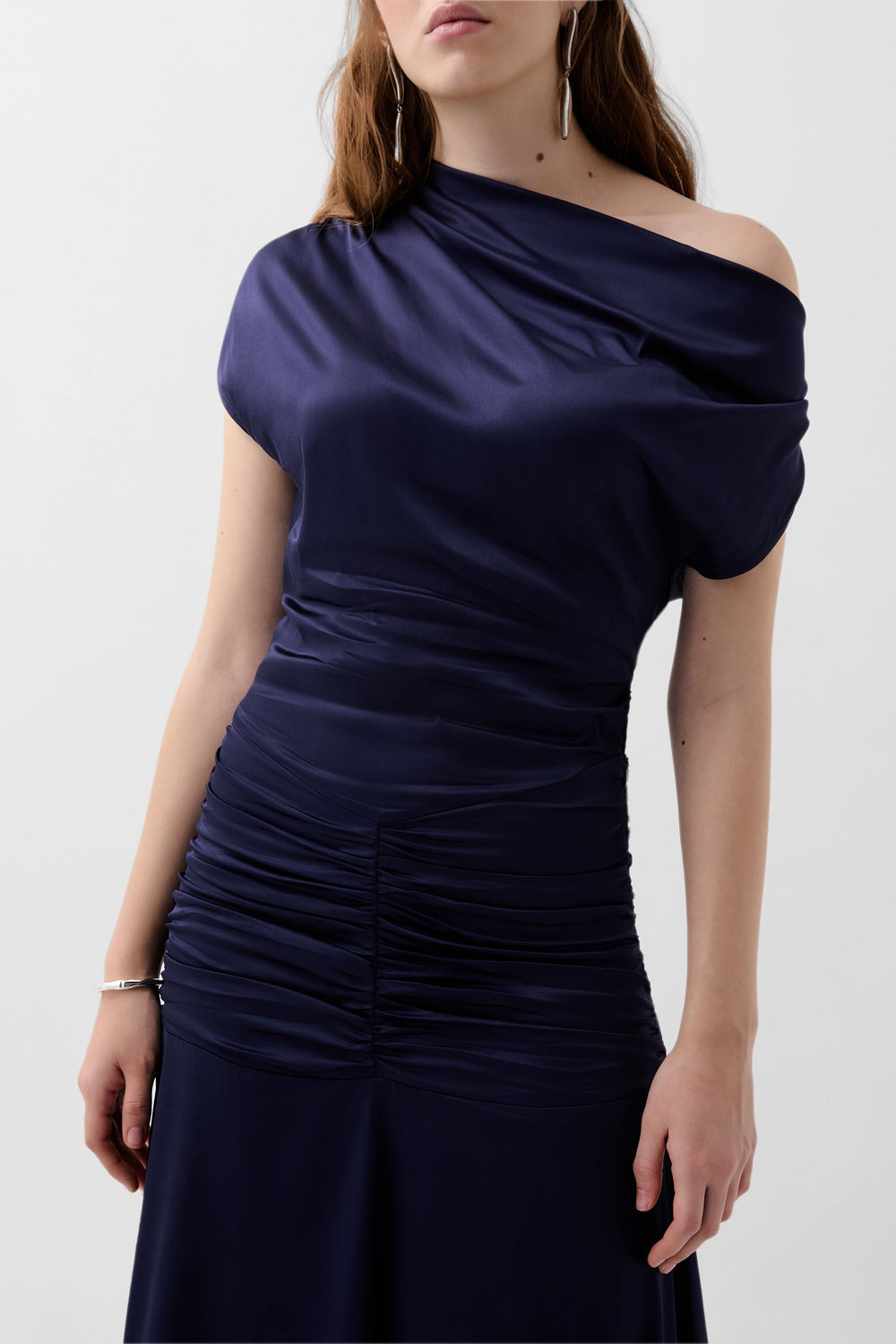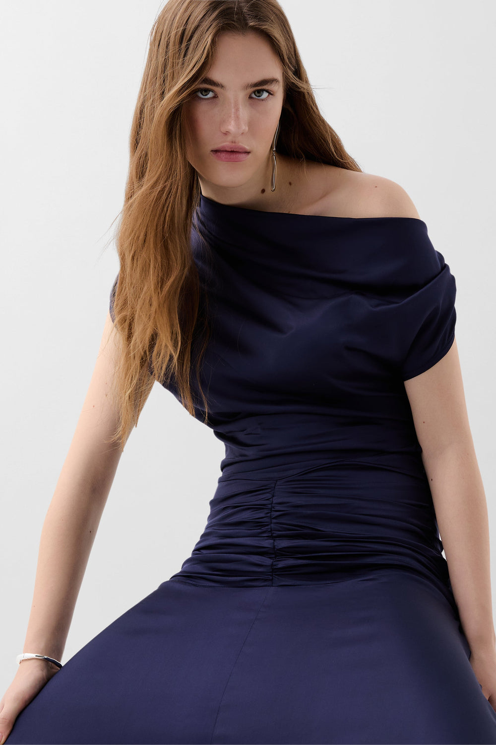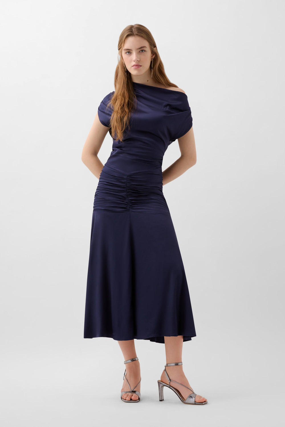 Vestido midi satinado. Confeccionado en tejido fluido. Corte Regular fit. Escote barco con detalle drapeado y frunces en cintura. Manga en sisa. Cierre con cremallera.