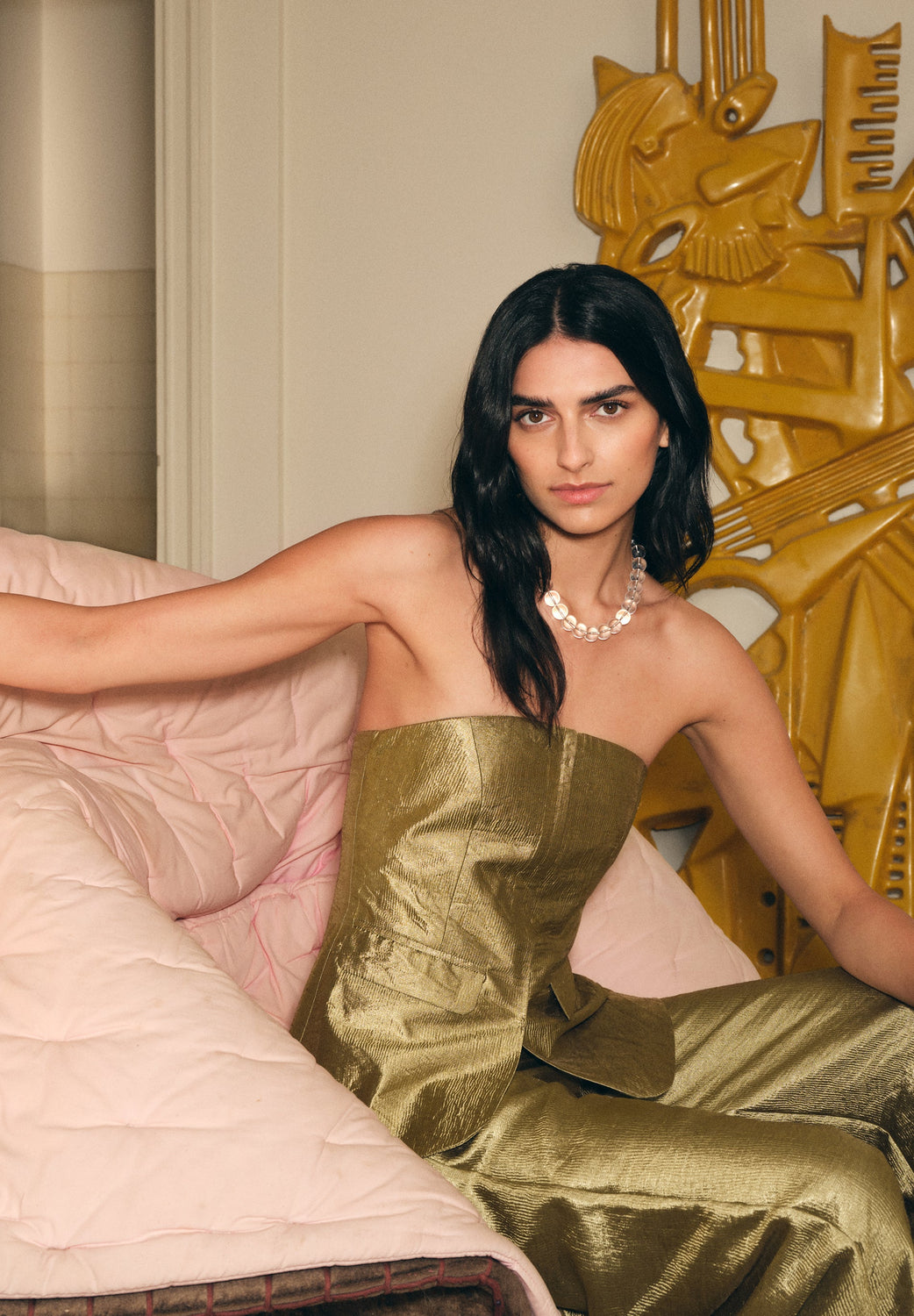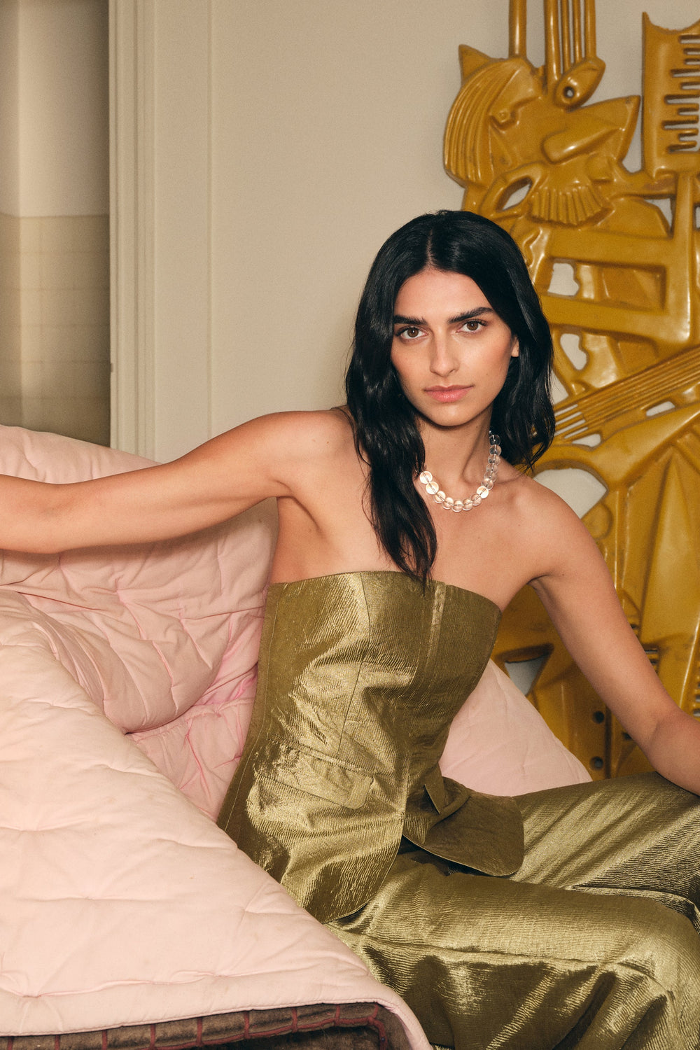 Top confeccionado en tejido metalizado. Escote palabra de honor con banda ajustable trasera. Pinzas frontales, ligeramente peplum y bolsillos con tapeta.