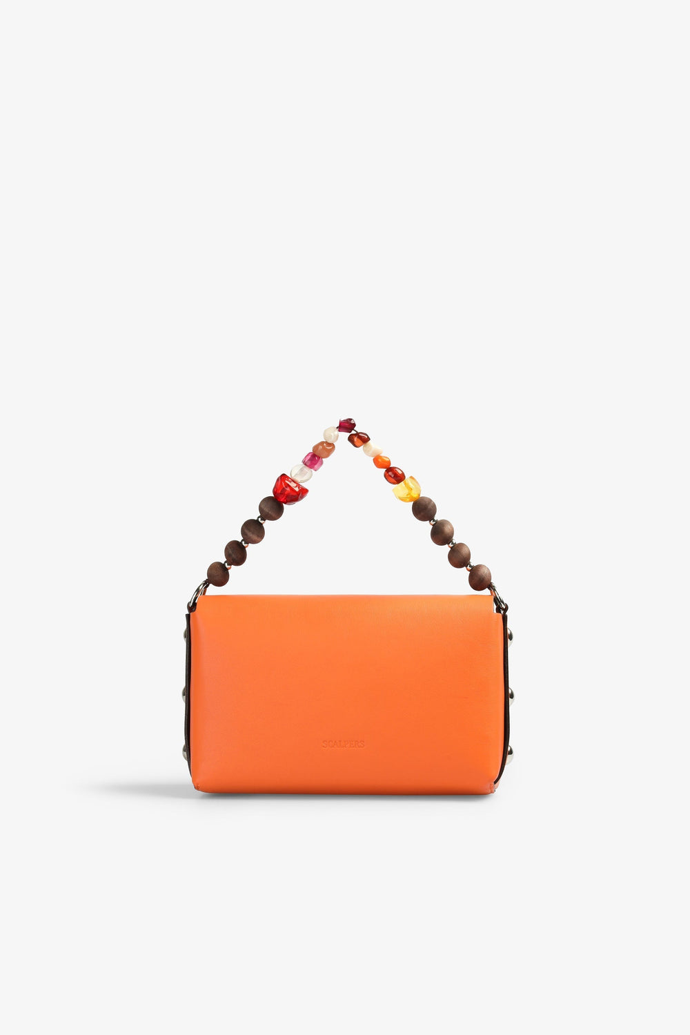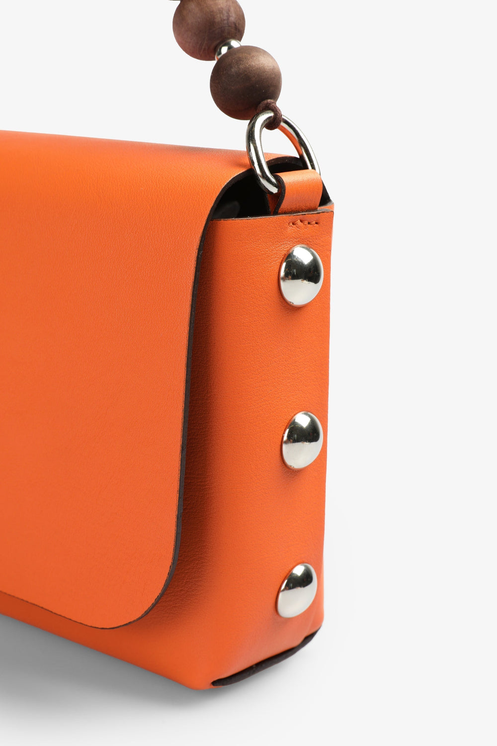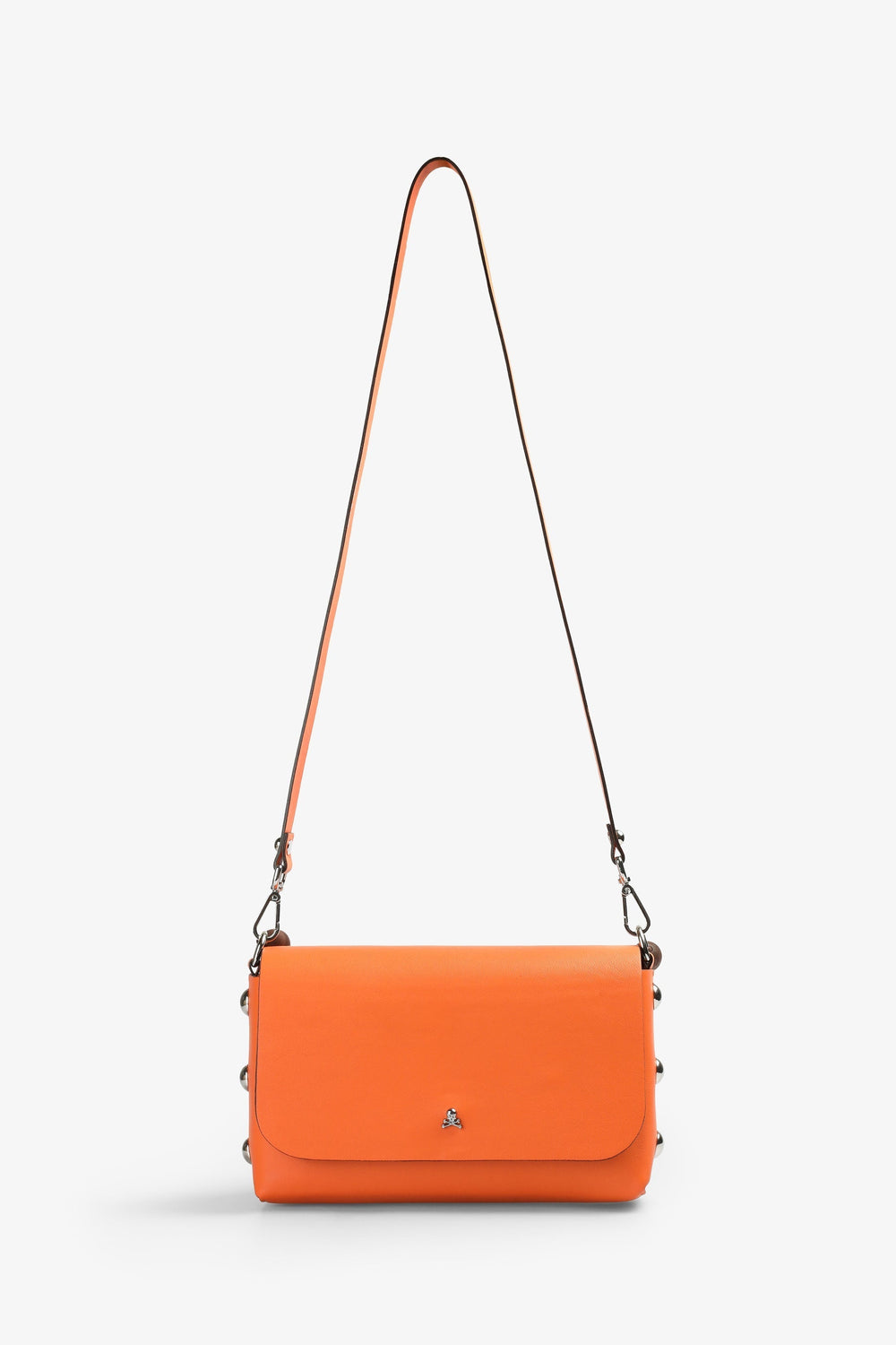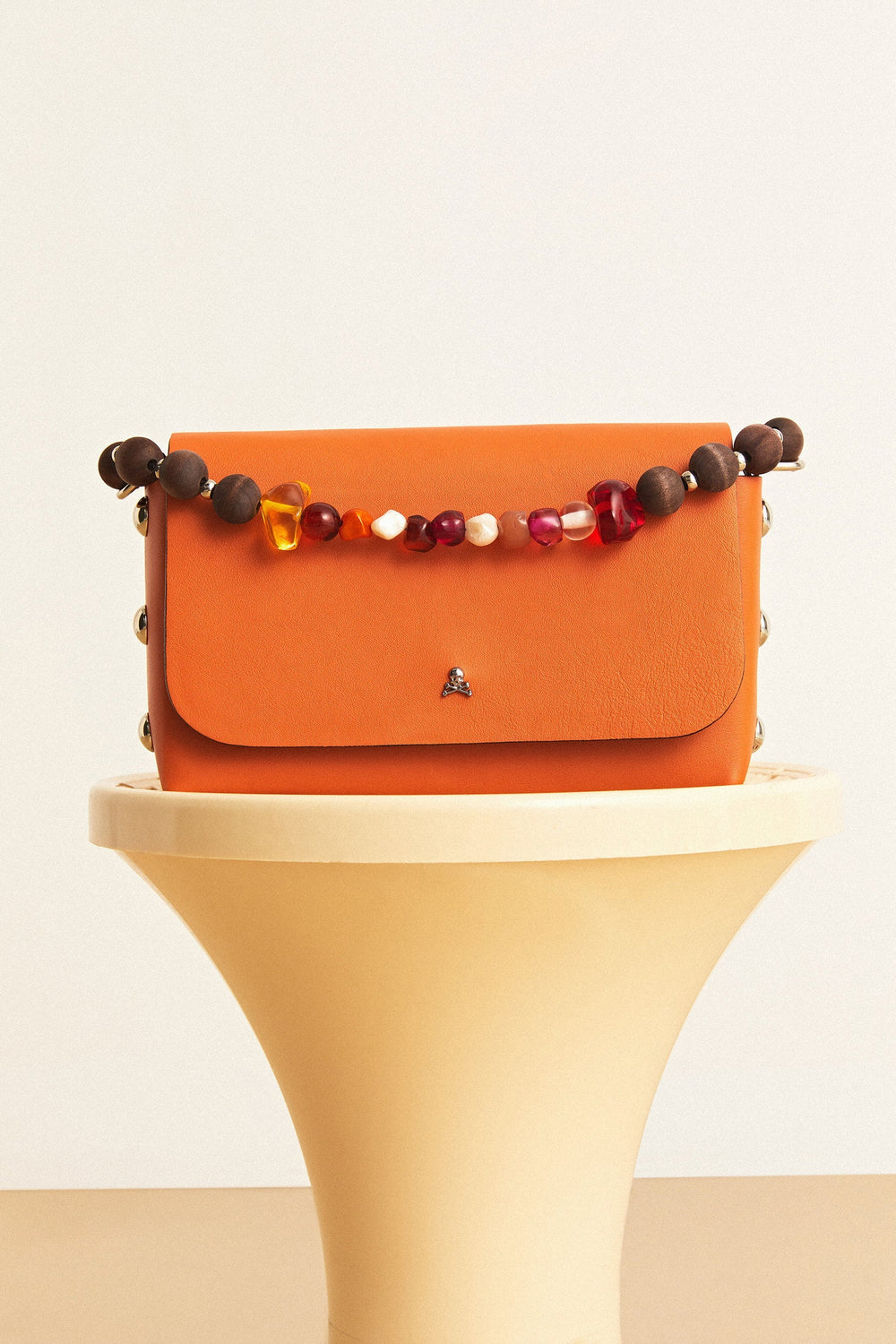 Bolos tamaño pequeño plano. Confeccionado en 100% piel. Cierre con snap. Asa corta con detalle de abalorios y asa larga ajustable. Detalle de calavera en parte delantera.