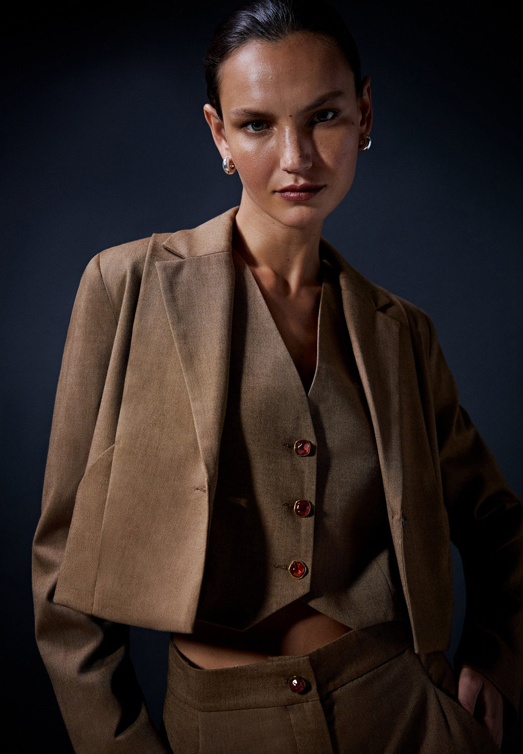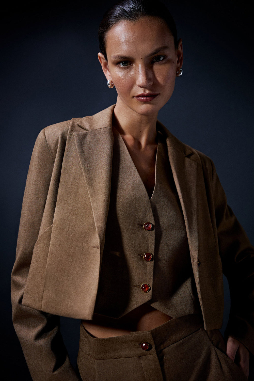 Blazer de corte cropped. Slim fit, cuello con solapas y cierre con botón. Manga larga y detalle de pliegues en delantero.