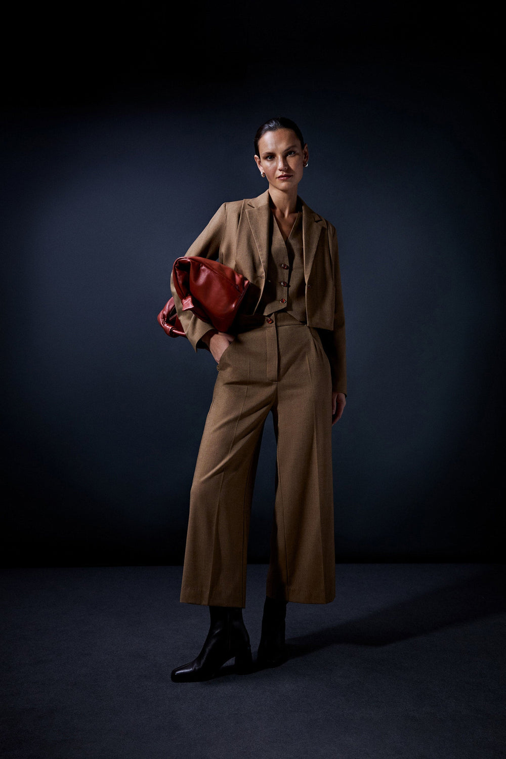 Pantalón de corte culotte con pinzas. Cierre con botón joya y cremallera, bolsillos laterales.
