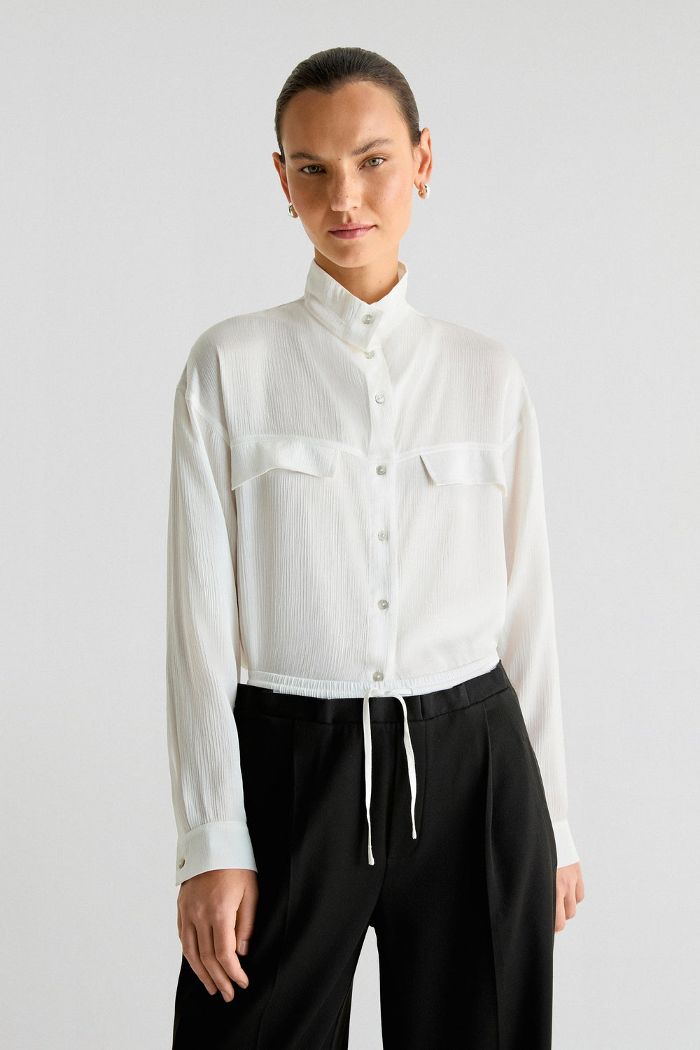 Camisa confeccionada en tejido fluido. Regular fit, cierre con botones y manga larga terminada en puño con botón. Bolsillos en pecho con detalle satinados.