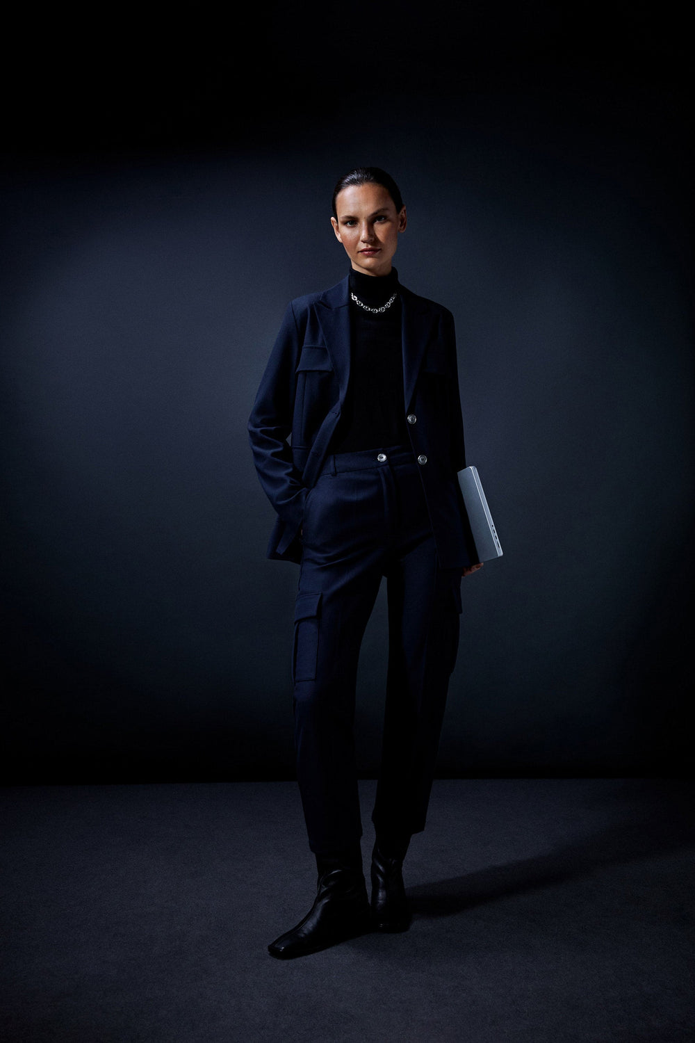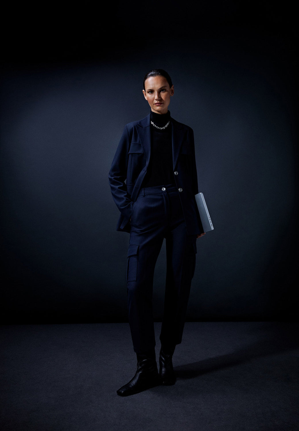 Pantalón confeccionado en tejido fluido. Corte recto cargo, cierre con botón y cremallera. Bolsillos laterales de parche.