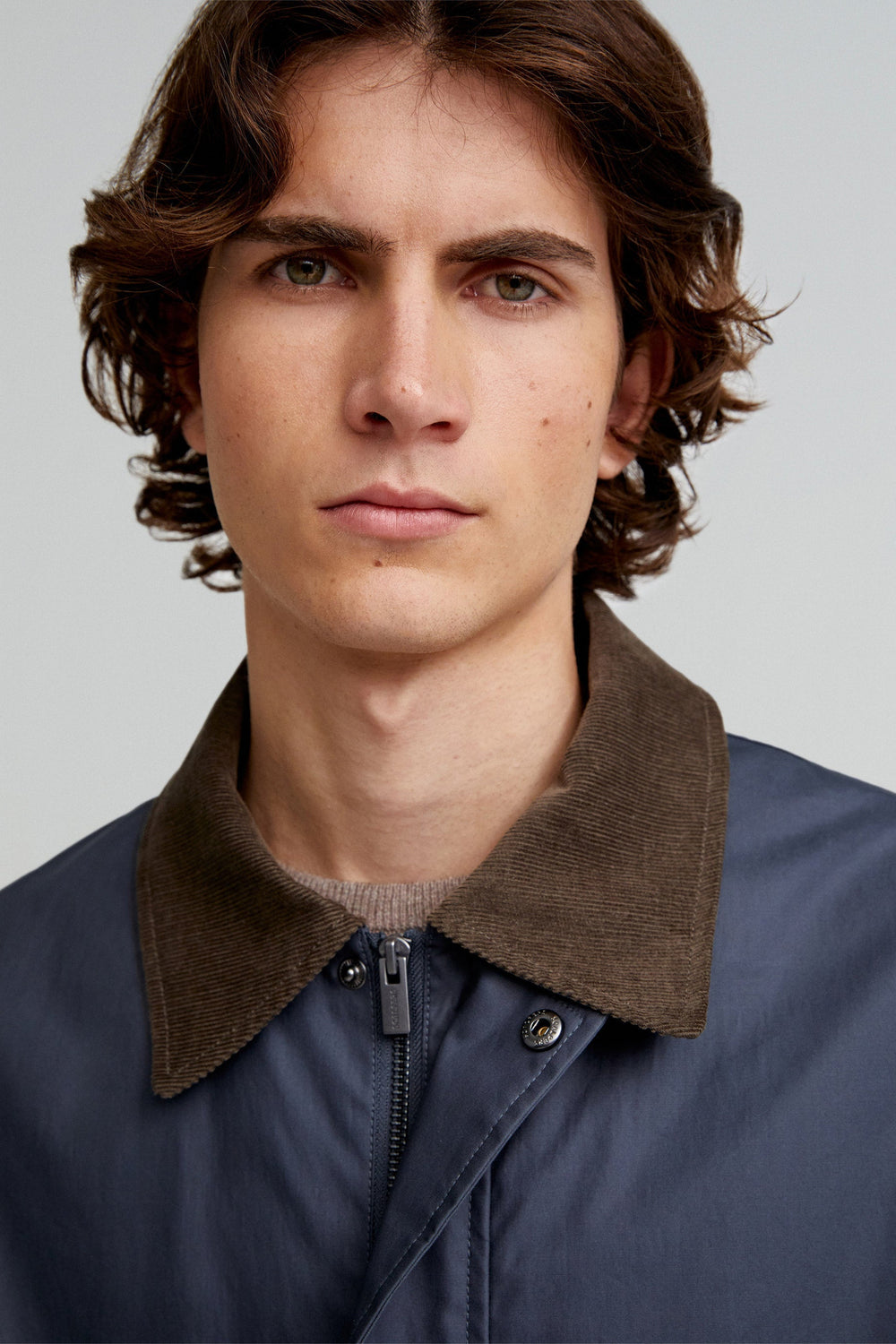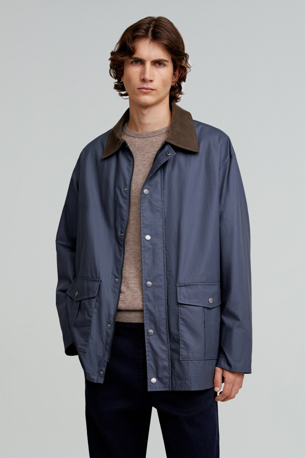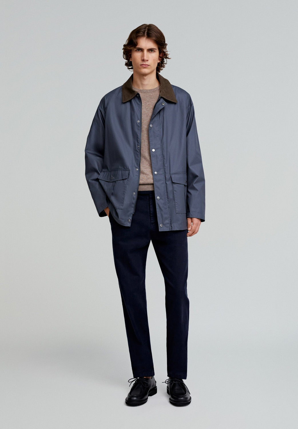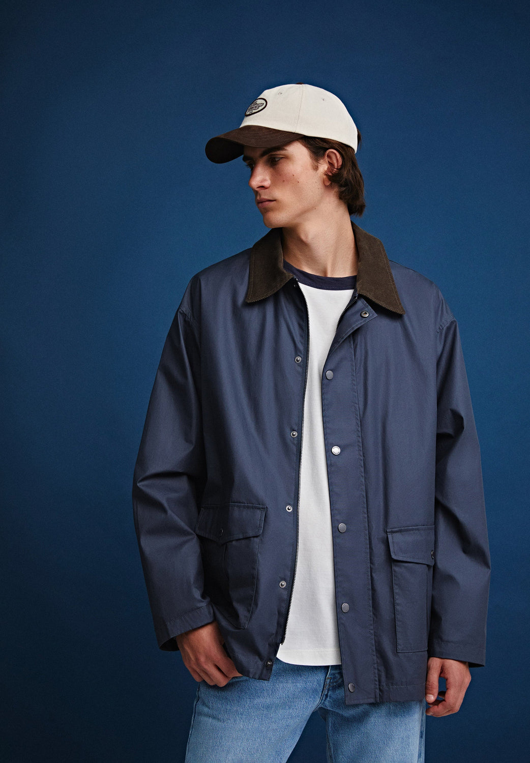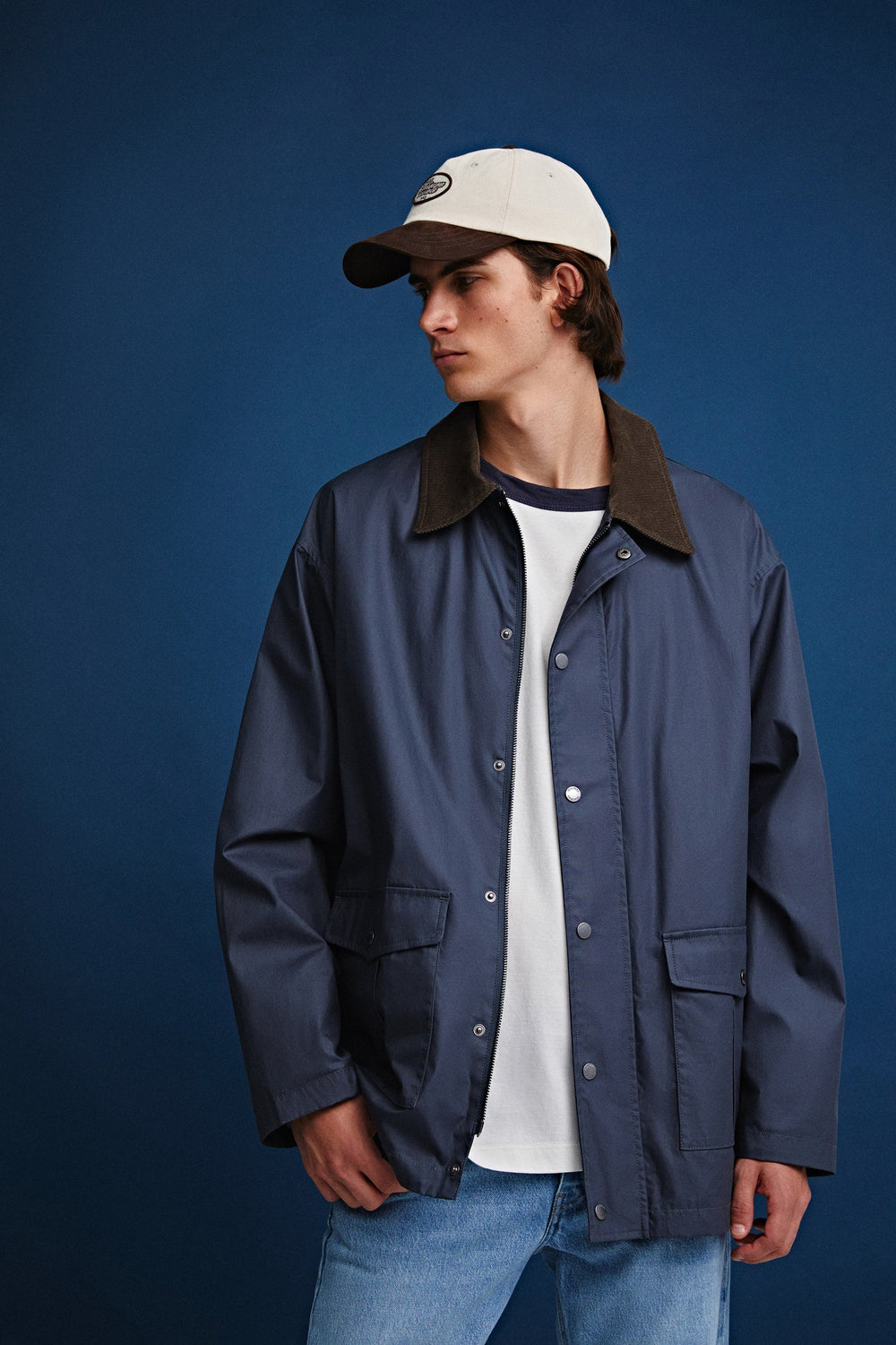 Chaqueta encerada confeccionada en 100% algodón BCI. Regular fit, cuello de pana y cierre con cremallera y snaps con tapeta. Manga larga y bolsillos de parche con snaps.