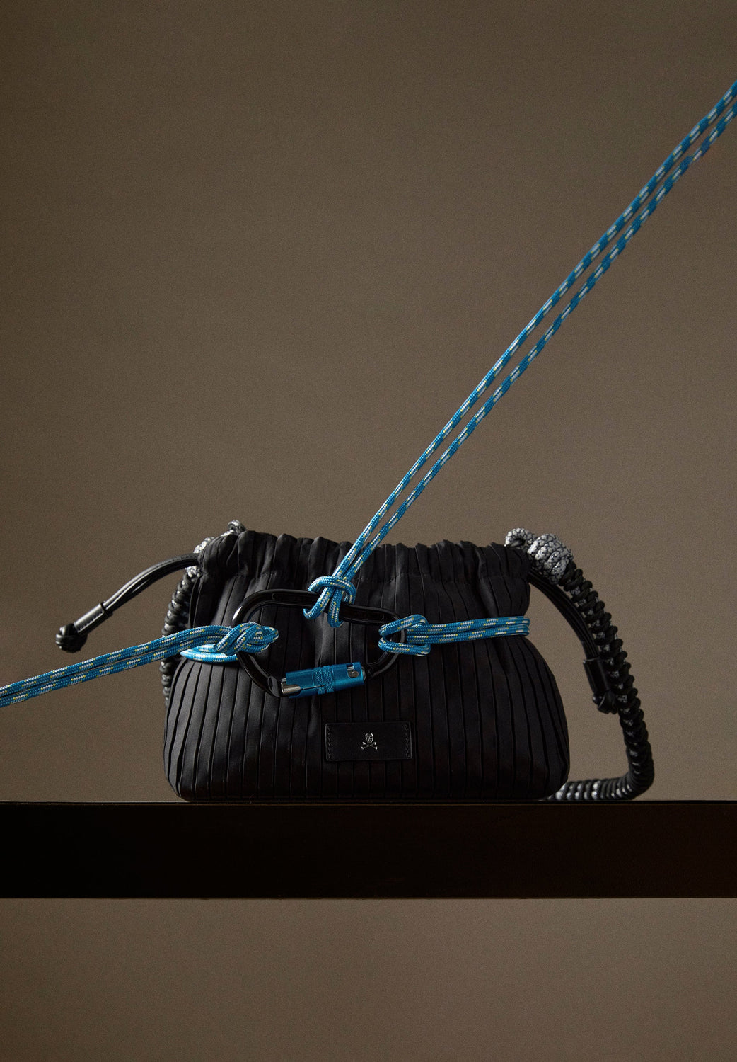 Bolso plisado confeccionado en tejido sintético con parche frontal con logo. Cierre con tiradores ajustables laterales. Forro interior y bolsillo con cremallera. Asa larga trenzada con detalles metalizados.